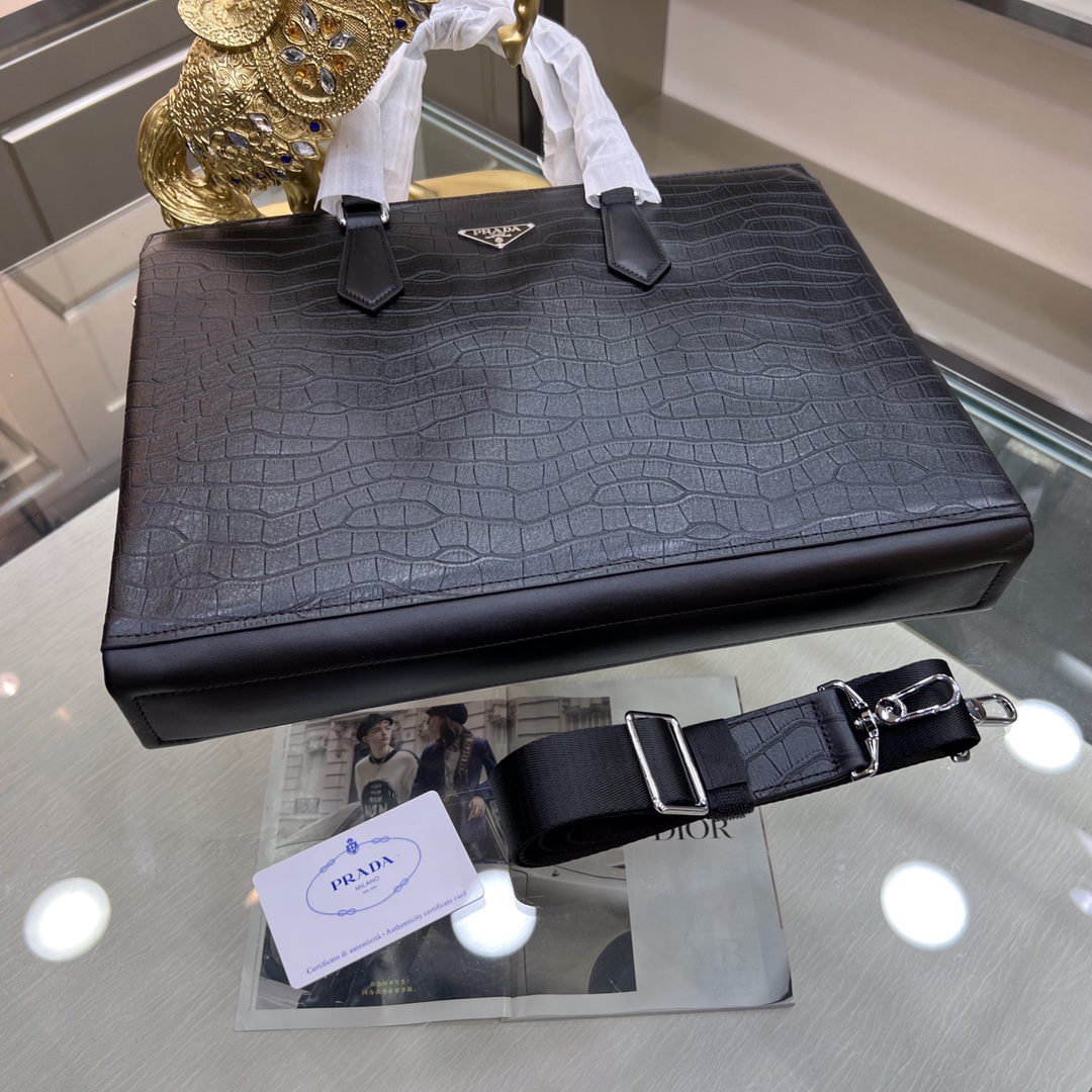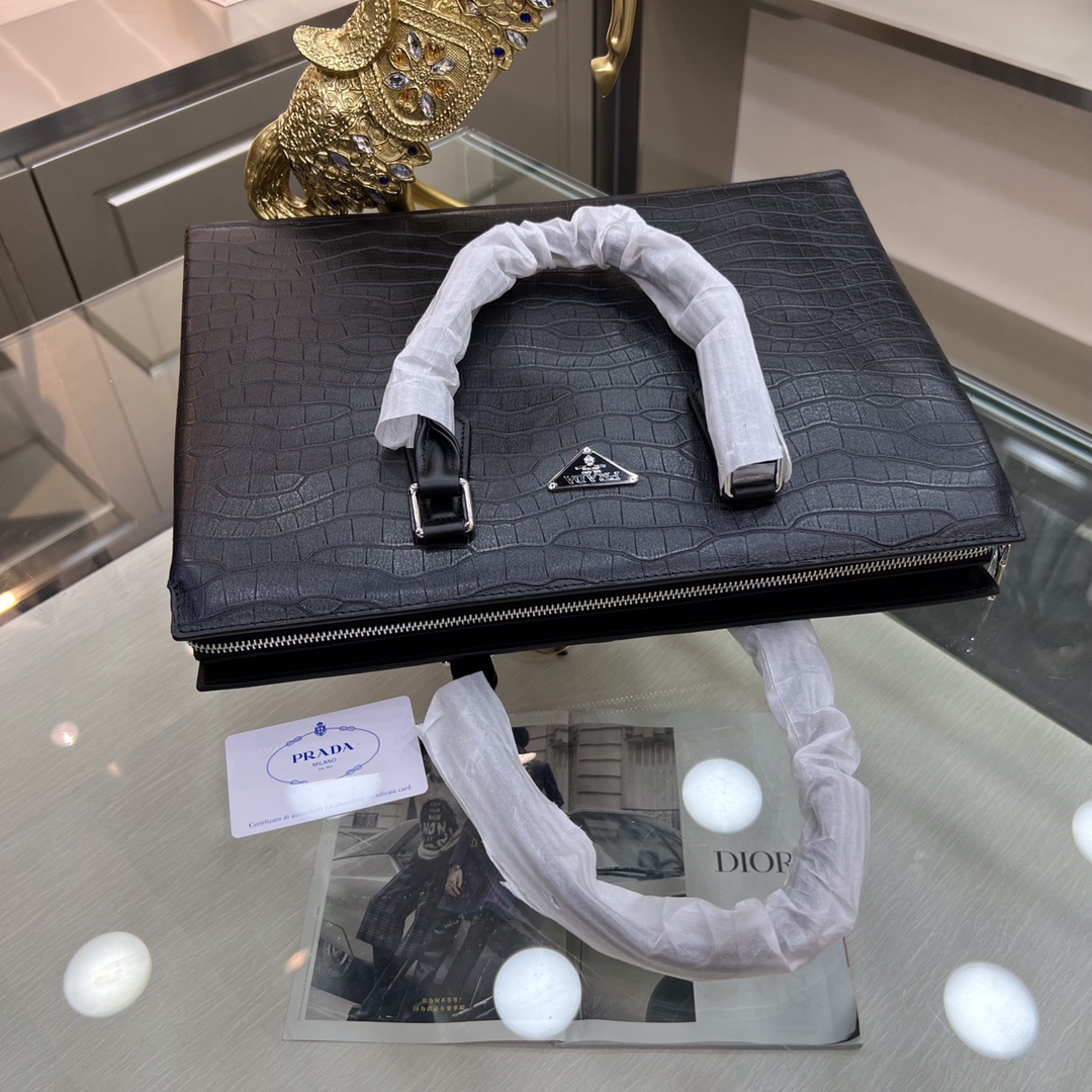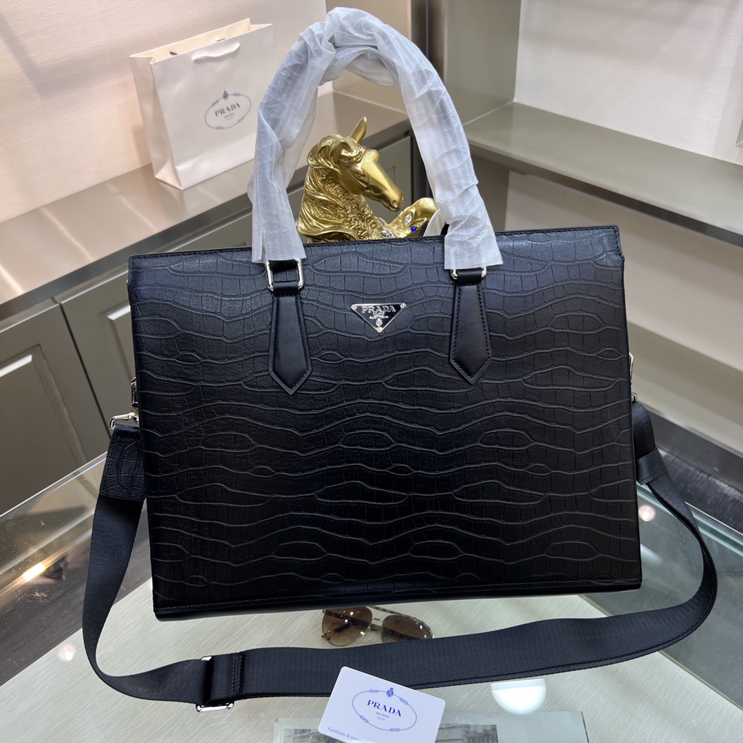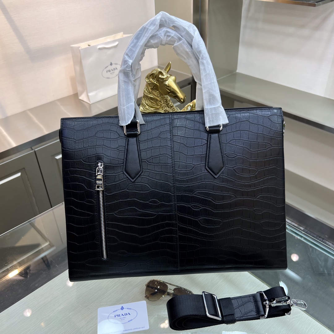 。PRADA普拉达 新款公文包 采用进口鳄鱼纹牛皮制作,顶级抛光不锈钢饰面金属配件 ,正面外部三角形珐琅徽标,内里双隔层,简单大方商务 成功男士们的最爱 ! 尺寸:40-30-7 型号:601312-1