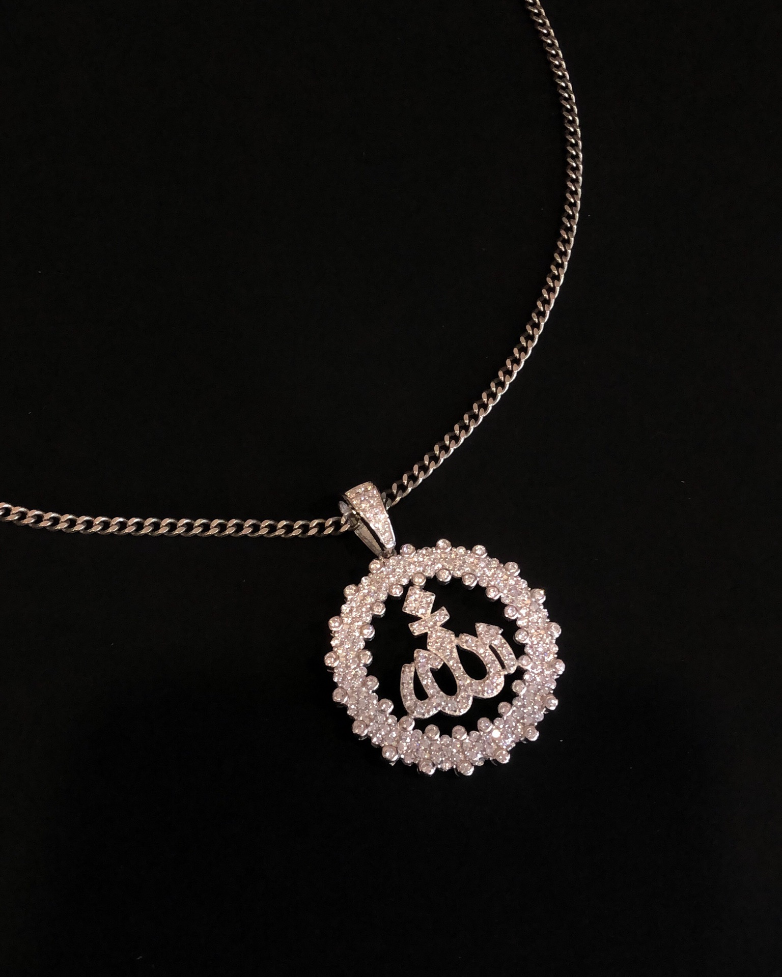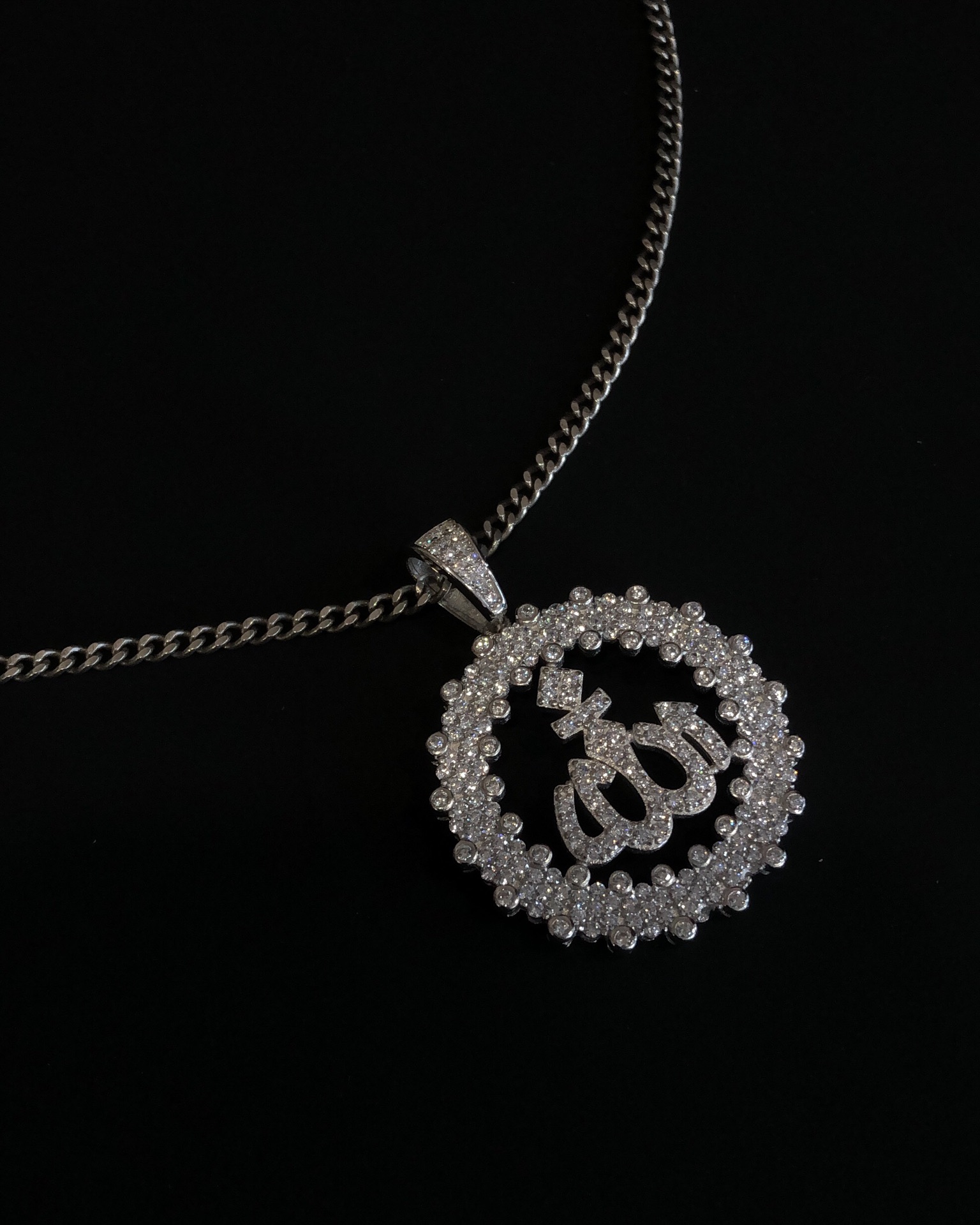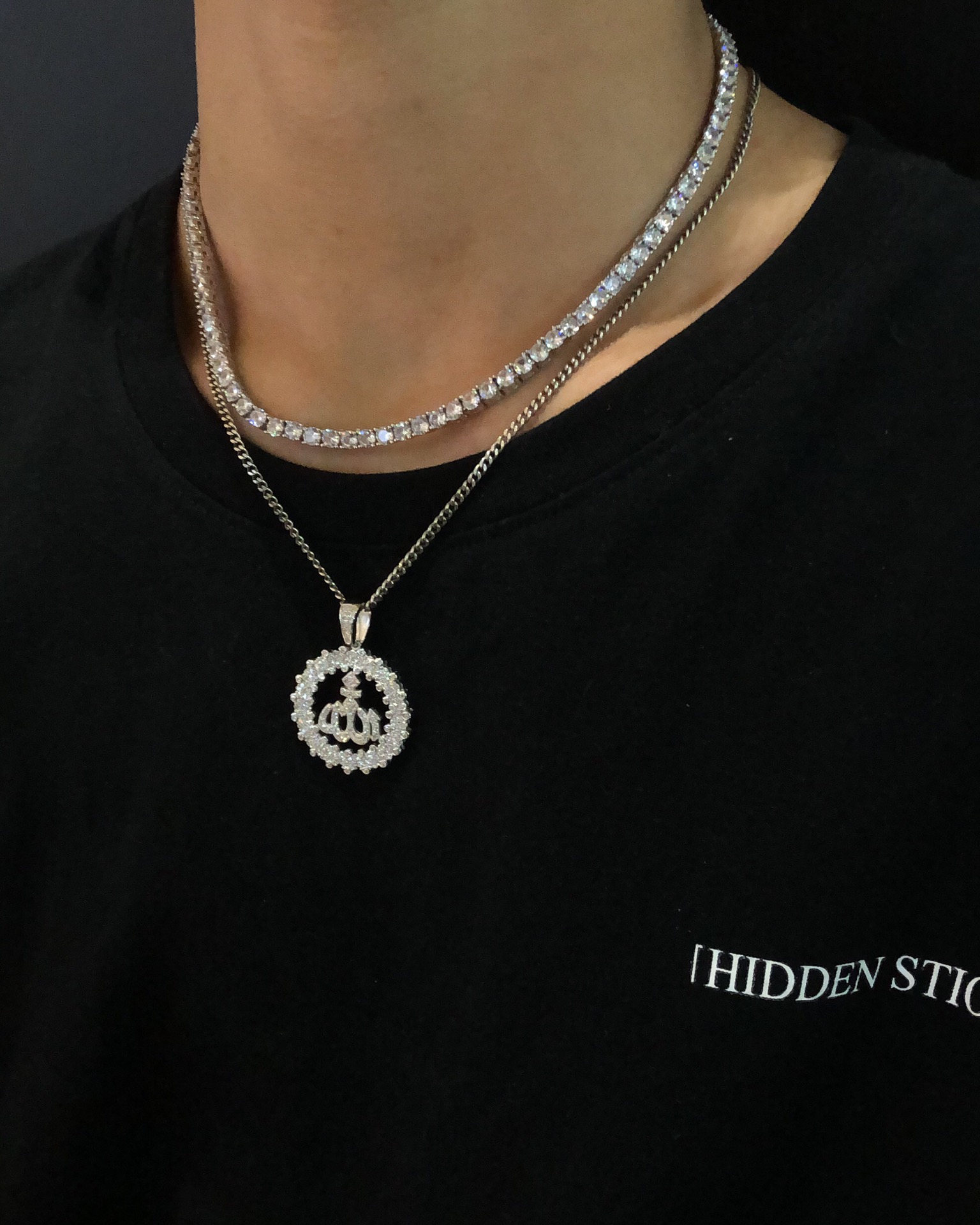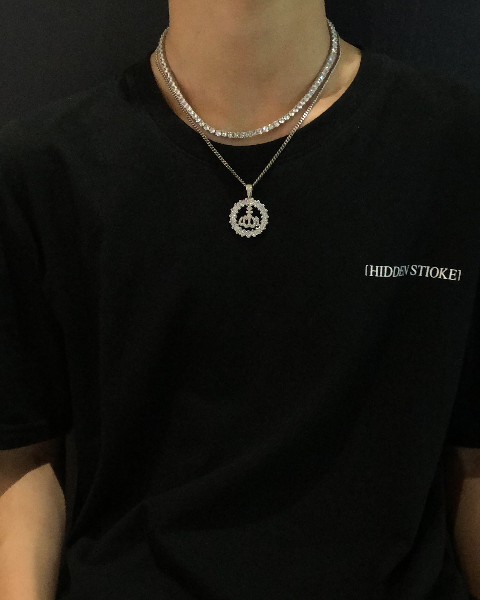 【银镶石系列】素银925满钻嘻哈圆牌项链