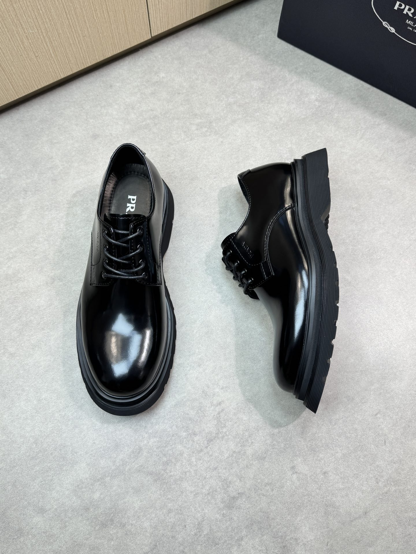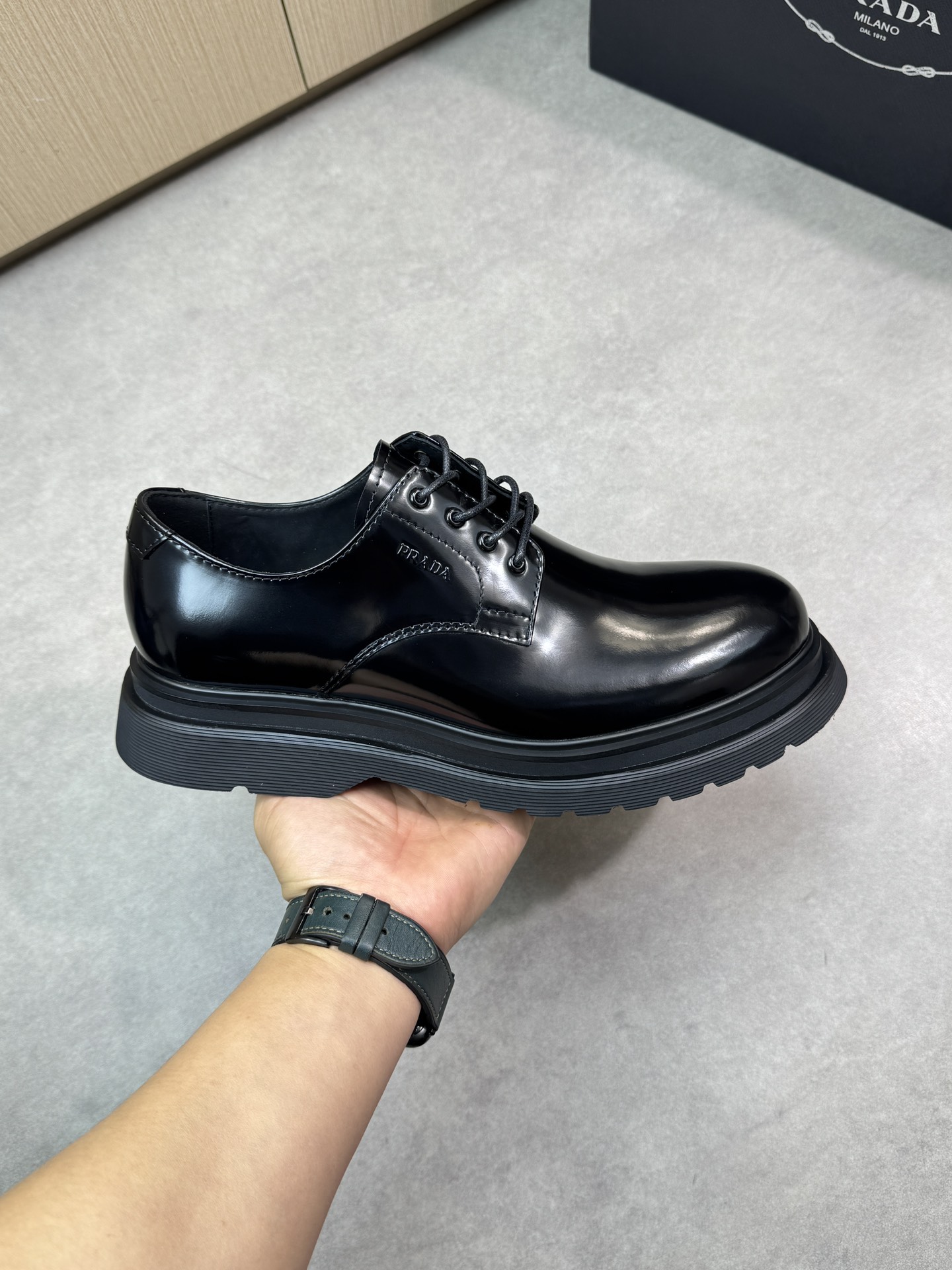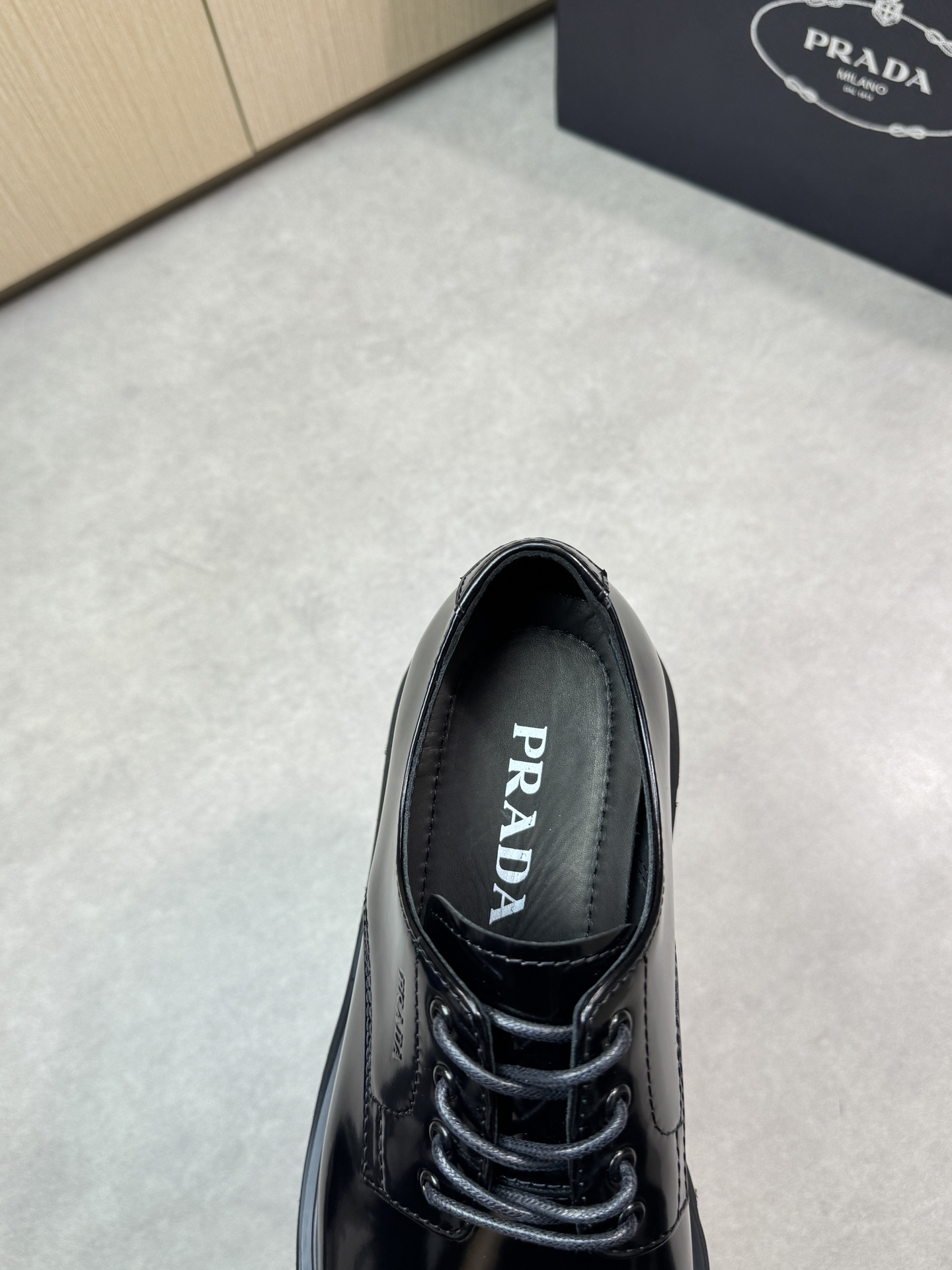 【PRADA】普拉达 -高端品质 原单 正装皮鞋 -鞋面: 开边珠小牛皮、鞋身空压品牌logo:完美拼接 -内里:水染牛皮 -大底:超轻TPU发泡;成型大底 -超高品控·做工精细:凸显(高端·贵气·档次) -Size :39-44(38,45,46,可订做)·PR0187
