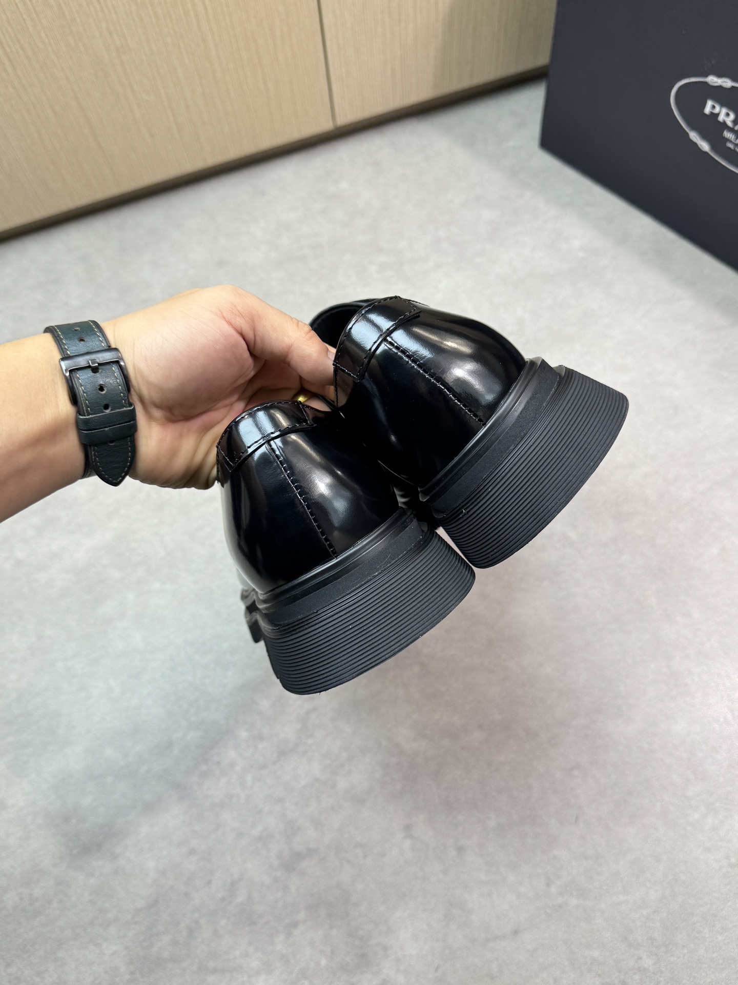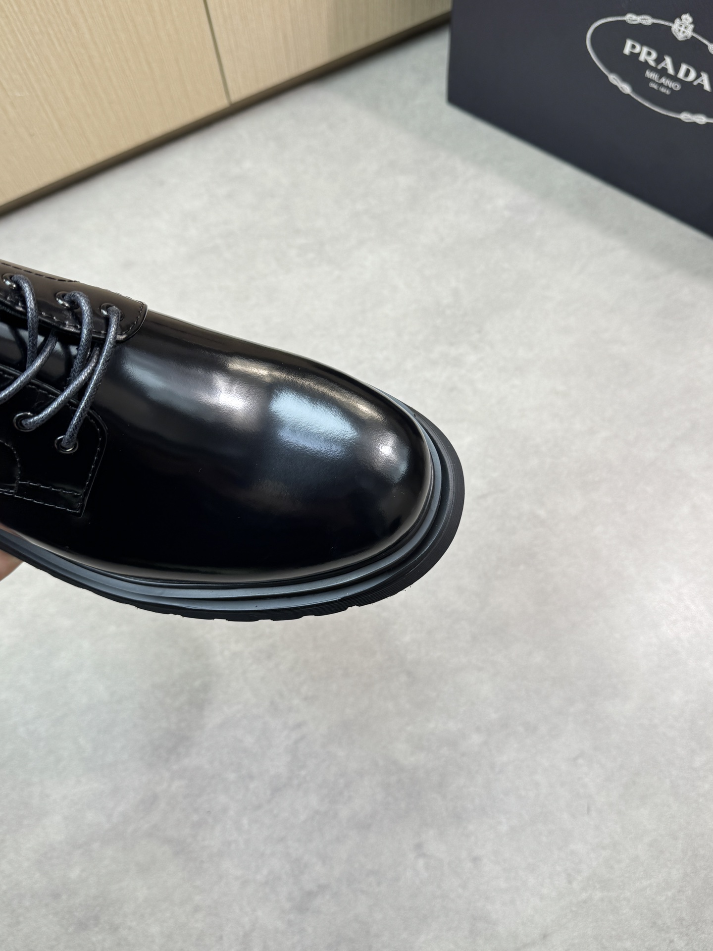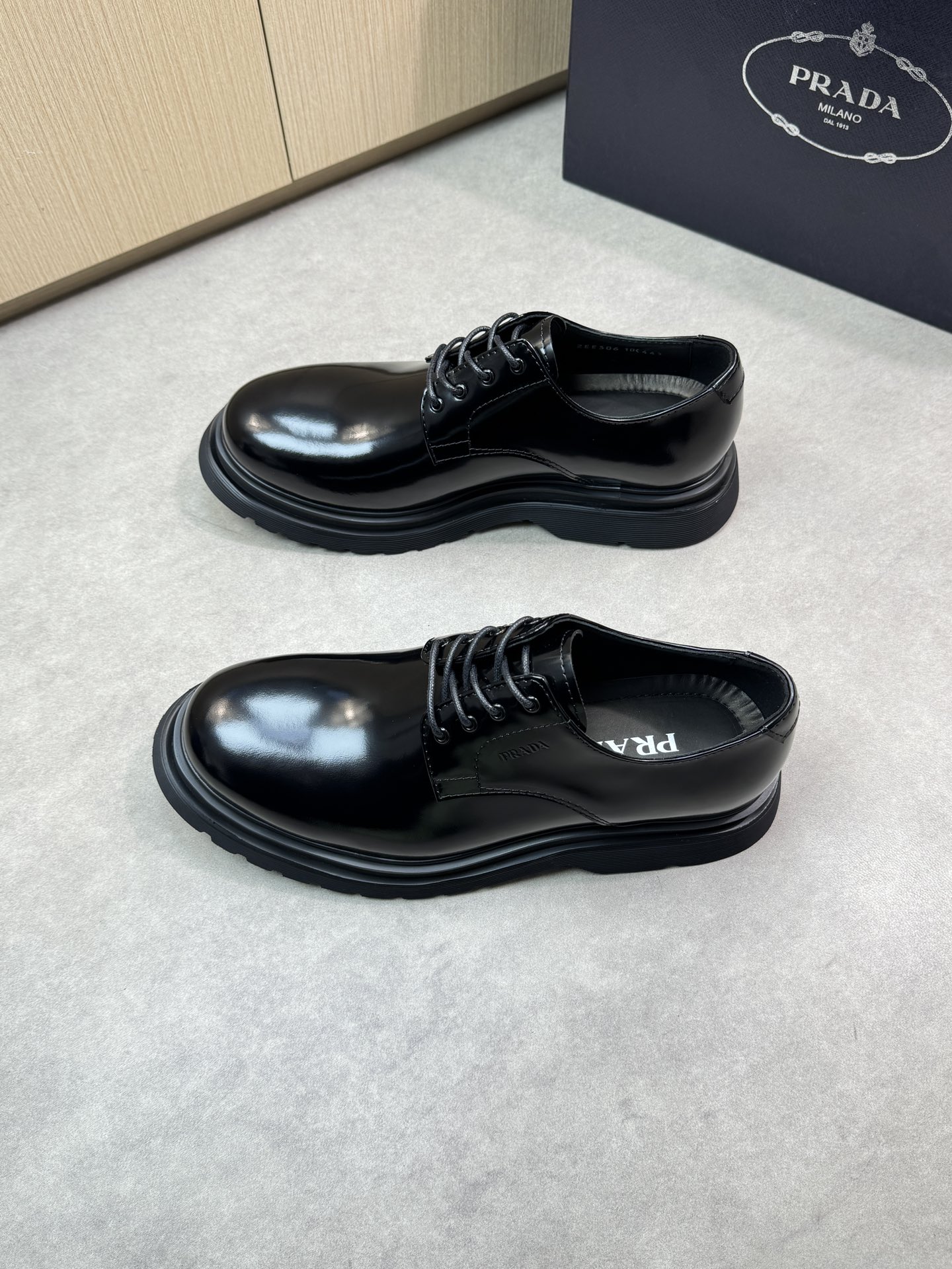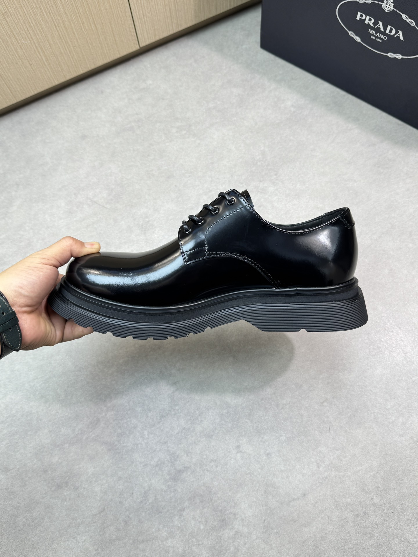 【PRADA】普拉达 -高端品质 原单 正装皮鞋 -鞋面: 开边珠小牛皮、鞋身空压品牌logo:完美拼接 -内里:水染牛皮 -大底:超轻TPU发泡;成型大底 -超高品控·做工精细:凸显(高端·贵气·档次) -Size :39-44(38,45,46,可订做)·PR0187