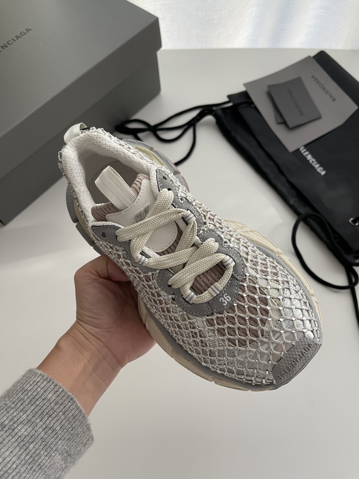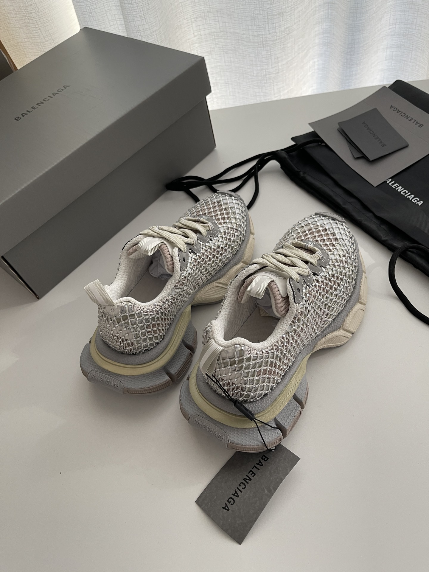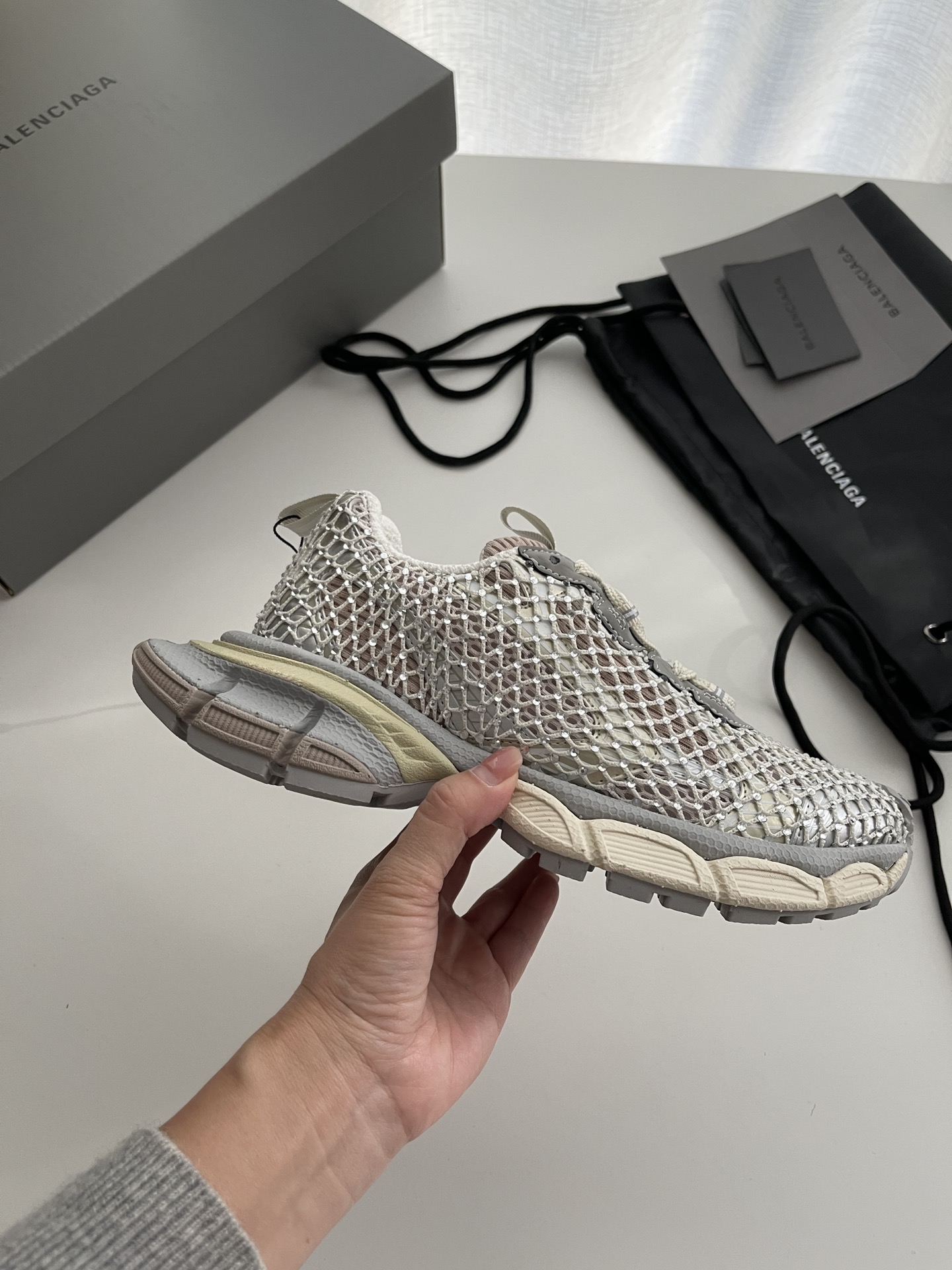 Balenciaga 3XL Sneaker 整体鞋型汲取了Balenciaga Track和Balenciaga Runner两款鞋型的创作思路 相当于把 Track鞋身的外框拆了下来 同时继承了 Runner的流线造型和 Track扁平的鞋头。在鞋面前段另加了一副绑着的的鞋带 用作凹造型。