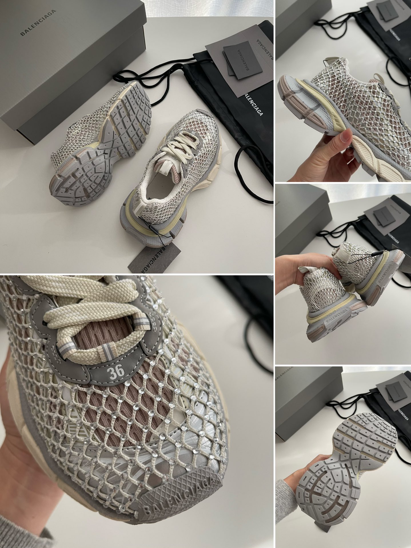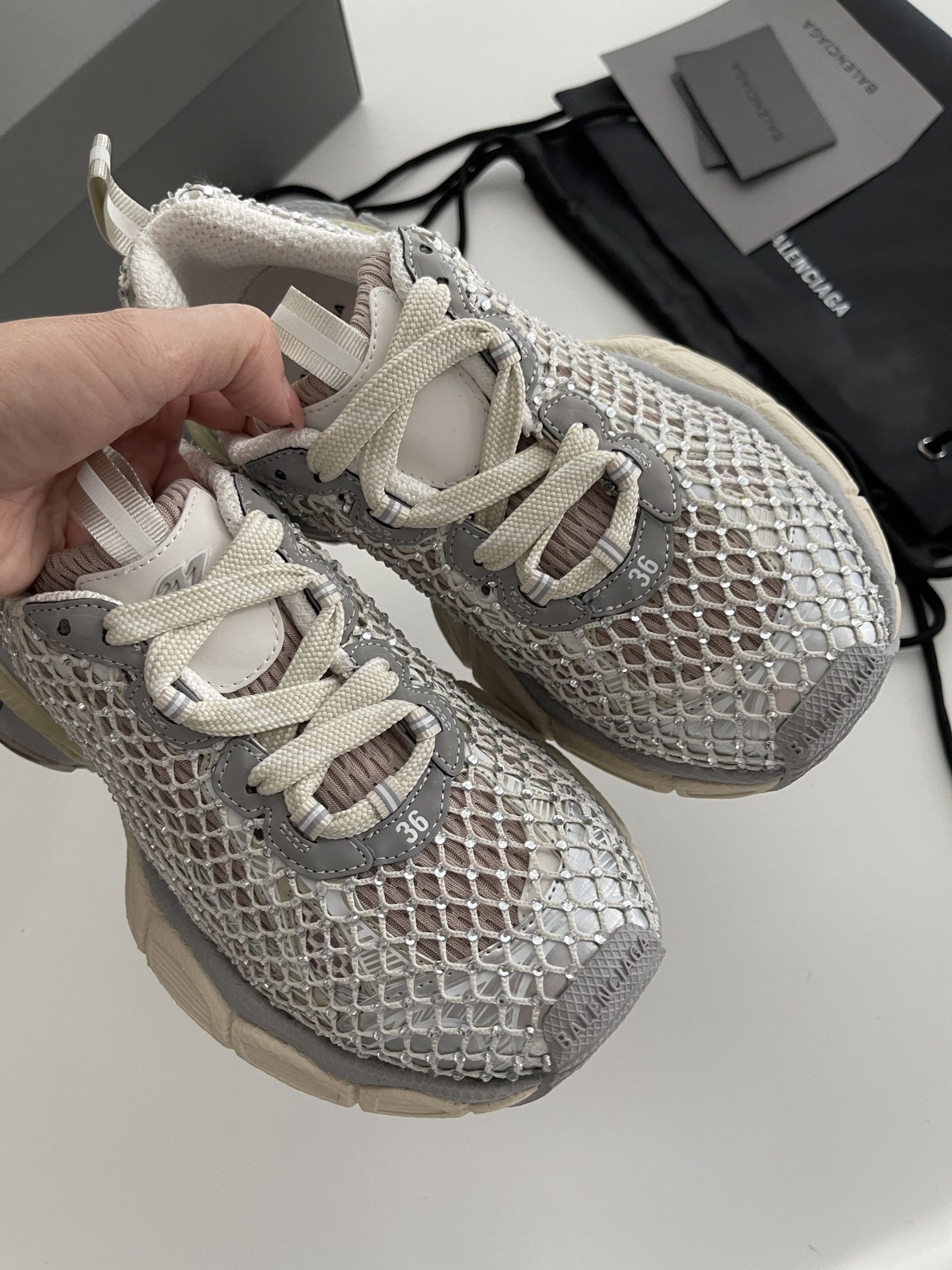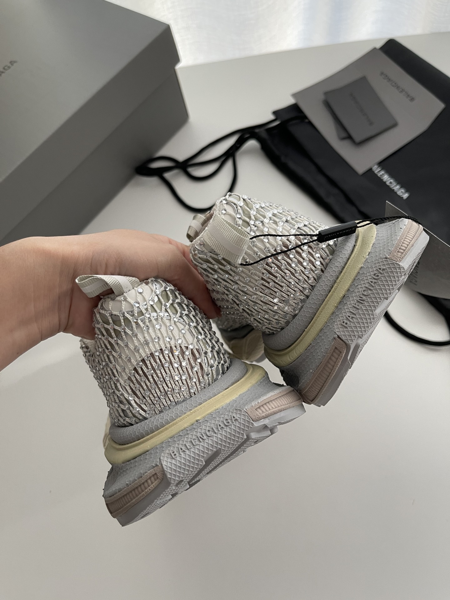 Balenciaga 3XL Sneaker 整体鞋型汲取了Balenciaga Track和Balenciaga Runner两款鞋型的创作思路 相当于把 Track鞋身的外框拆了下来 同时继承了 Runner的流线造型和 Track扁平的鞋头。在鞋面前段另加了一副绑着的的鞋带 用作凹造型。