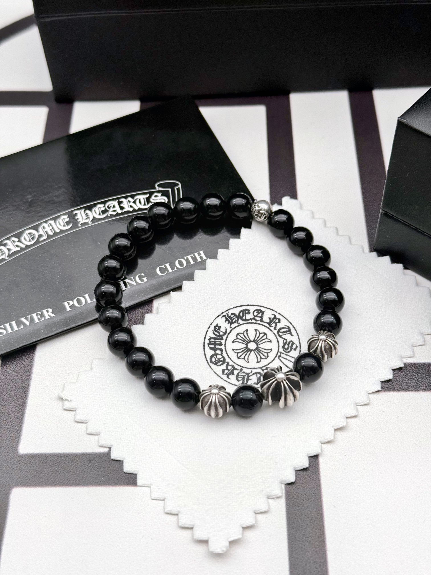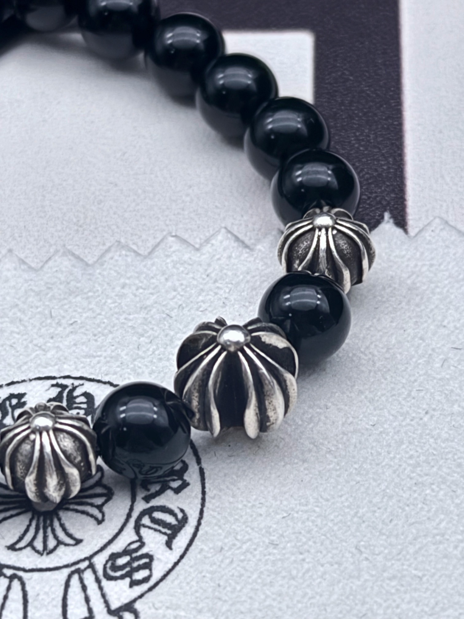 克罗心Chrome Hearts三个Ch+珠饰8mm黑曜石珠黑曜石手串
