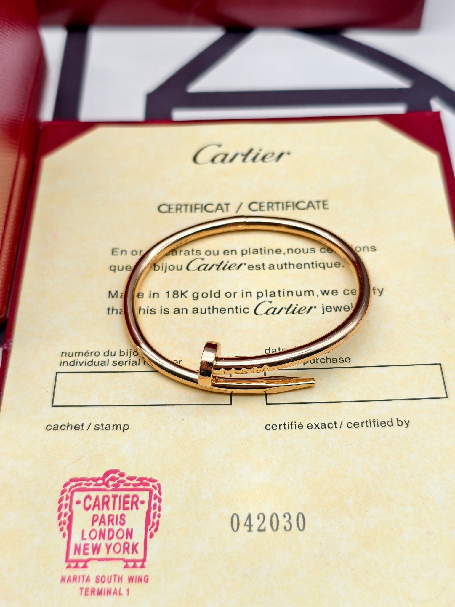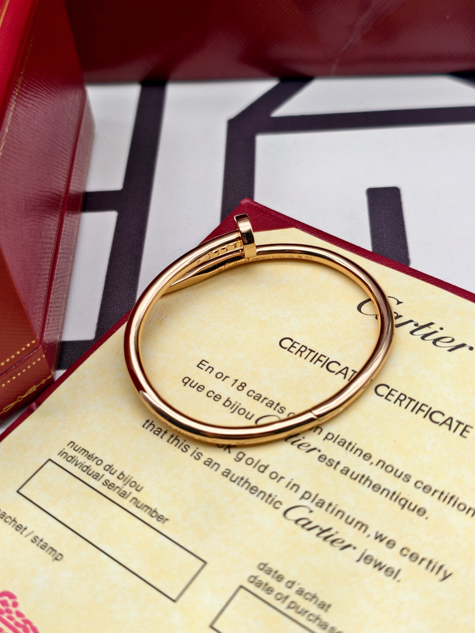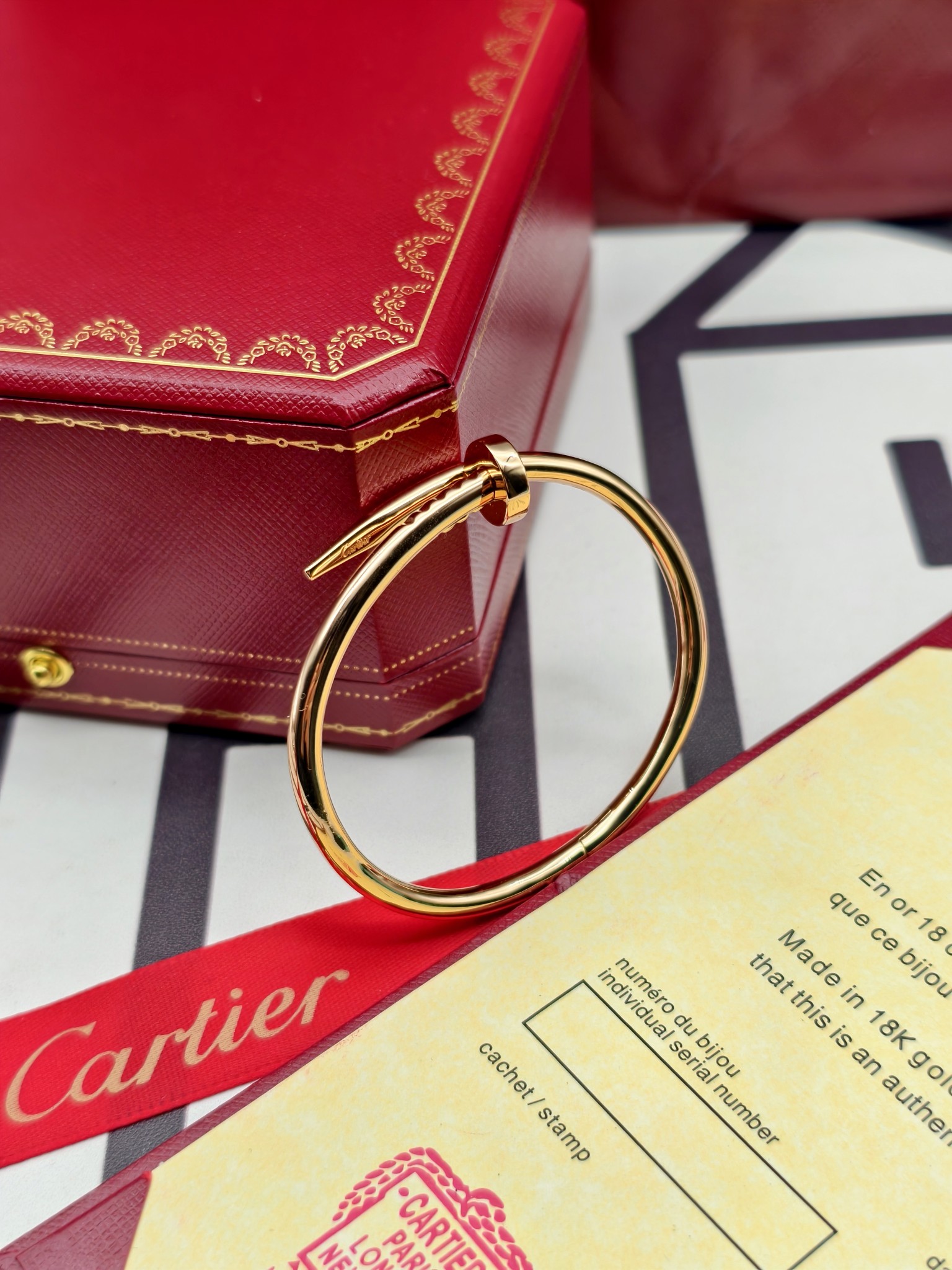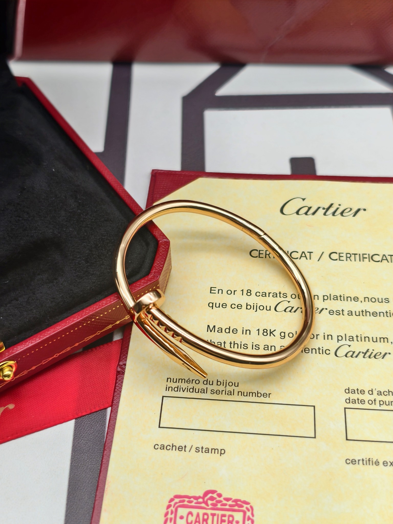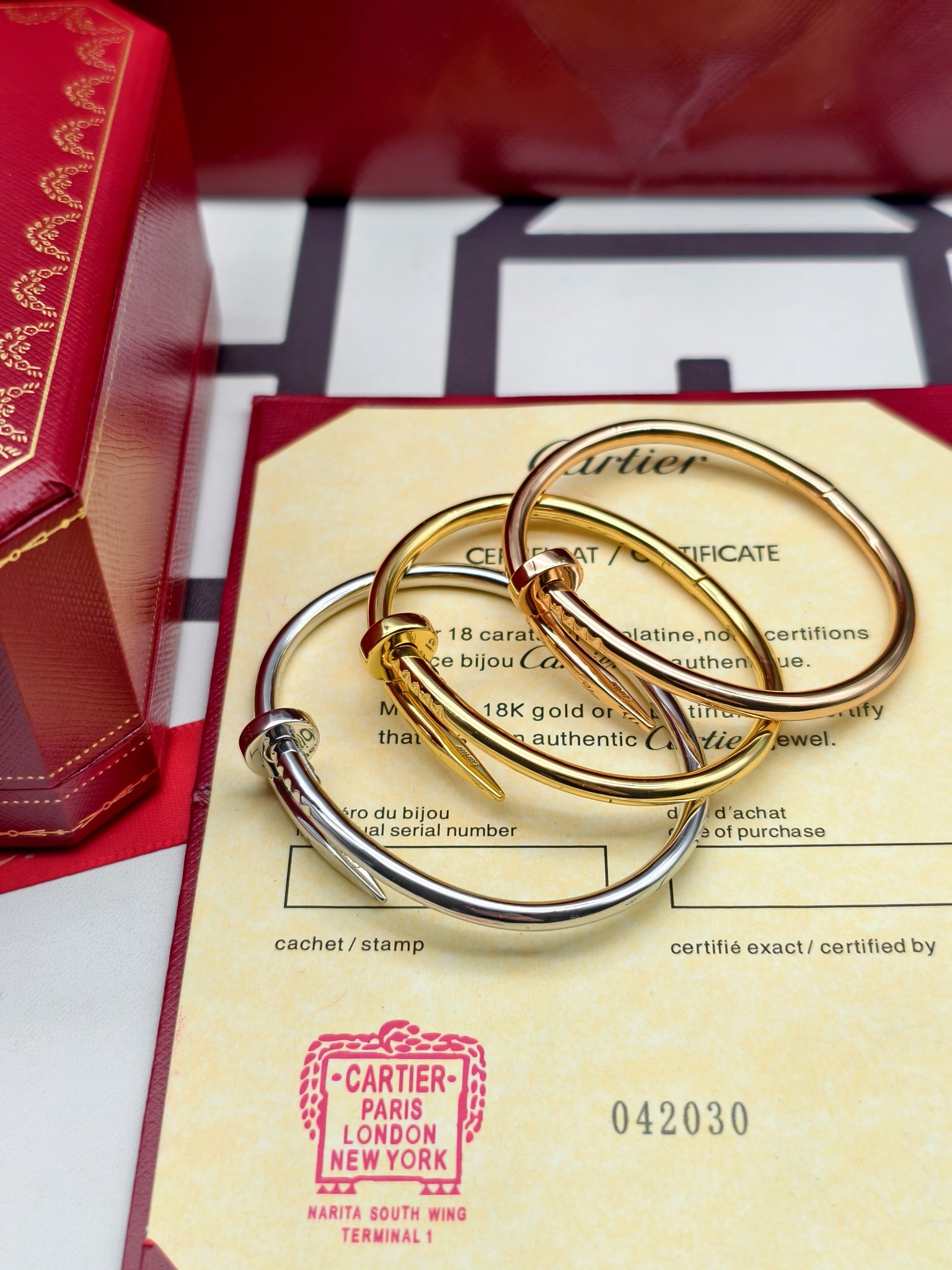 卡地亚无钻钉子手镯 版本:V金升级款 (尾部有logo) 材料:通体V金制作 表面电镀工艺 细节:这次在之前基础上把小细节进行了完善,尾部logo小细节已经添加,按压方式打开,采用记忆金属弹簧按压扣,更好的保证佩戴时的松紧,刻字也采用了cnc精雕技术。 尺寸:17 19(内圈周长cm) 颜色:银色 玫瑰金 金色 专柜好包装➕