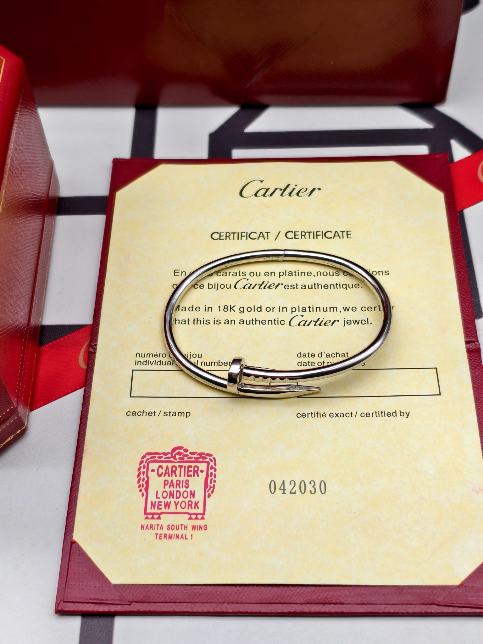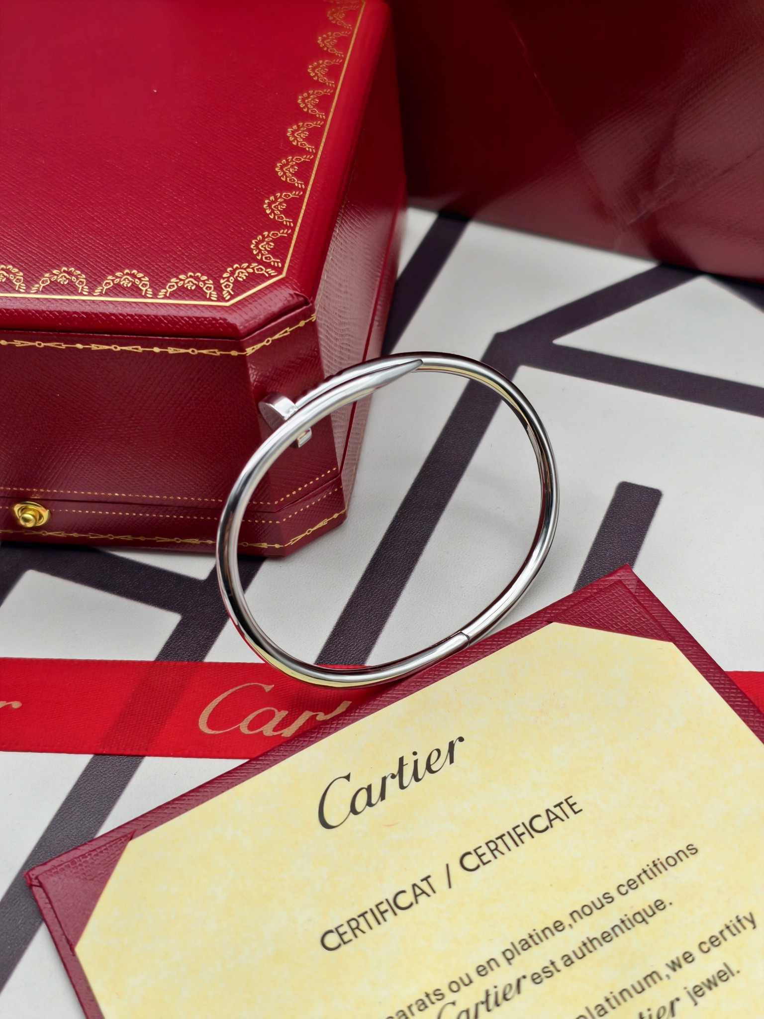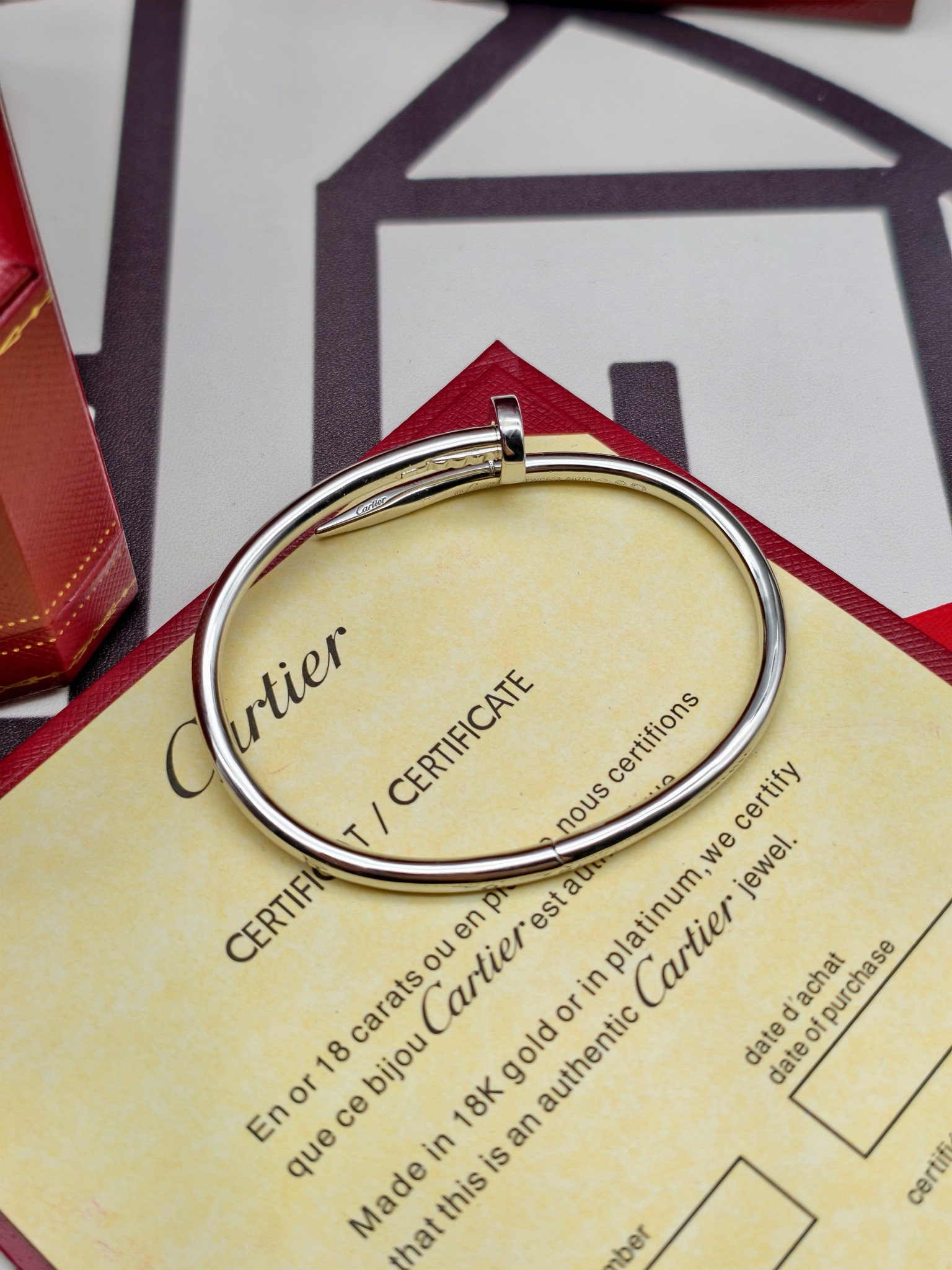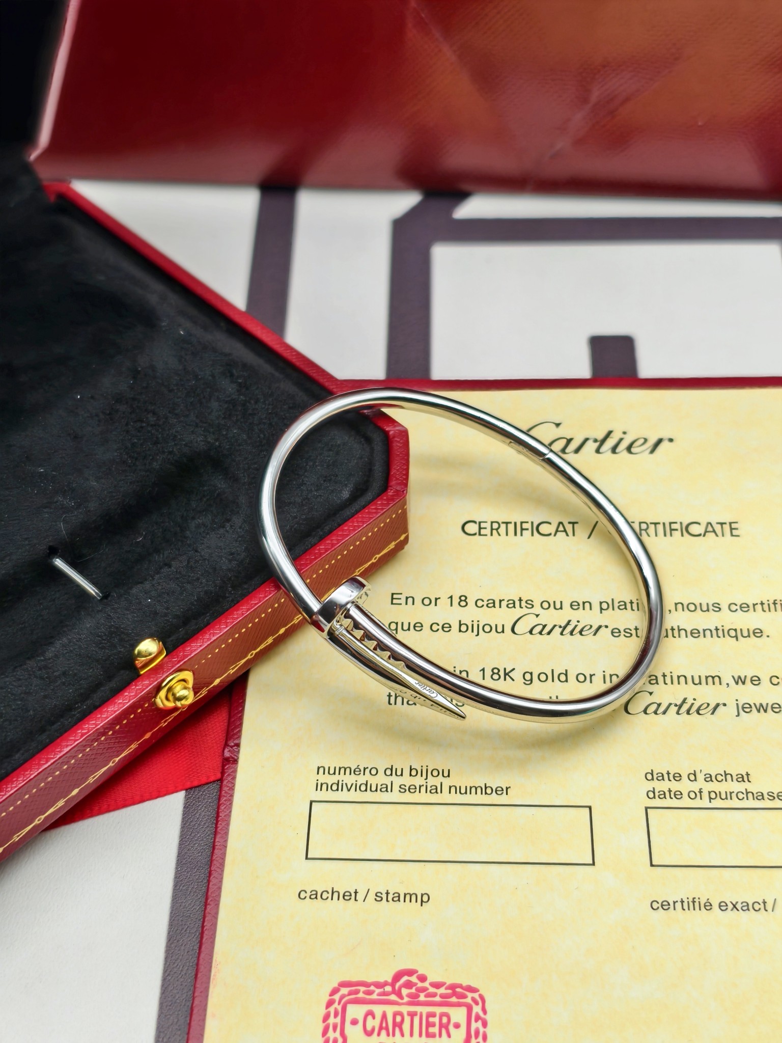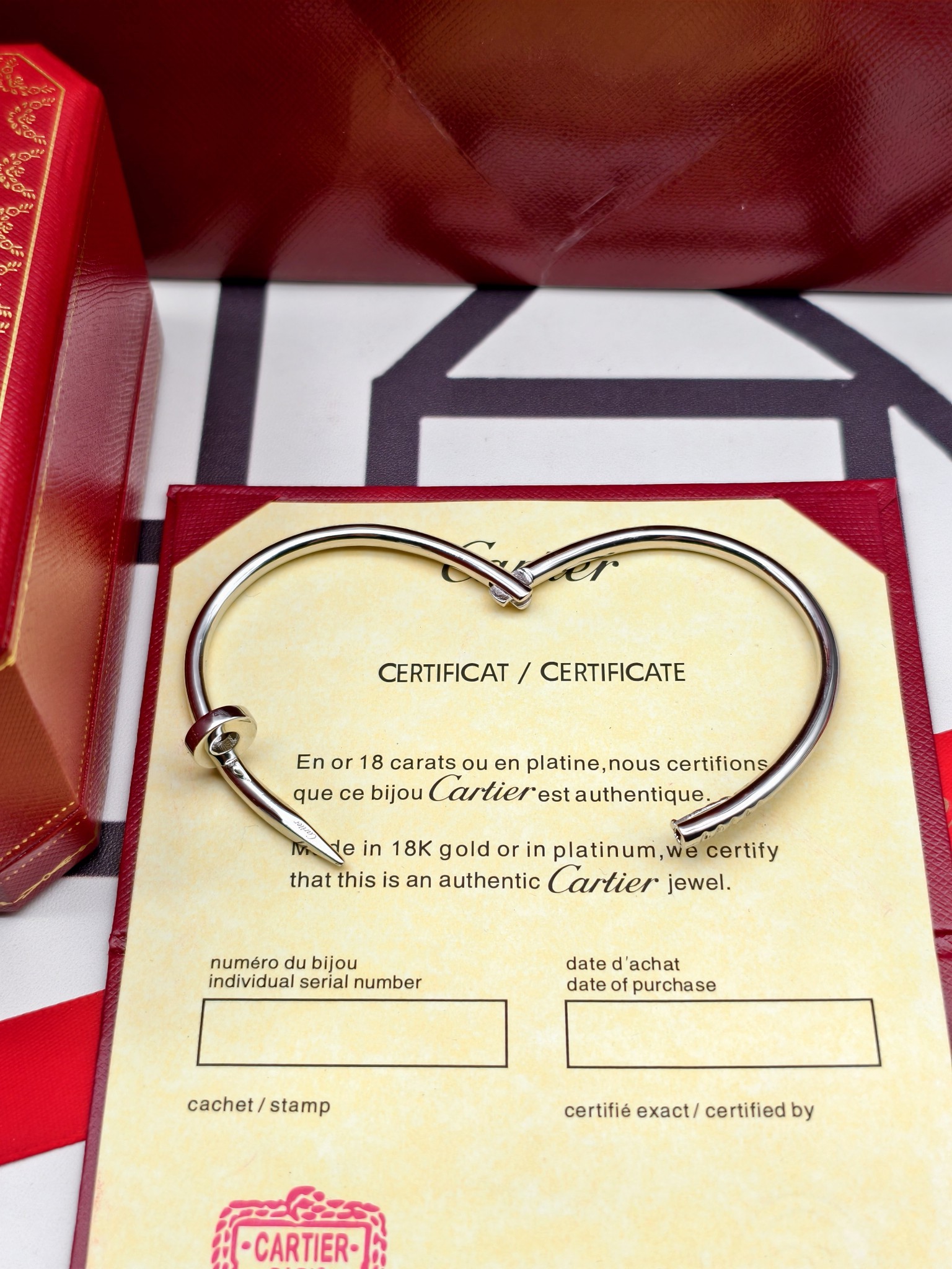 卡地亚无钻钉子手镯 版本:V金升级款 (尾部有logo) 材料:通体V金制作 表面电镀工艺 细节:这次在之前基础上把小细节进行了完善,尾部logo小细节已经添加,按压方式打开,采用记忆金属弹簧按压扣,更好的保证佩戴时的松紧,刻字也采用了cnc精雕技术。 尺寸:17 19(内圈周长cm) 颜色:银色 玫瑰金 金色 专柜好包装➕