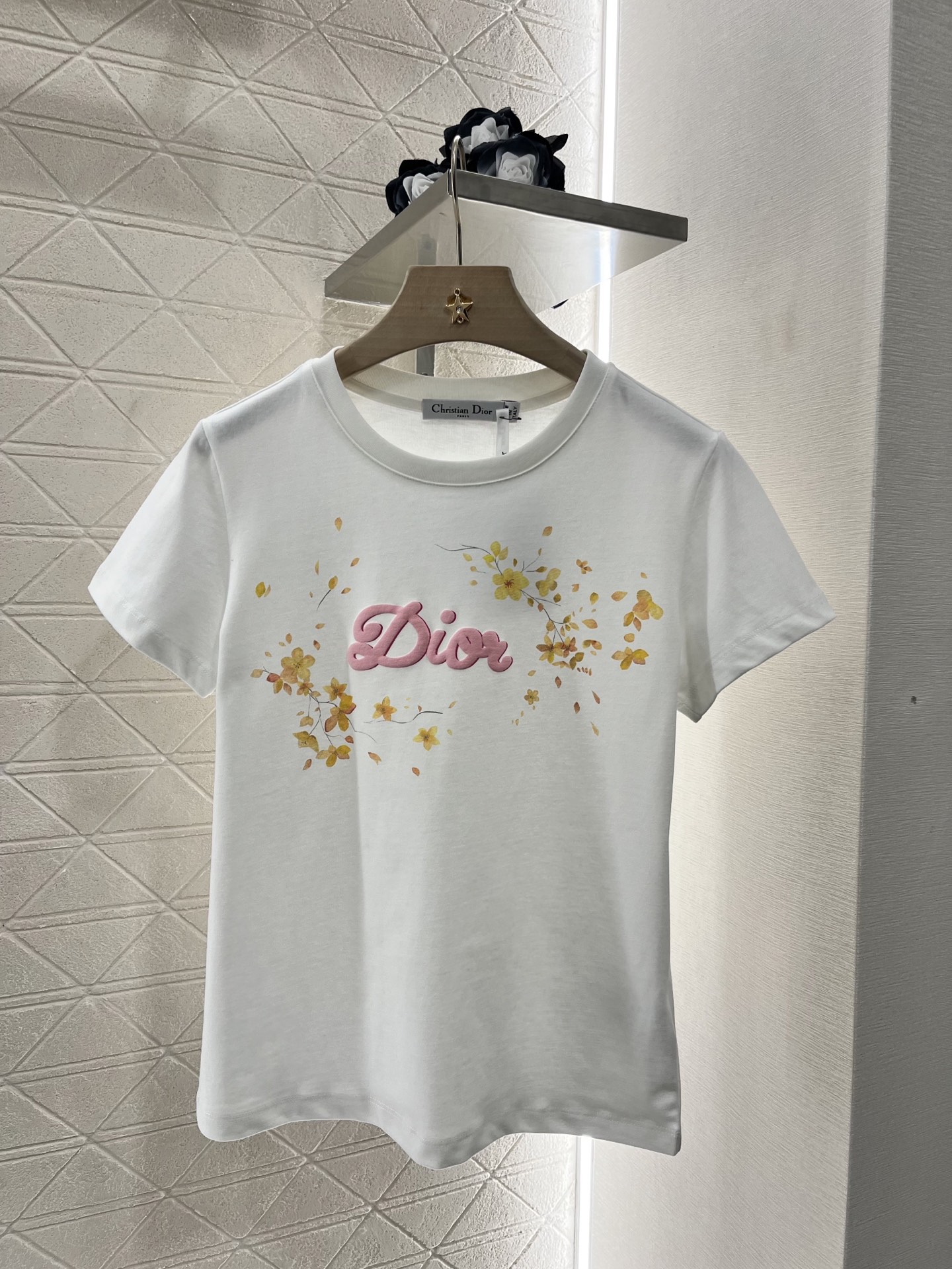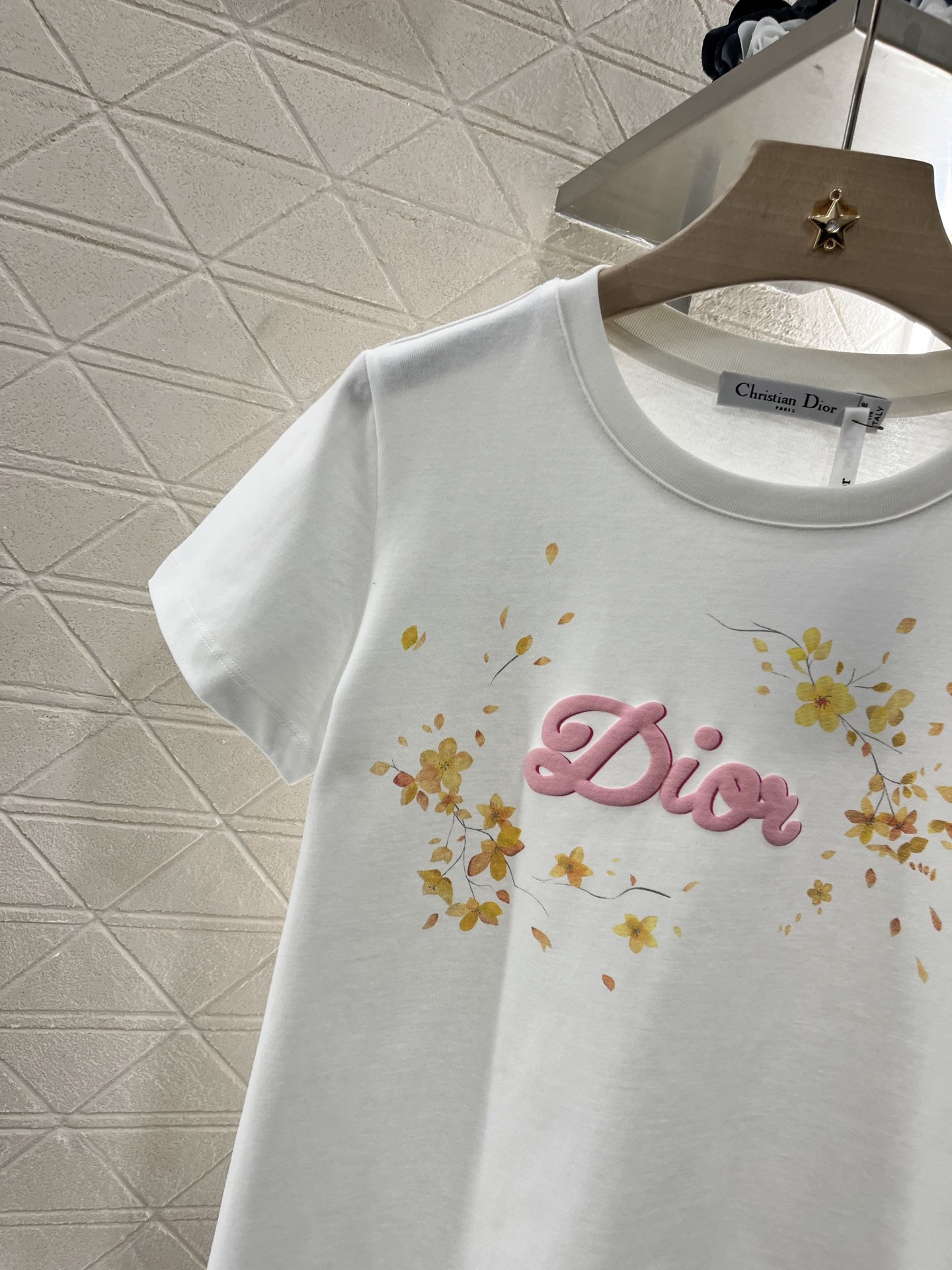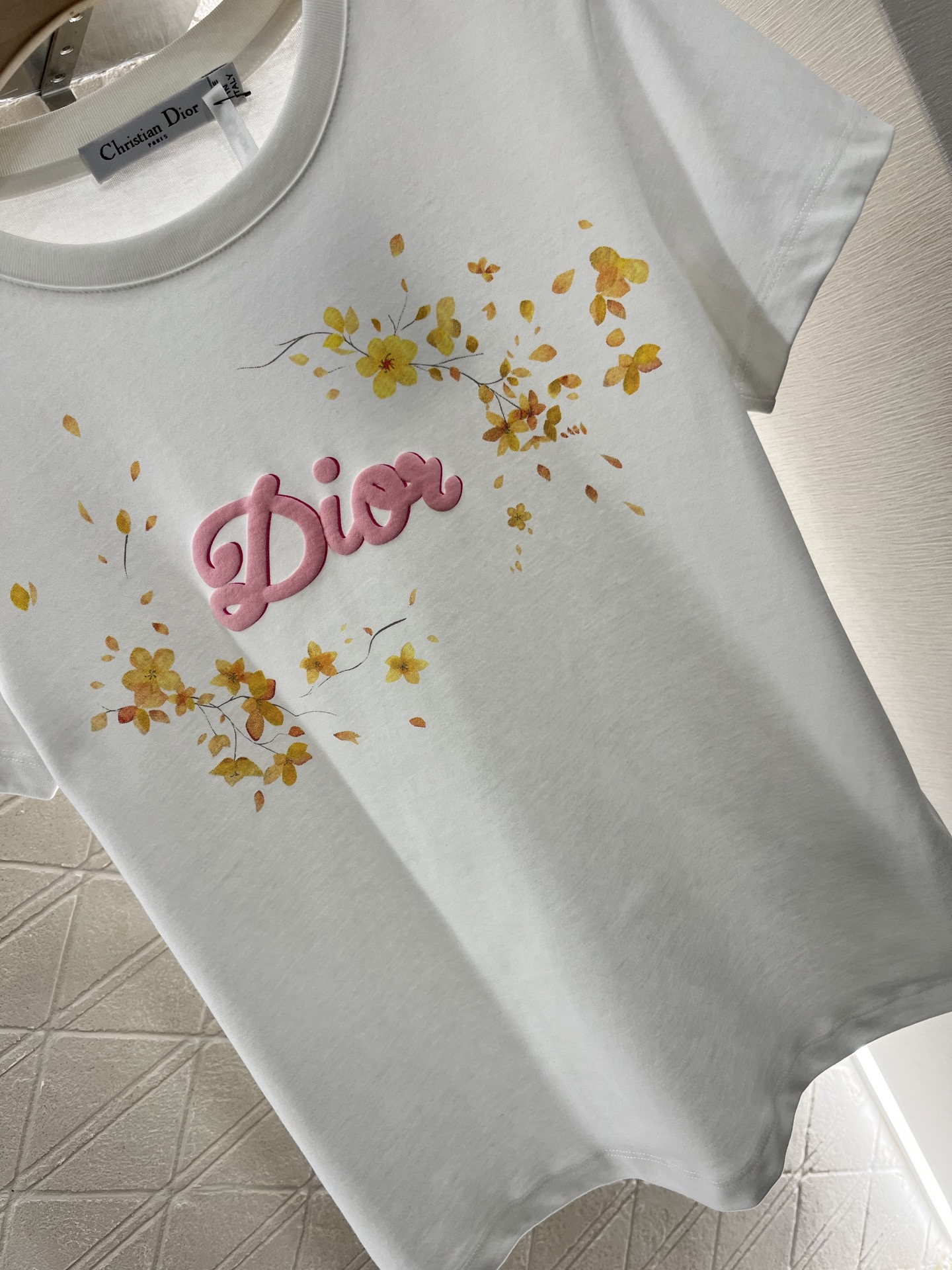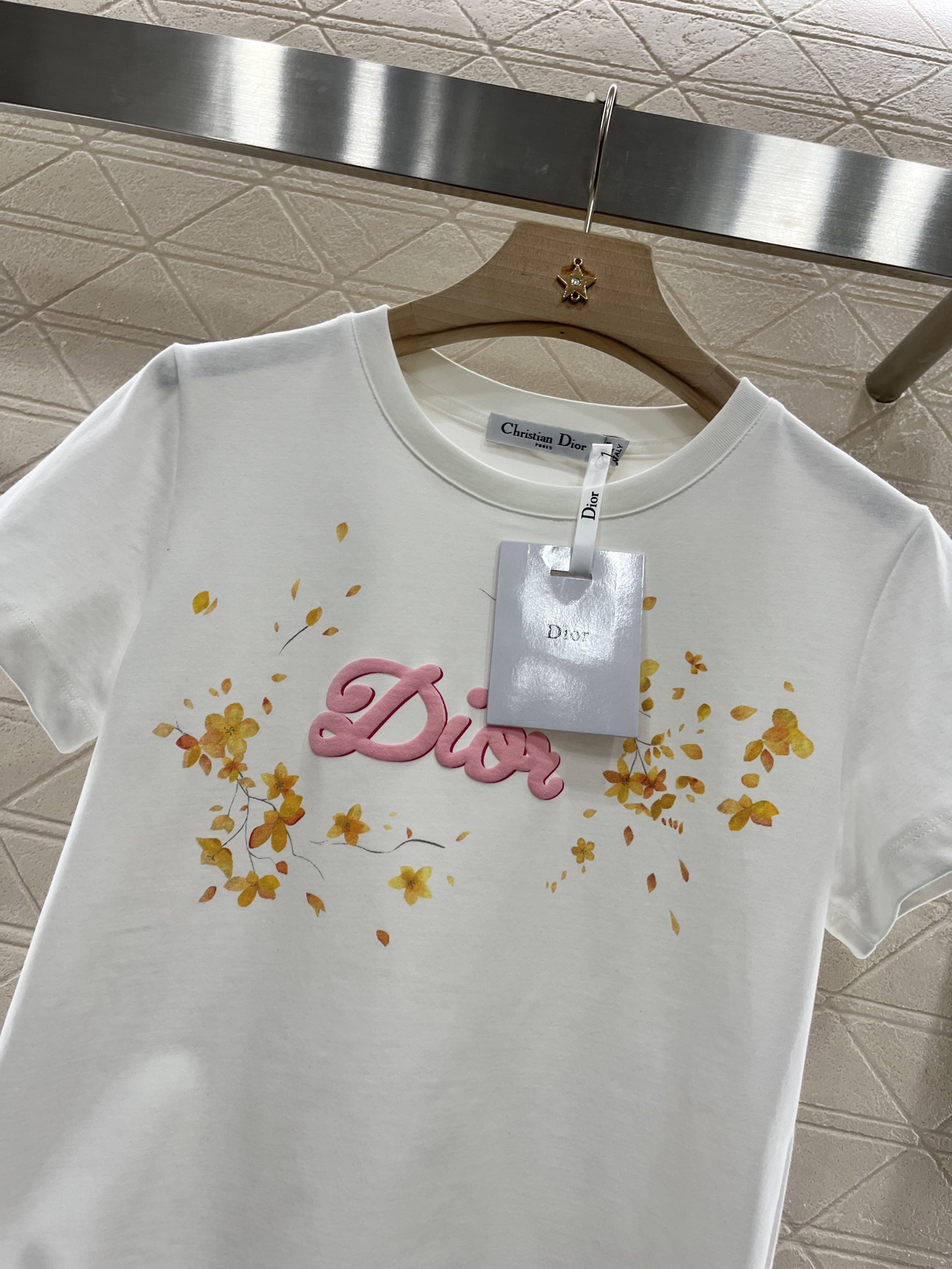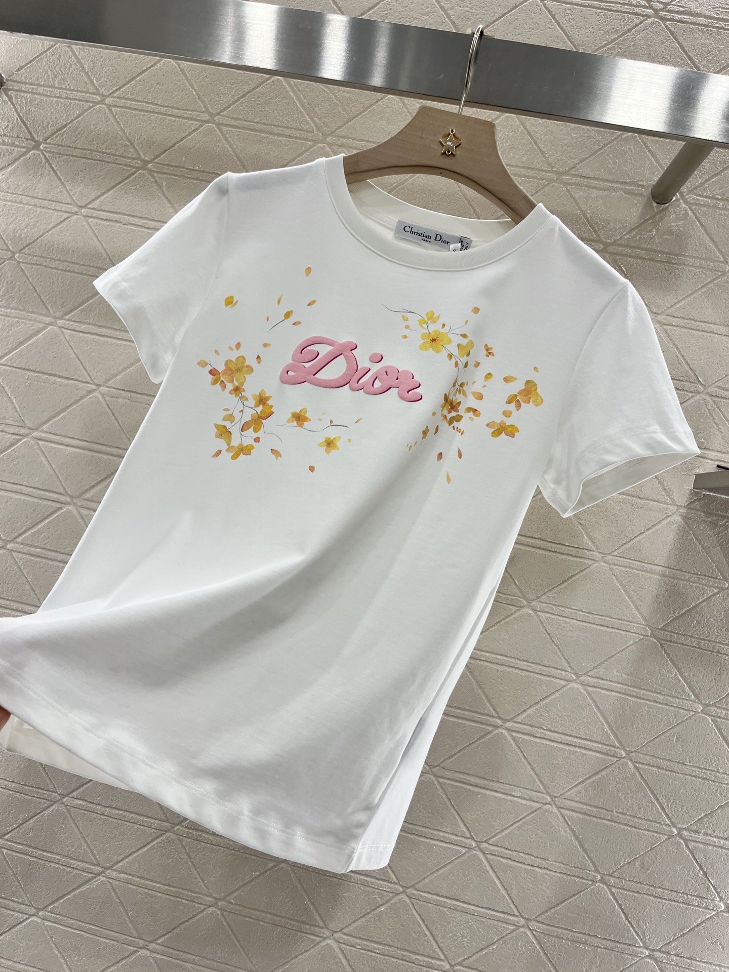 原单狠货女装 配包装♥Dio*♥2025新品上架 起泡印花 定制YB原生全棉材质 透气舒适 质感十足 常规T恤裁剪 凸显品牌格调 采用克重纯棉制成 略带有弹力 呈现显瘦视觉效果 胸口前侧以起泡印花工艺勾勒出花朵图案和字母品牌徽标 配合撞色有效丰富视觉效果 打造优雅俏皮的个性风格 品牌高级设计感拉满 单穿内搭都出彩时髦 定制面辅料 认准版本 高版本