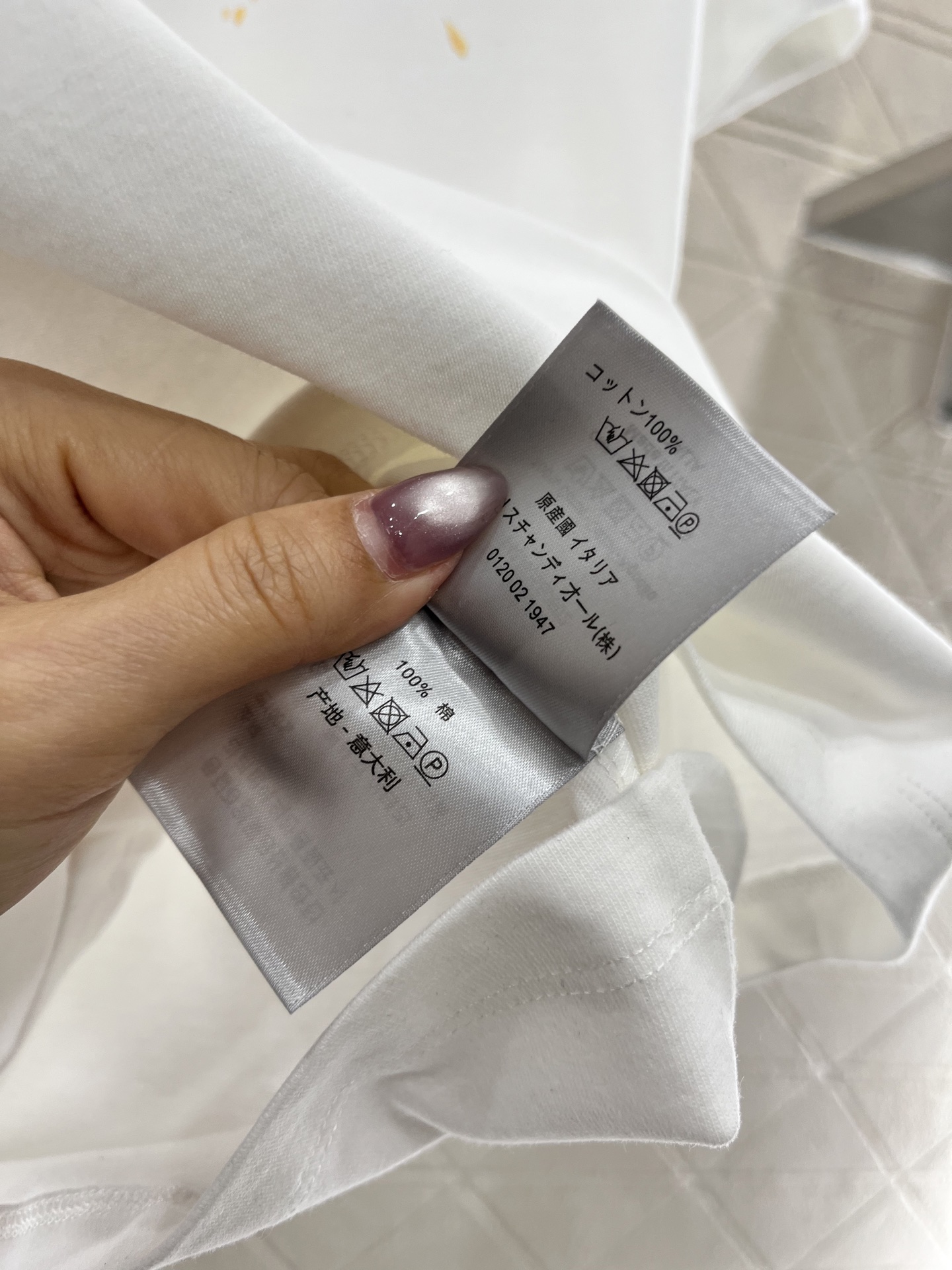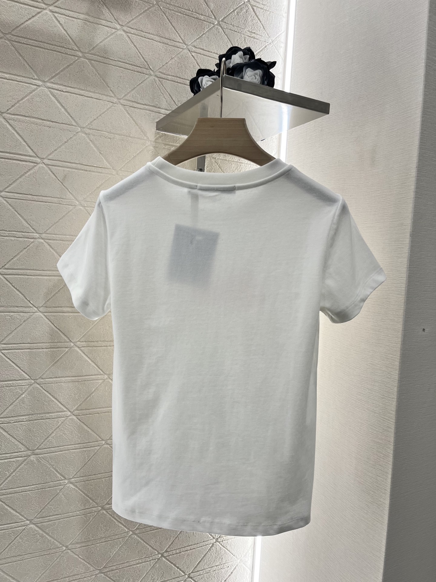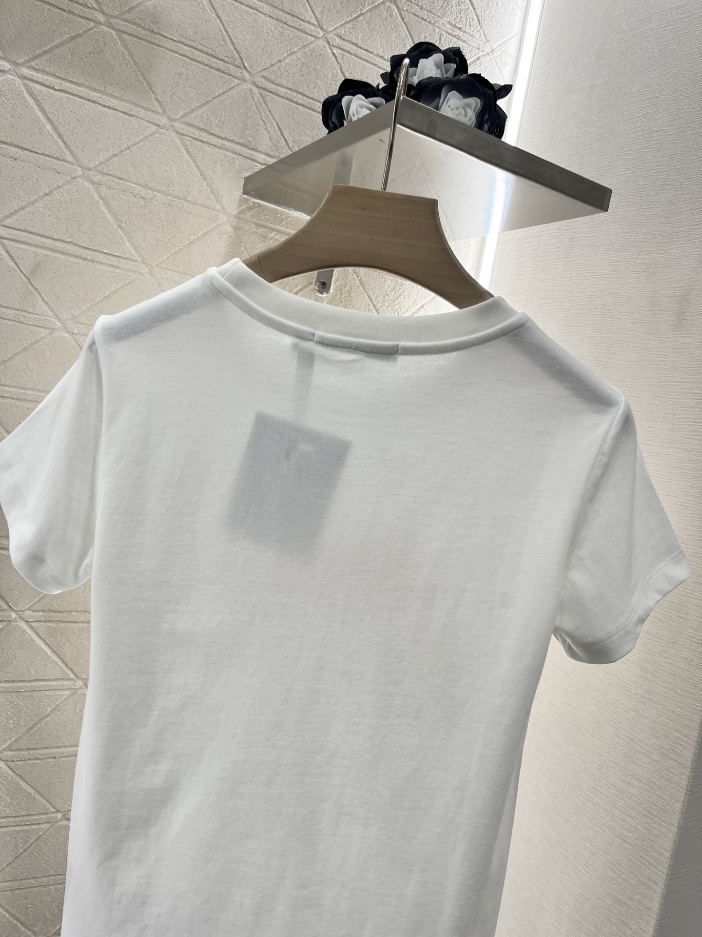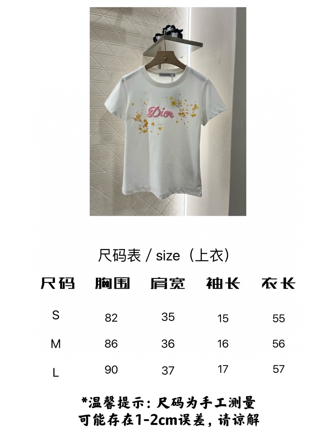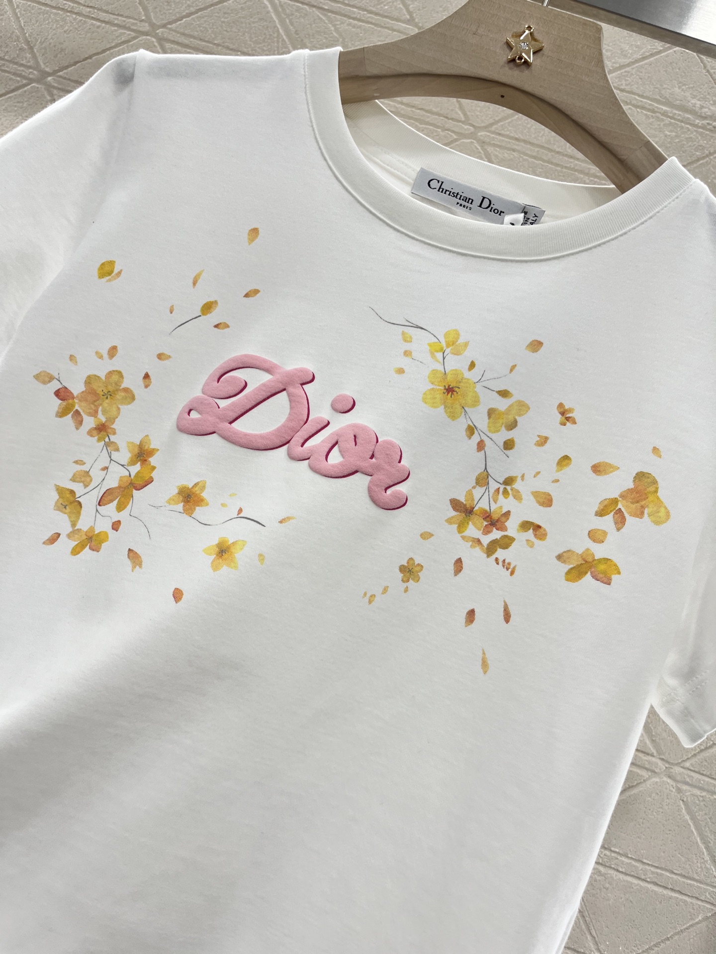 原单狠货女装 配包装♥Dio*♥2025新品上架 起泡印花 定制YB原生全棉材质 透气舒适 质感十足 常规T恤裁剪 凸显品牌格调 采用克重纯棉制成 略带有弹力 呈现显瘦视觉效果 胸口前侧以起泡印花工艺勾勒出花朵图案和字母品牌徽标 配合撞色有效丰富视觉效果 打造优雅俏皮的个性风格 品牌高级设计感拉满 单穿内搭都出彩时髦 定制面辅料 认准版本 高版本