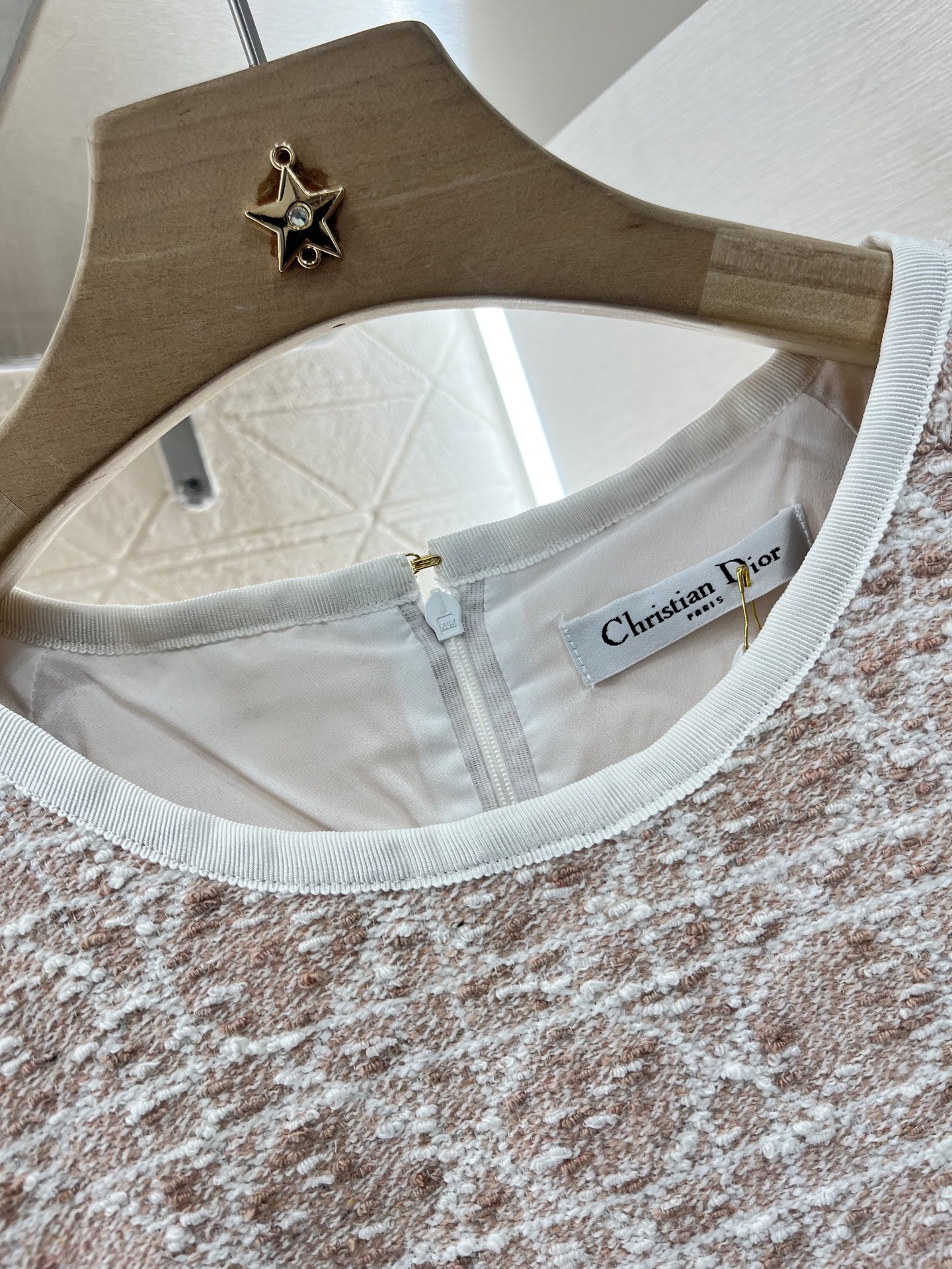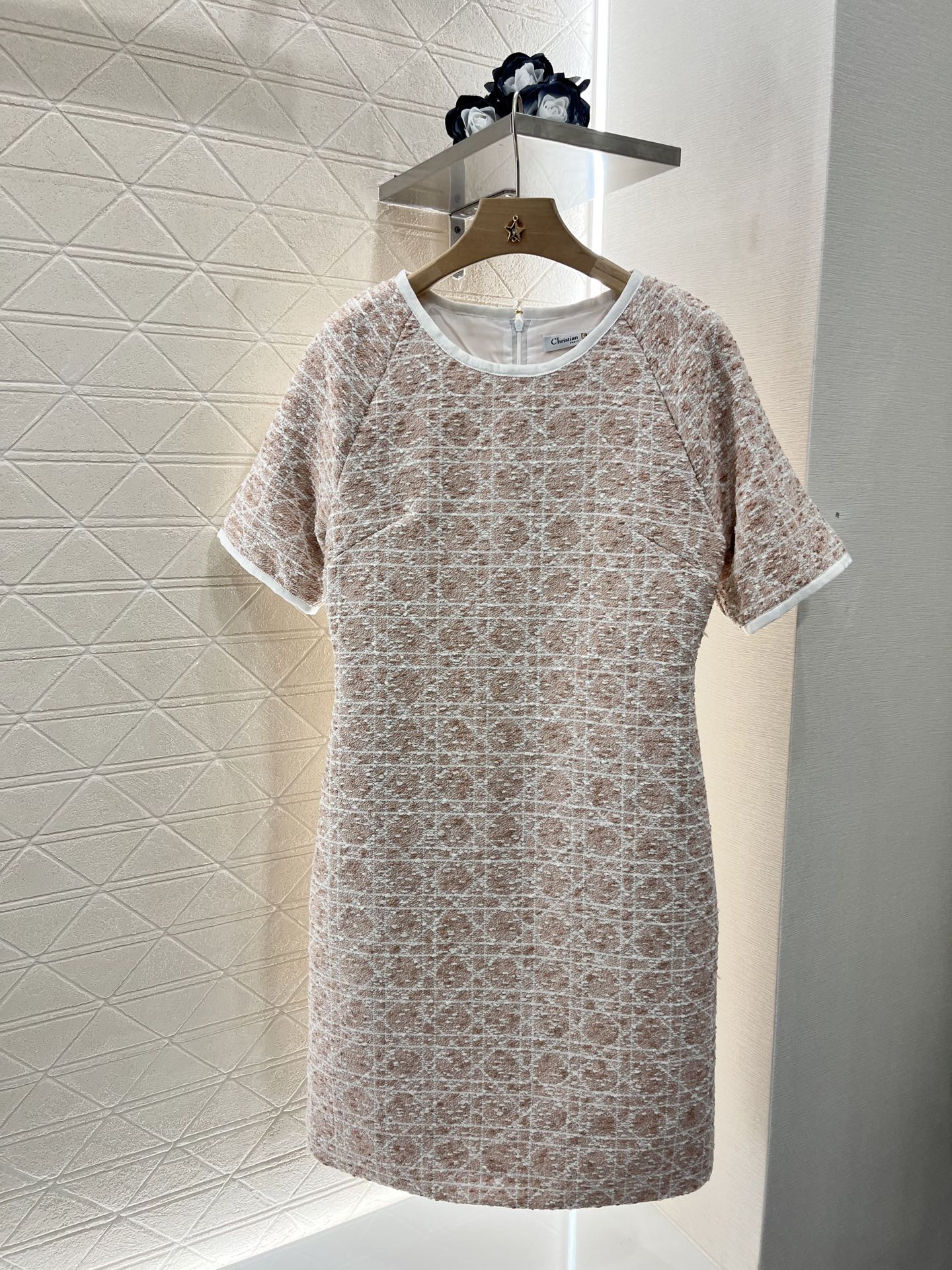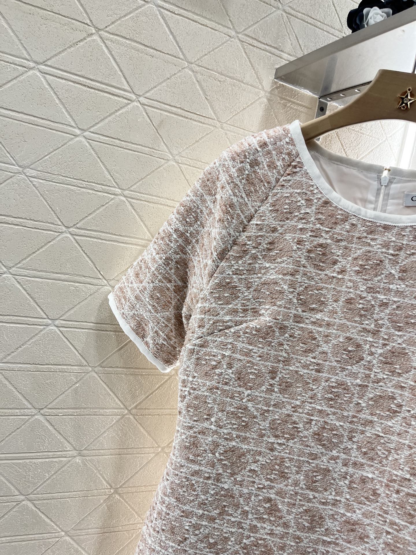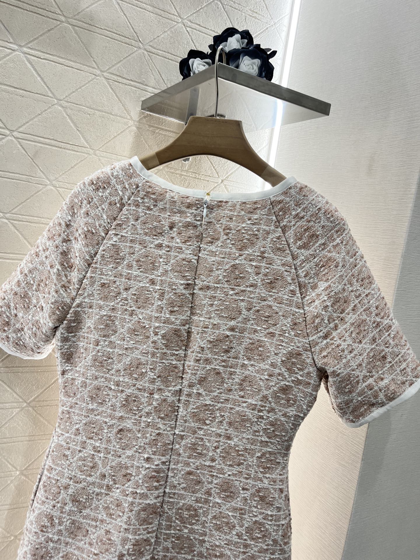 原单狠货女装 配包装♥Dio*♥2025新品上架 圆领短袖连衣裙 定制YB进口粗纺毛呢材质 质感高级 品相十足 圆领短袖连衣裙裁剪 袖口和领口以立体白色捆边点亮细节 配合细腻的白色纱线规则交织出腾格纹满铺于全身 名媛格调立显 完美演绎优雅千金感 通体浅蓝色➕樱花粉显贵显质感 知性温柔 出席正式场合的不二之选 ⚠️天花板版本 真丝内衬 定制面辅料 认准版本 高版本 2色