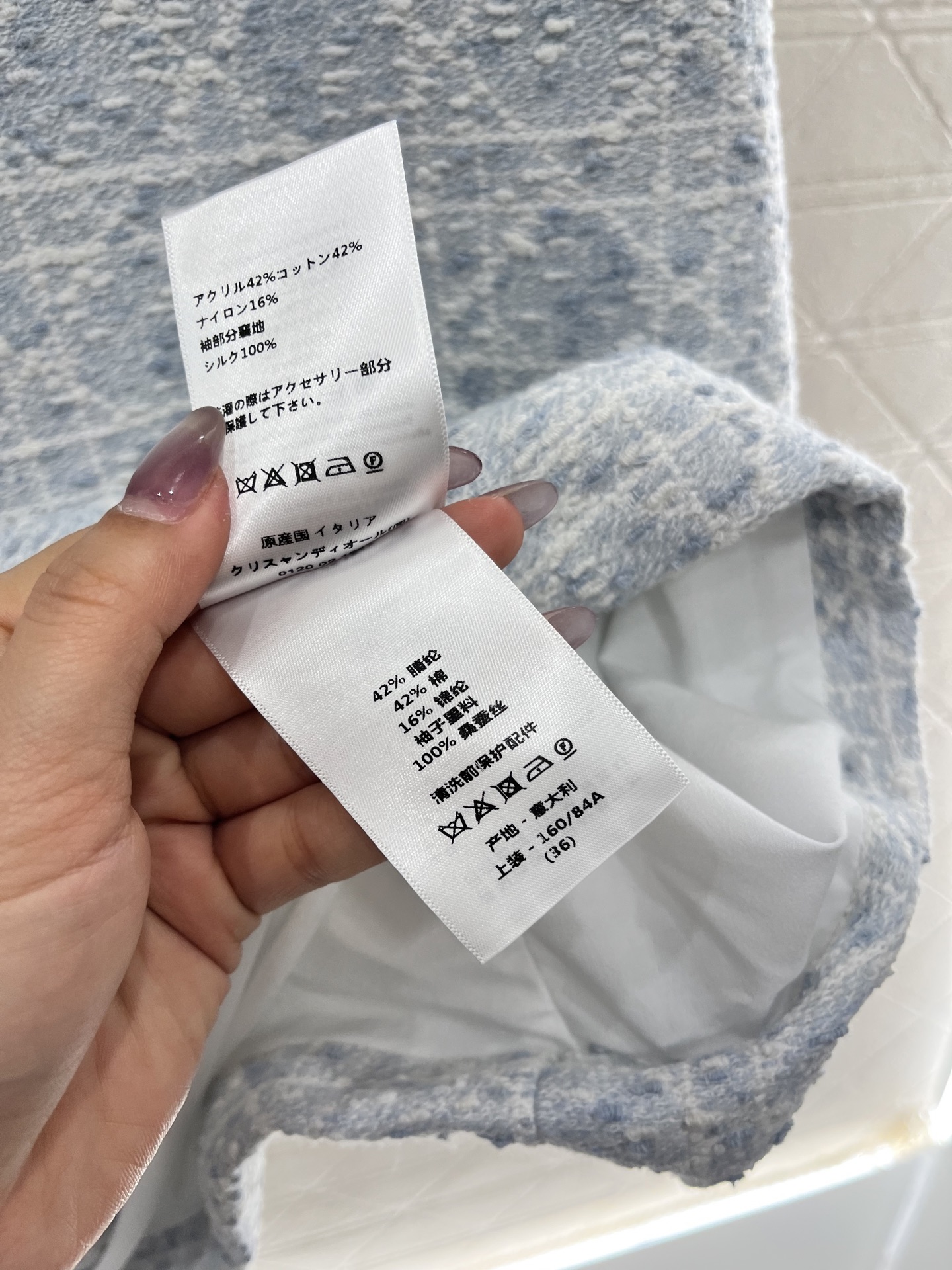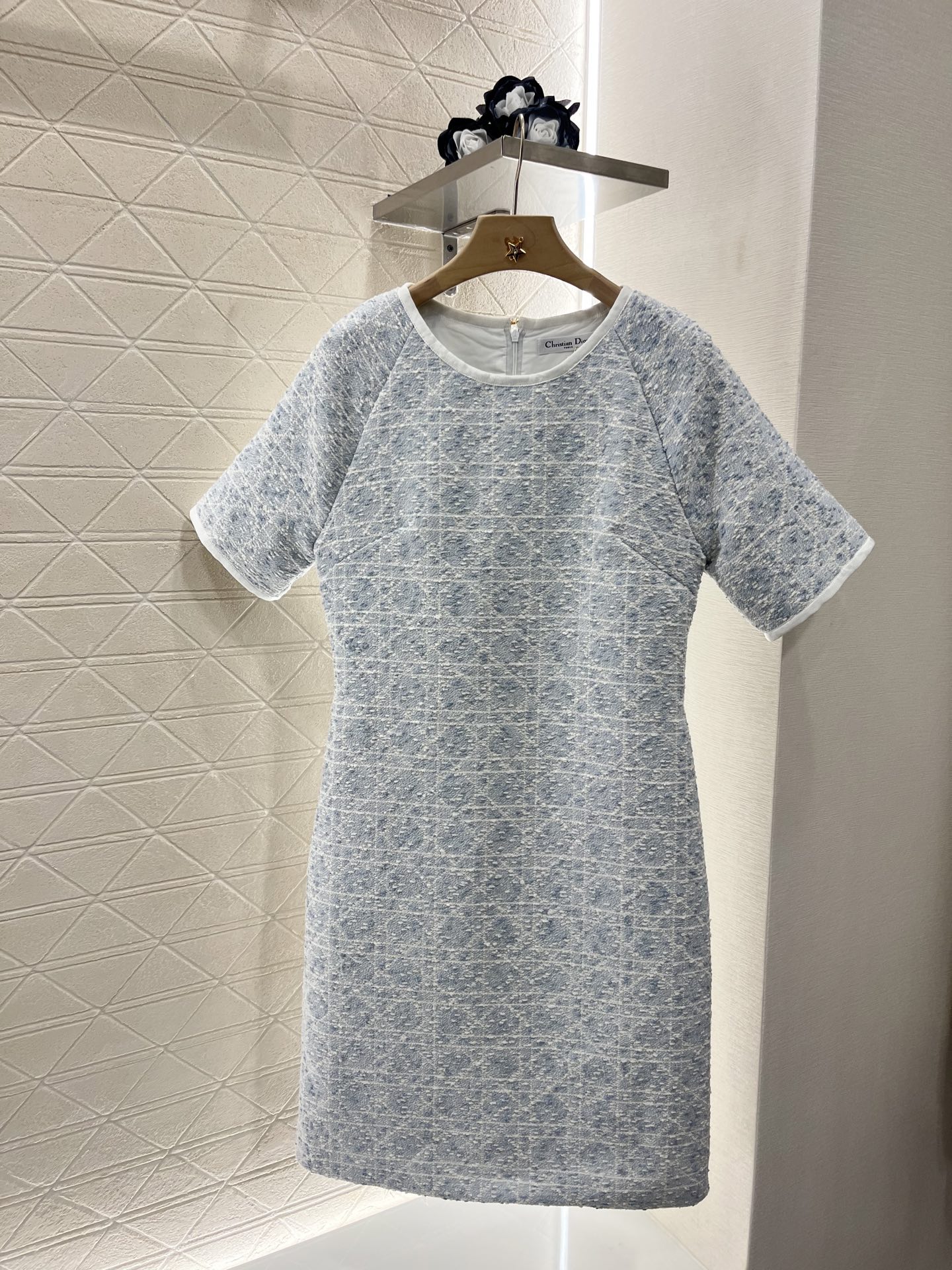 原单狠货女装 配包装♥Dio*♥2025新品上架 圆领短袖连衣裙 定制YB进口粗纺毛呢材质 质感高级 品相十足 圆领短袖连衣裙裁剪 袖口和领口以立体白色捆边点亮细节 配合细腻的白色纱线规则交织出腾格纹满铺于全身 名媛格调立显 完美演绎优雅千金感 通体浅蓝色➕樱花粉显贵显质感 知性温柔 出席正式场合的不二之选 ⚠️天花板版本 真丝内衬 定制面辅料 认准版本 高版本 2色