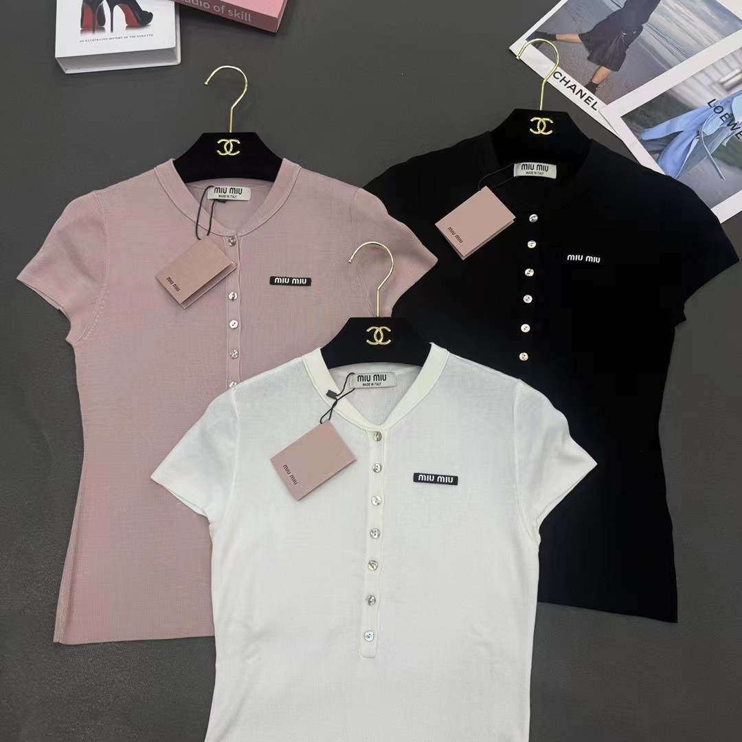 原单狠货女装 配包装Miumi*春夏新款 小立领针织短袖 扣子解开穿超显脖子线条 小飞袖设计超遮肉又显瘦 修身版型上身超百搭又显瘦的