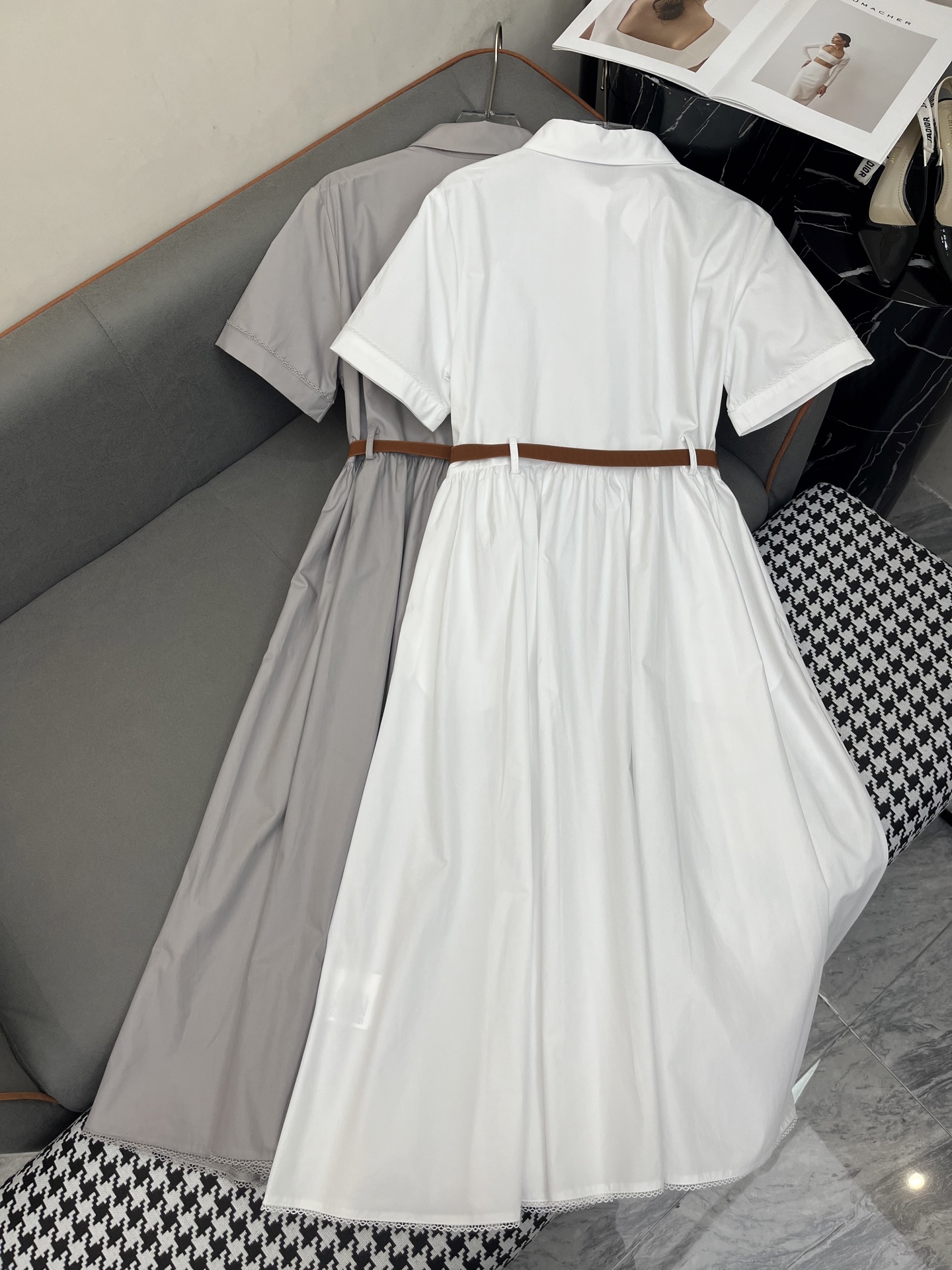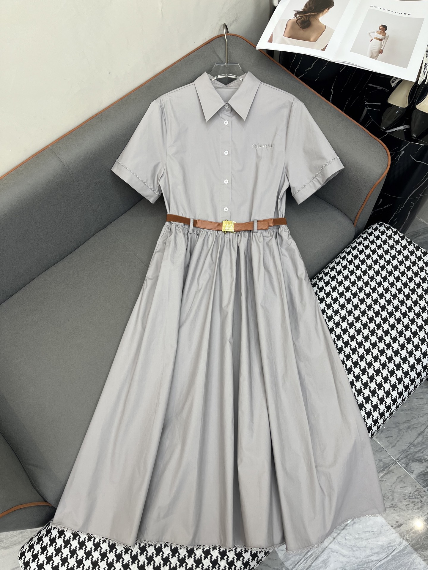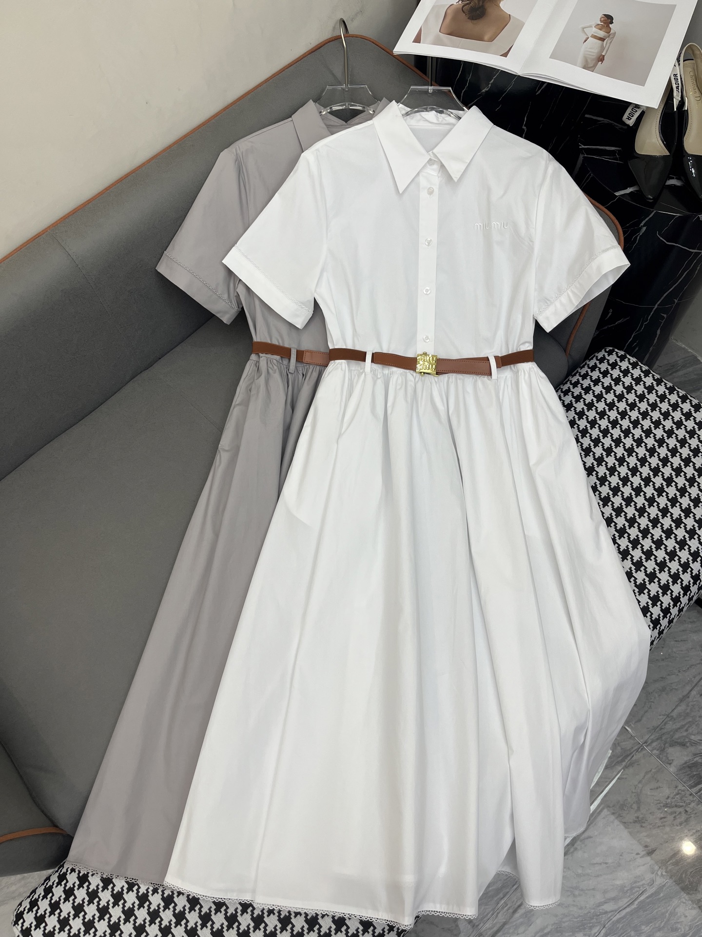 原单狠货女装 配包装MiuMi*/25SS新款短袖衬衫连衣裙 /字母绣花装饰/收褶裙摆/袖口花边拼接设计/搭配腰带/两色三码SML