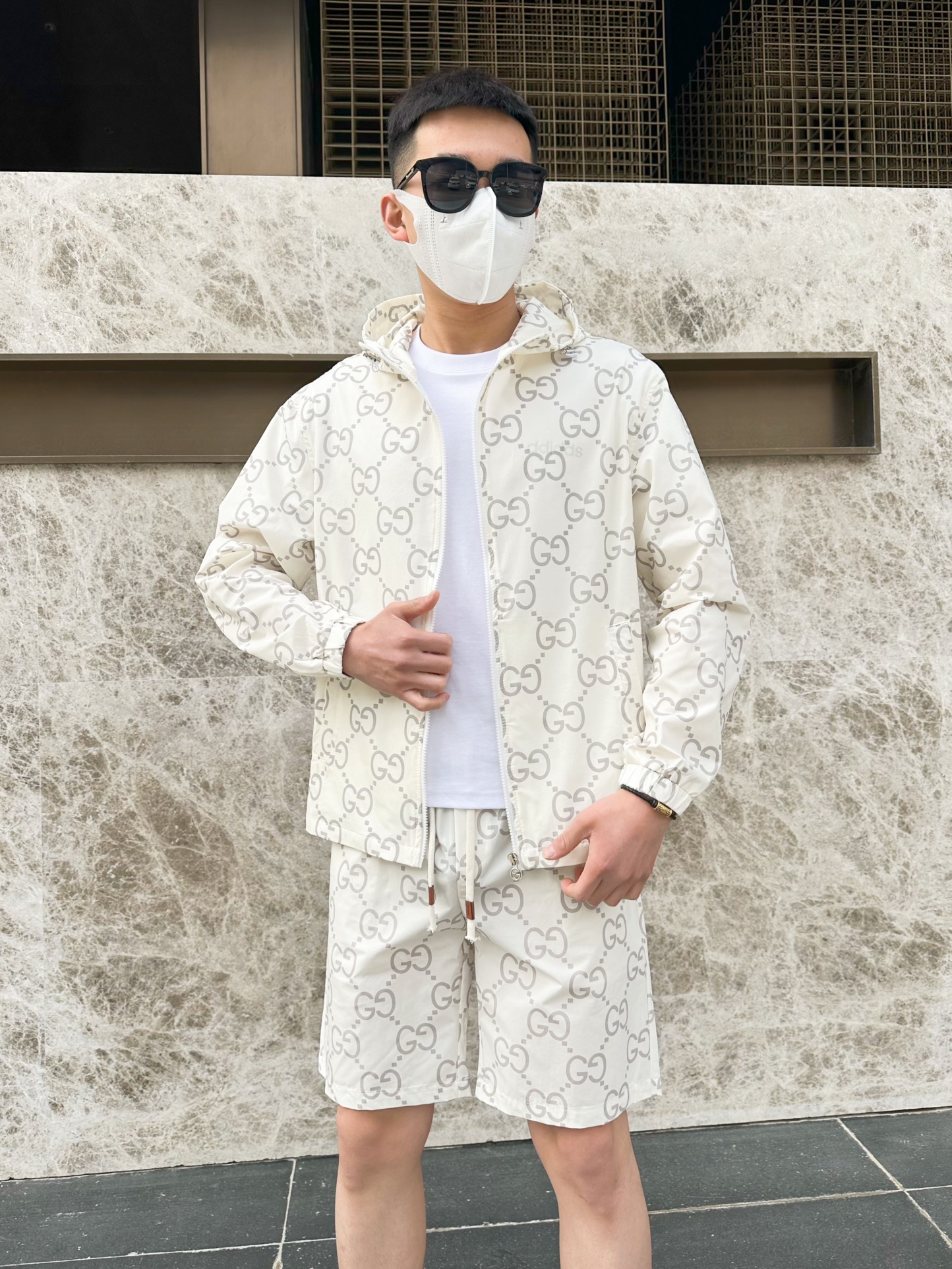 古驰 2025夏季防晒衣短裤套装,海外专柜同步 轻薄高品质面料奢华高级定制 任何人都可以轻松驾驭,客供进口聚纤维面料 手软舒适有型 吸汗透气 ,外贸公司订单,n国内一线代工厂出品,订制高密度面料,过水不变型,奢华上身显年轻,街头时尚居家必备款 m-xxxL L穿175/140斤 下单报身高体重