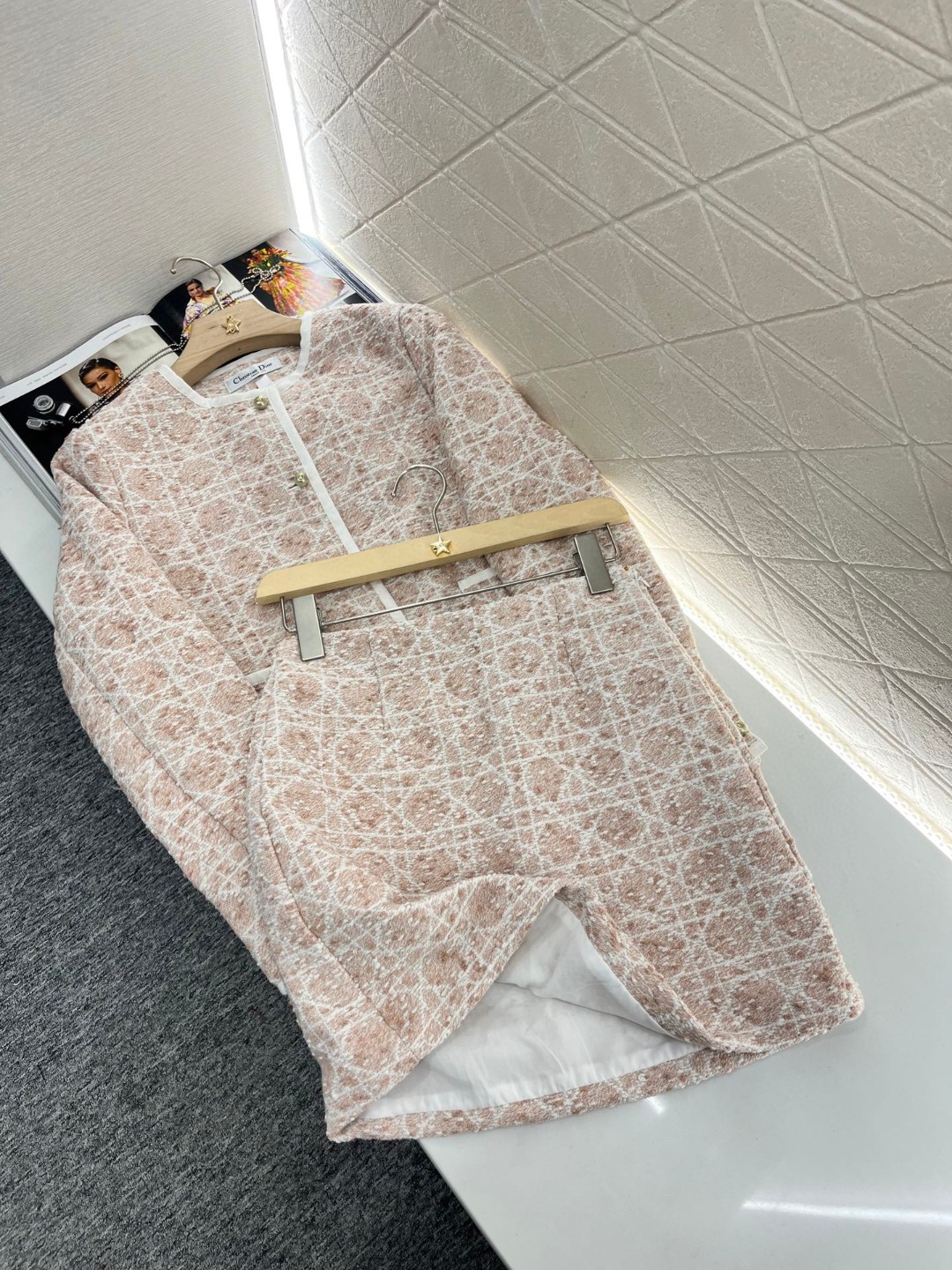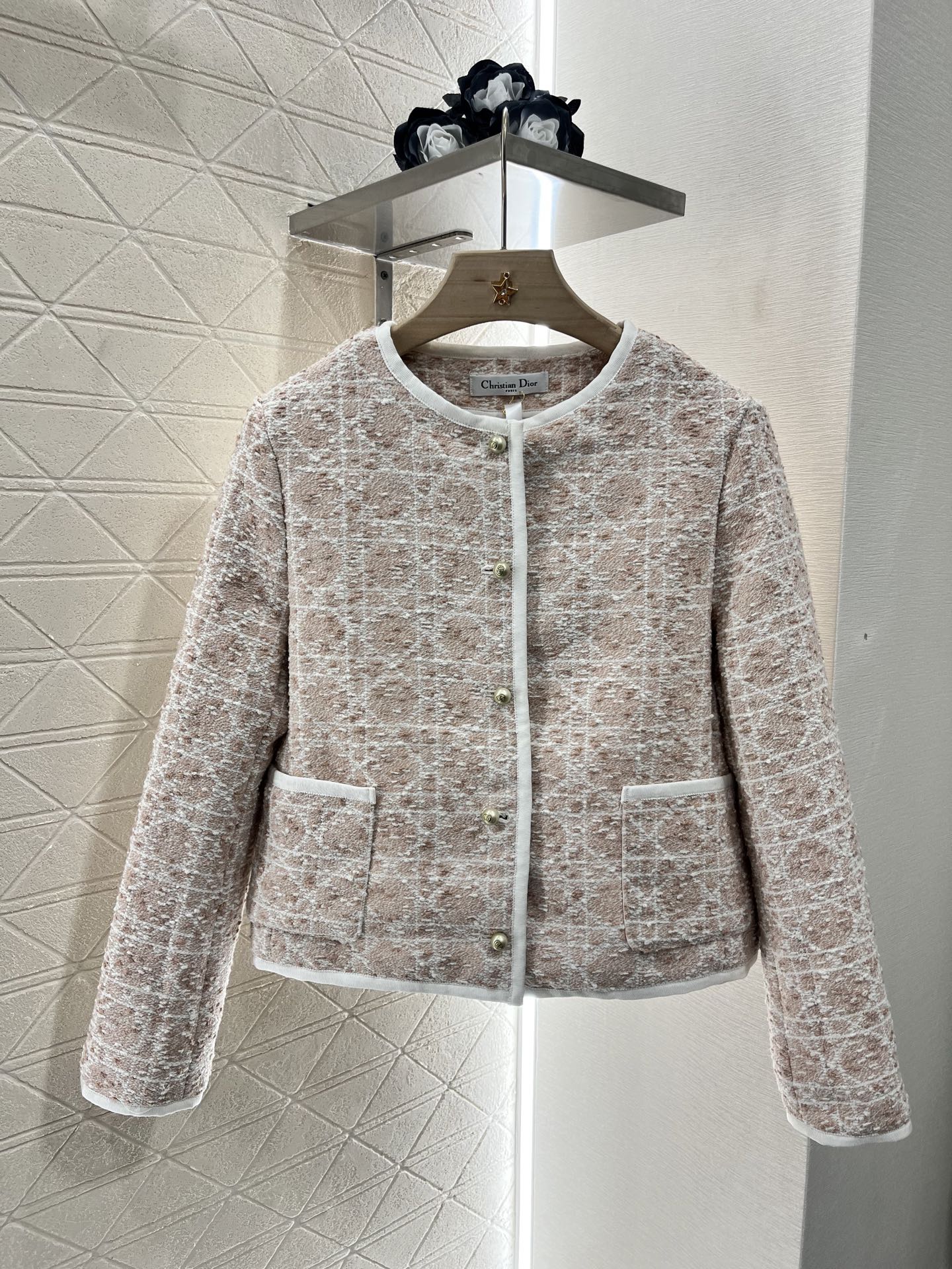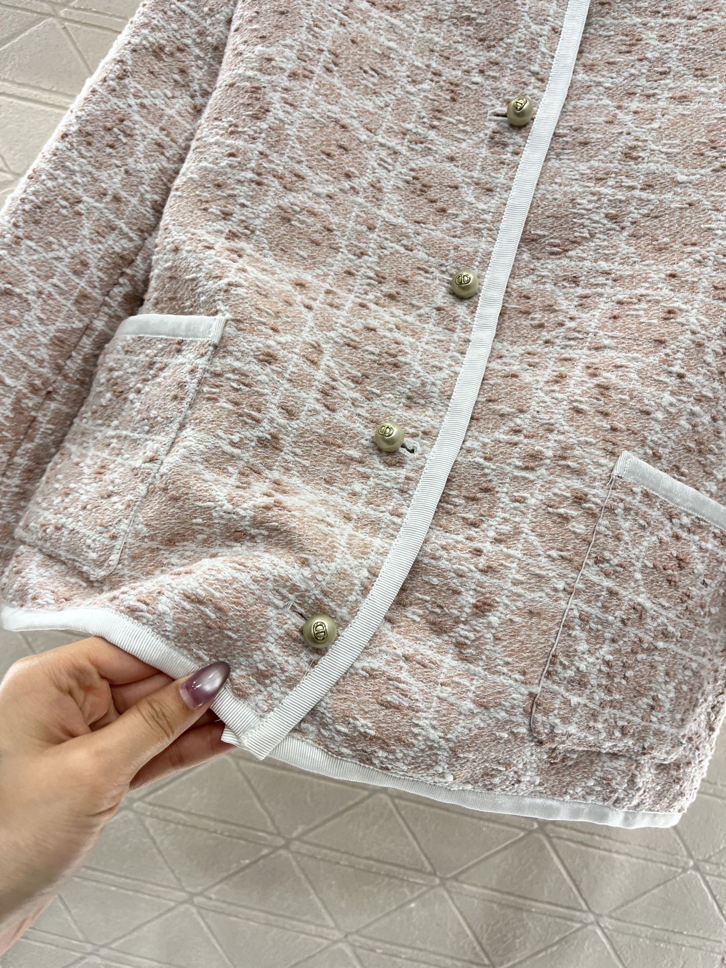 外套 短裤原单狠货女装 配包装♥Dio*♥2025新品上架 圆领洋装半裙套装 定制YB进口粗纺毛呢材质 质感高级 品相十足 圆领洋装外套版型 正肩垫肩设计贴合人体 更显身姿纤细挺拔 前襟和领口以立体白色捆边点亮细节 配合细腻的白色纱线规则交织出腾格纹满铺于全身 名媛格调立显 同系列直筒半裙 细节呼应 完美演绎优雅千金感 成套浅蓝白➕樱花粉显贵显质感 知性温柔 出席正式场合的不二之选 ⚠️天花板版本 真丝内衬 定制面辅料 认准版本 高版本