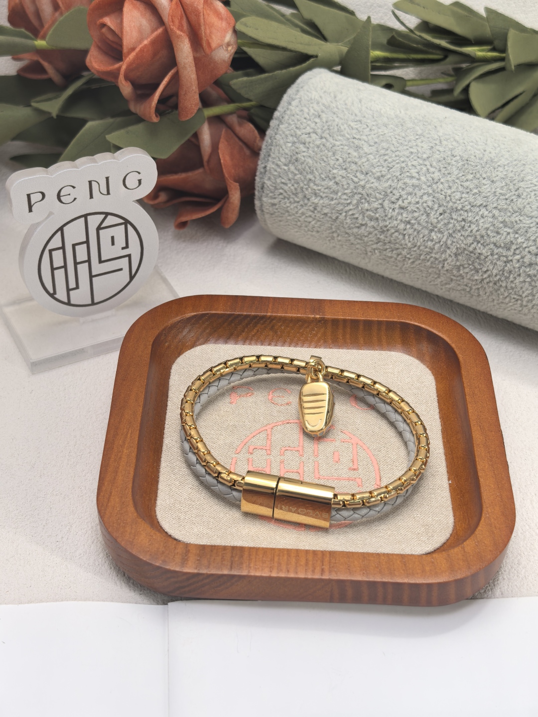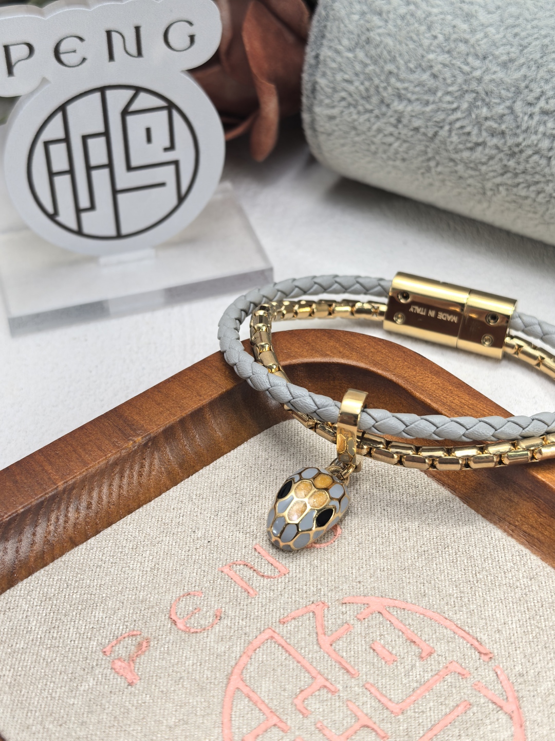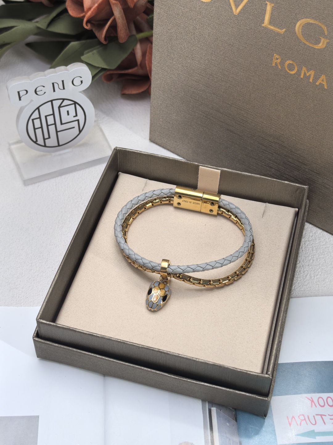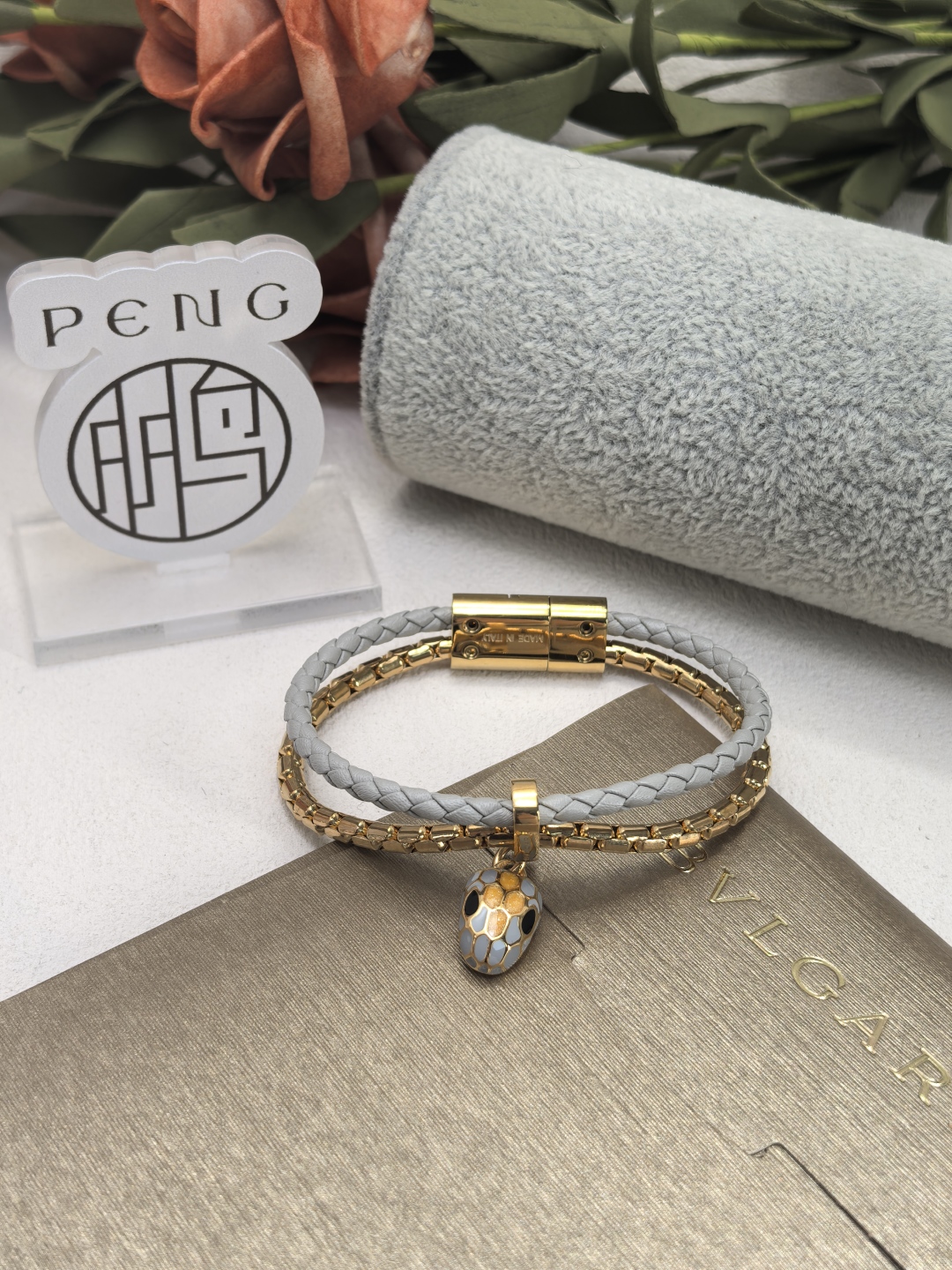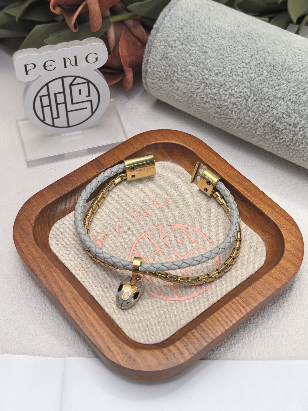 宝格丽双圈蛇手绳 灰色 版本:升级款 (目前最好) 材料:小牛皮(软) 合金金属 细节:采用小牛皮编绳,质感柔软,上手舒服,另一条用合金金属互扣,灵活弯曲,可两边上下按压打开,刻字logo精工雕刻。 尺码:18尺寸(cm) 图片包装➕