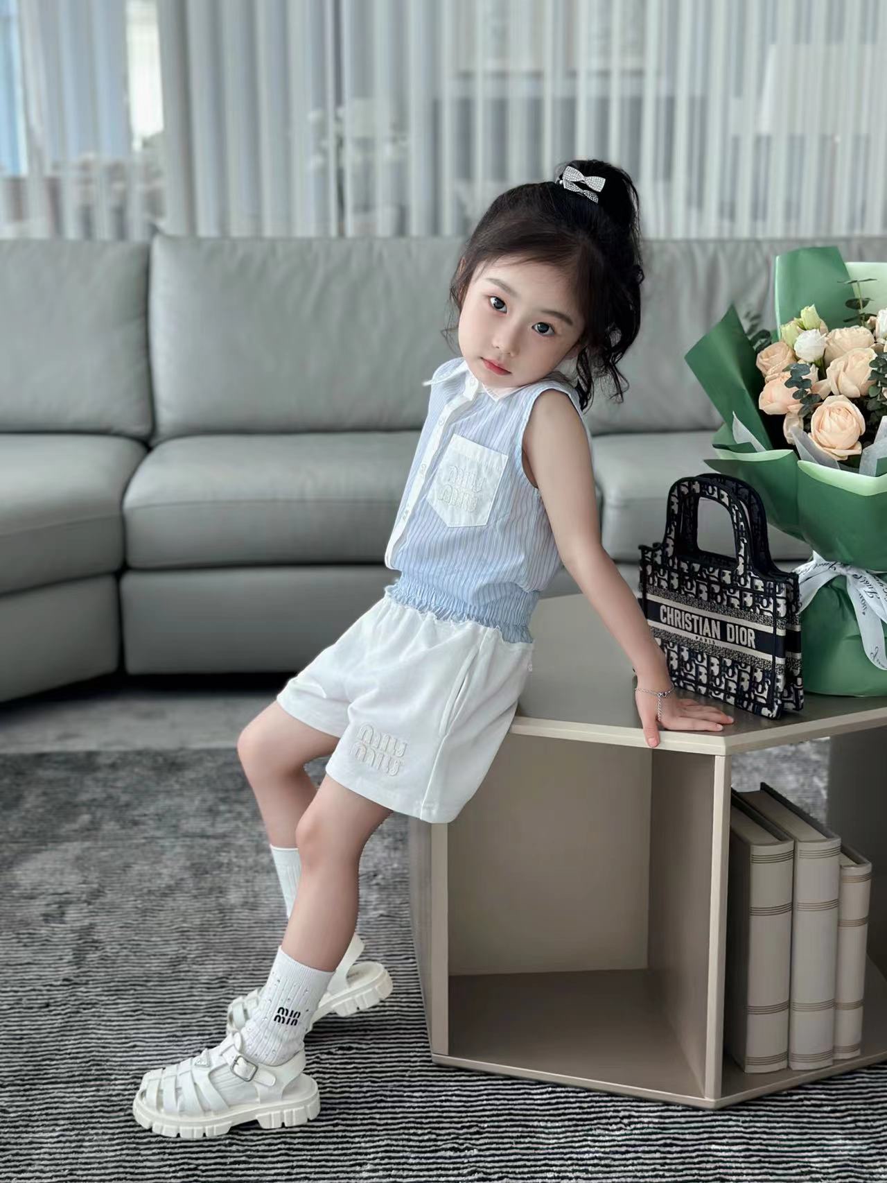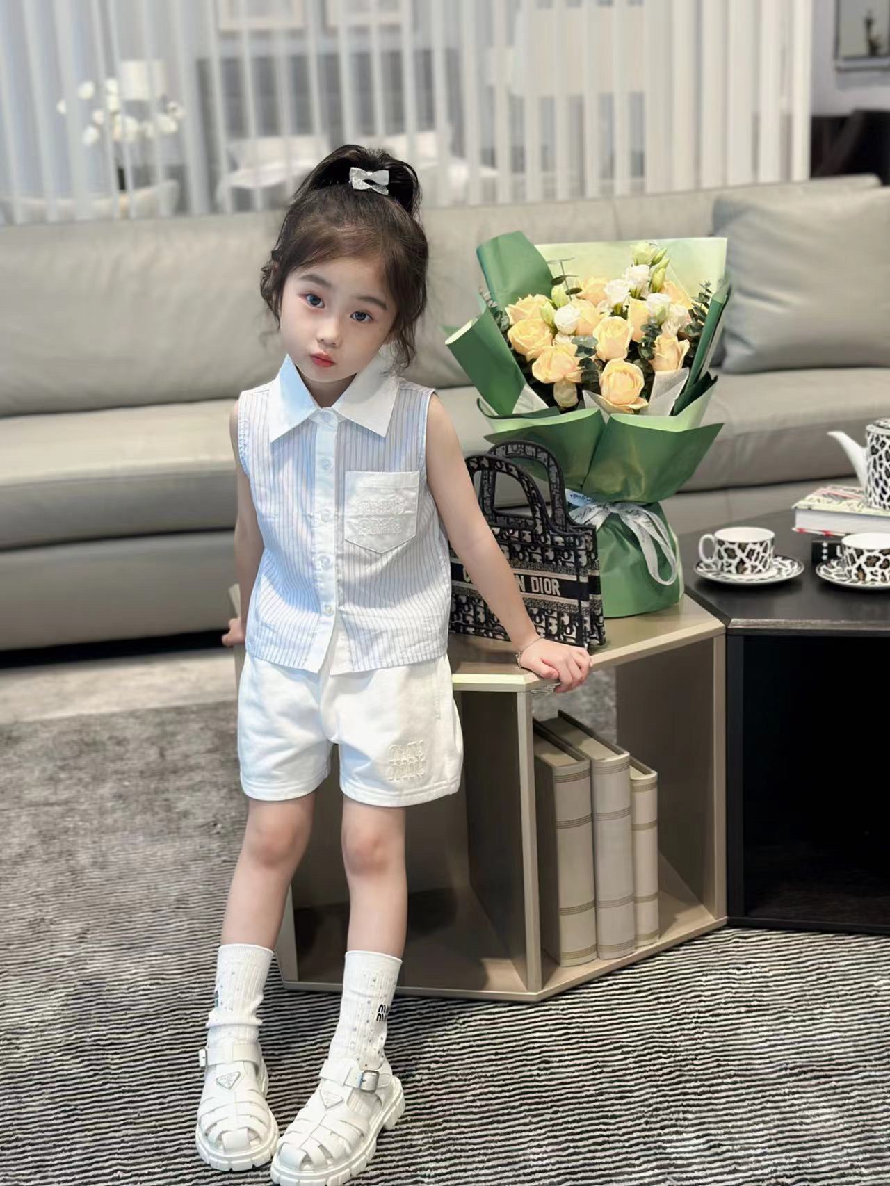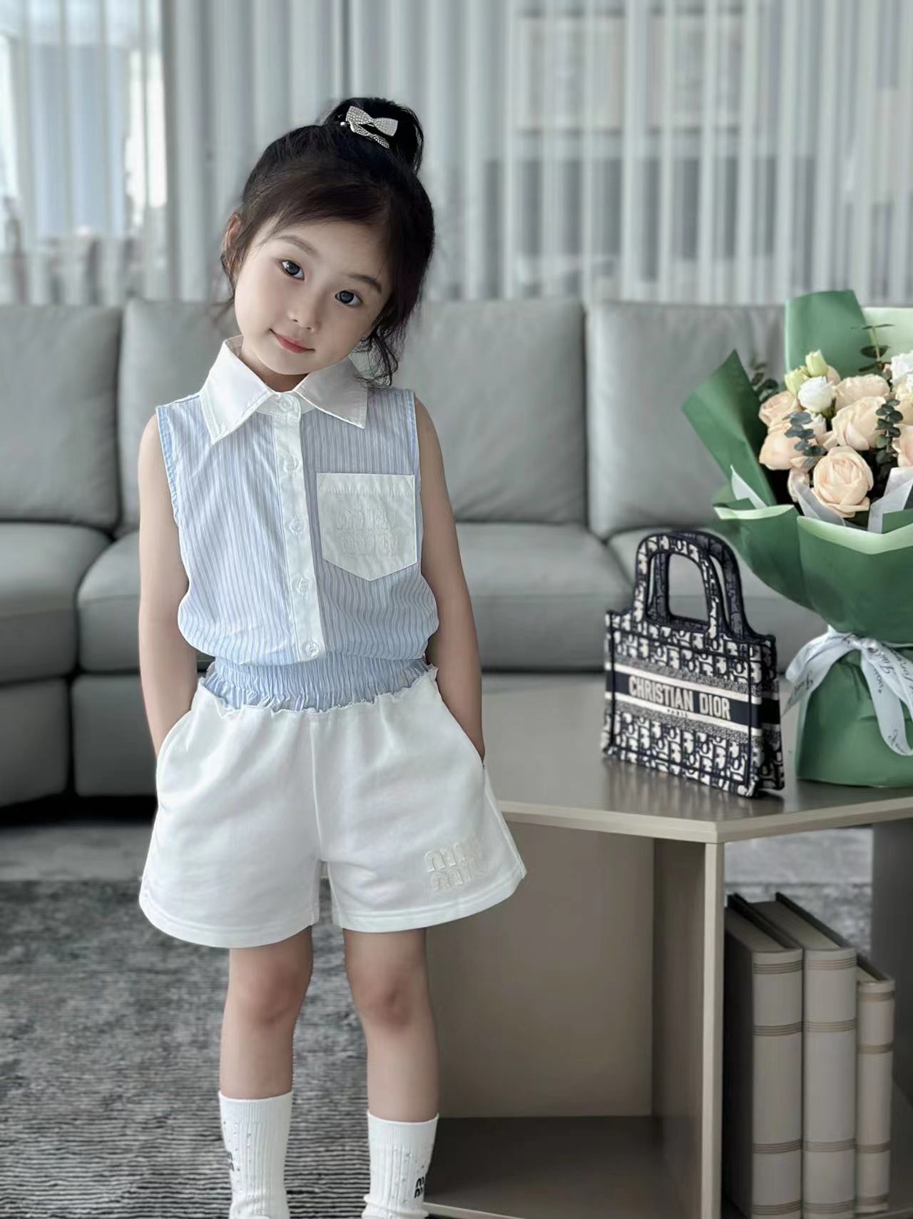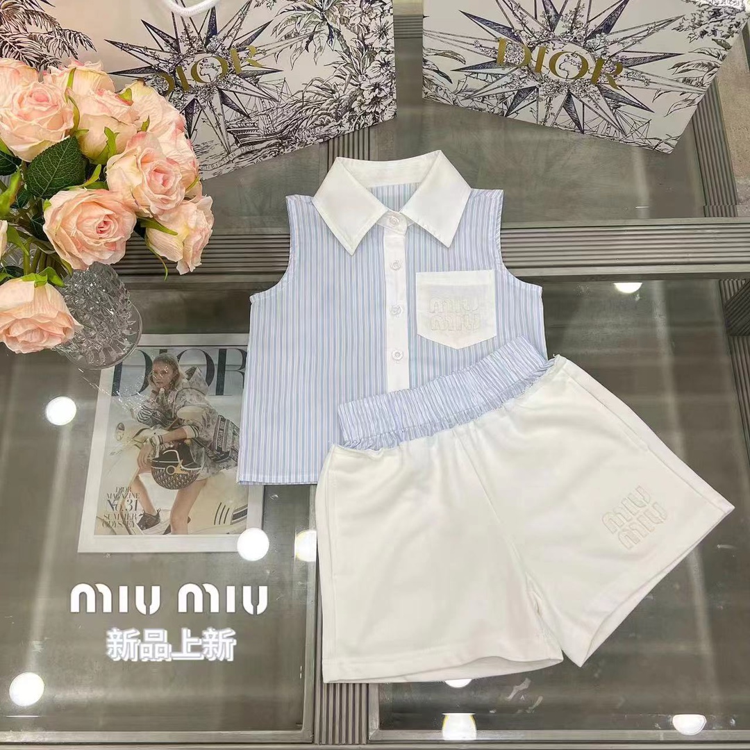 尺码:100-160cm 元套装无折 春夏新品 现货发售2024SS走秀款 miumiu 家 火爆套装 来袭,无袖设计清凉一夏!100% 纯棉,上身效果特别好看!