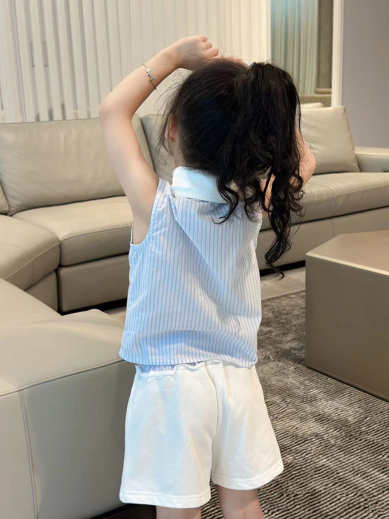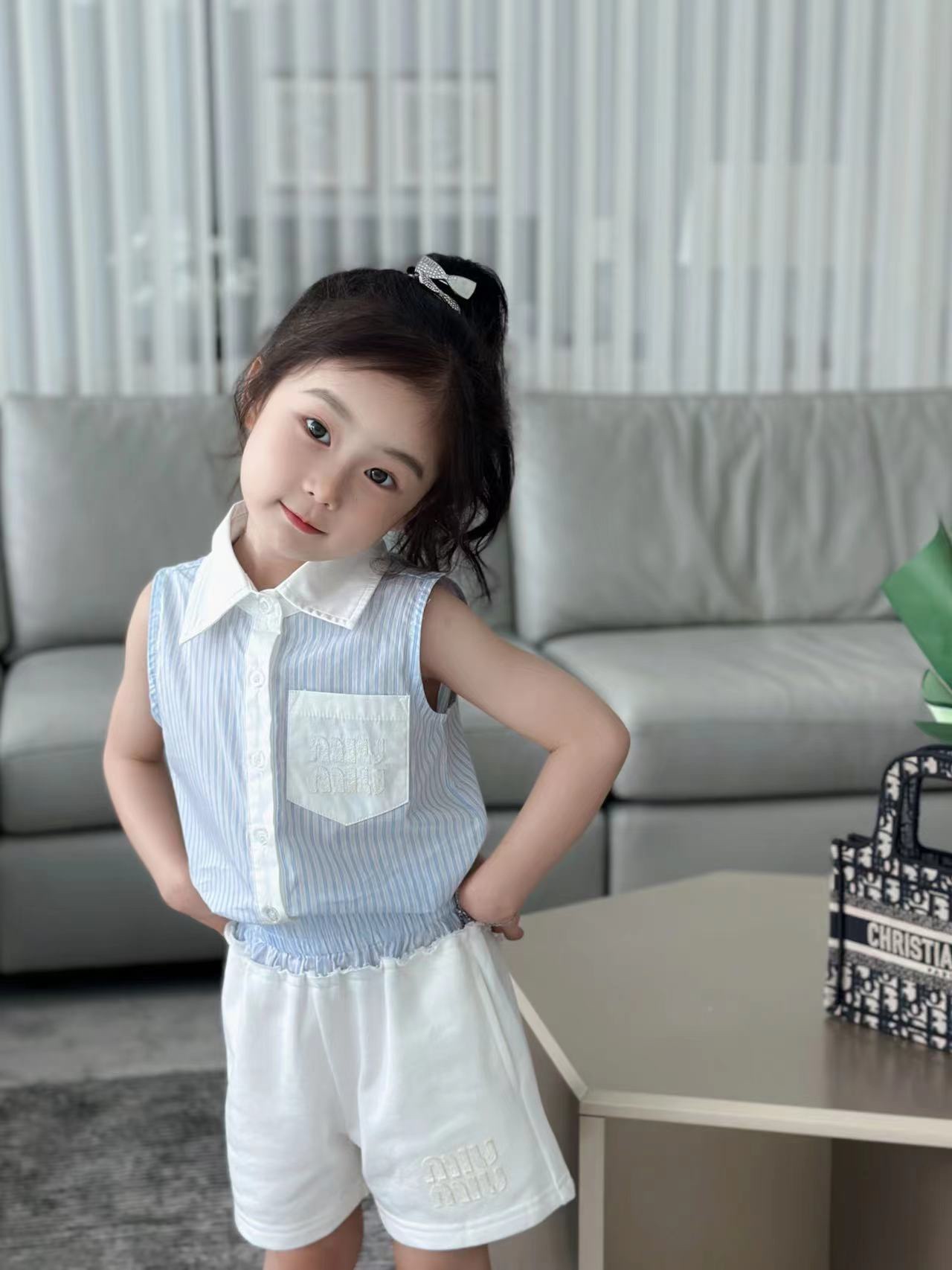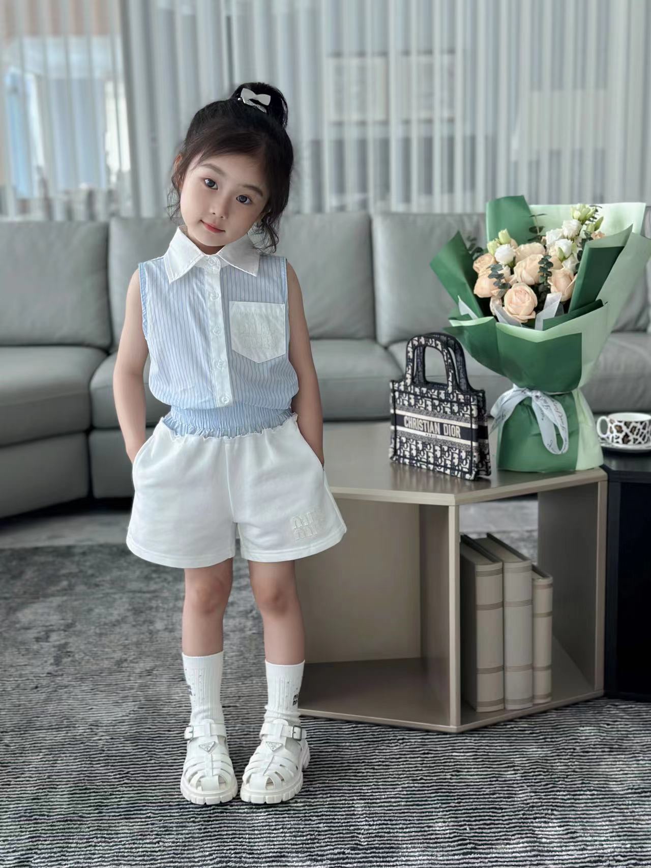 尺码:100-160cm 元套装无折 春夏新品 现货发售2024SS走秀款 miumiu 家 火爆套装 来袭,无袖设计清凉一夏!100% 纯棉,上身效果特别好看!