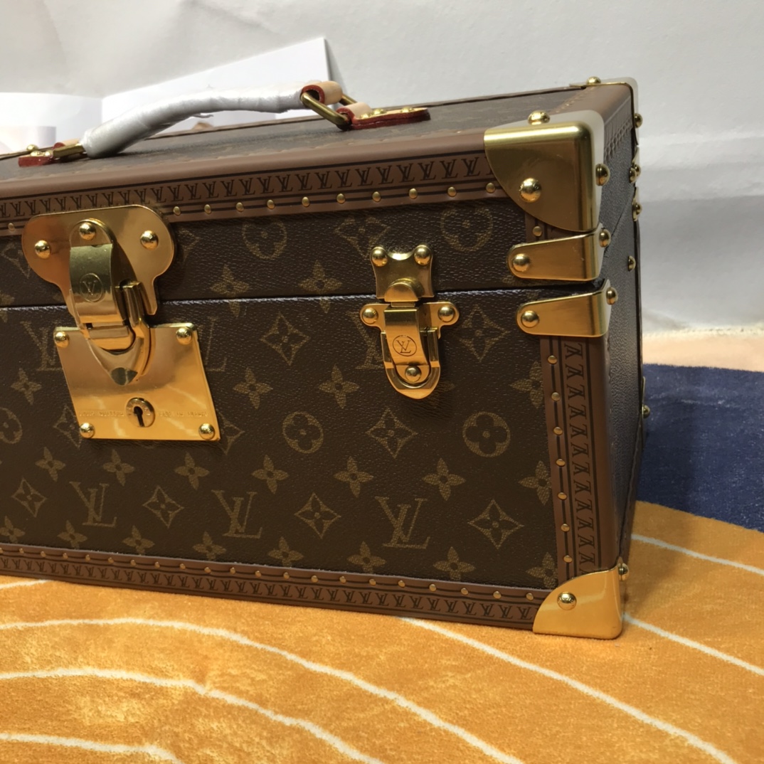 带镜化妆箱 这款Monogram帆布化妆箱的盖子暗藏镜子。内部采用可水洗质料,设有十四个瓶架,是旅行的理想配件。 42.0 x 23.0 x 21.0 cm (长 x 高 x 宽) – Monogram帆布材质,天然牛皮手柄 – 金色金属配件 – 配有S形锁扣与钥匙,以及一对插锁 – 盒盖内侧配有一面镜子,带皮革扣带 – 金属包角,皮革饰边,配有钉饰Lv硬箱