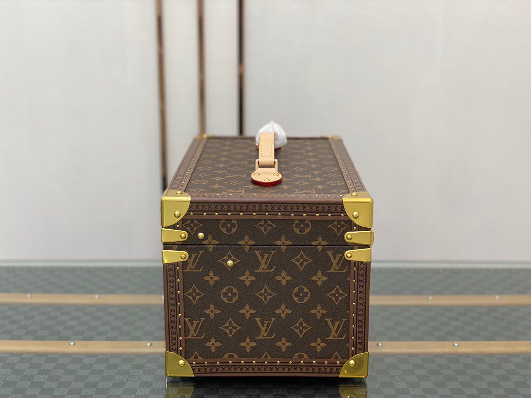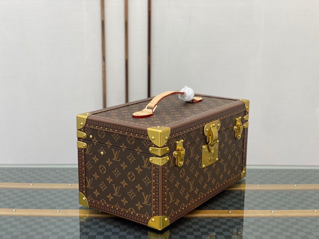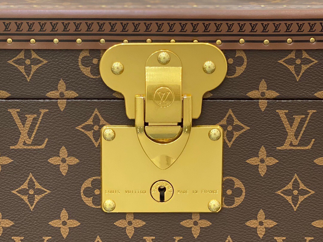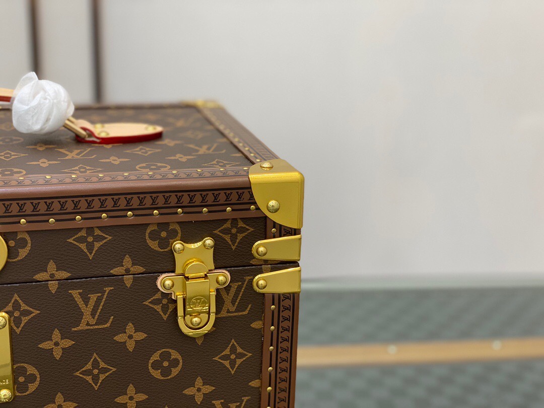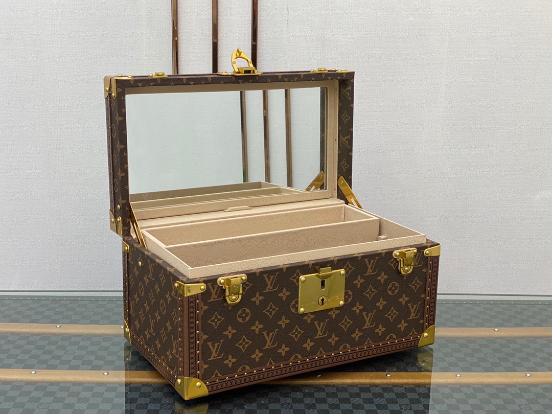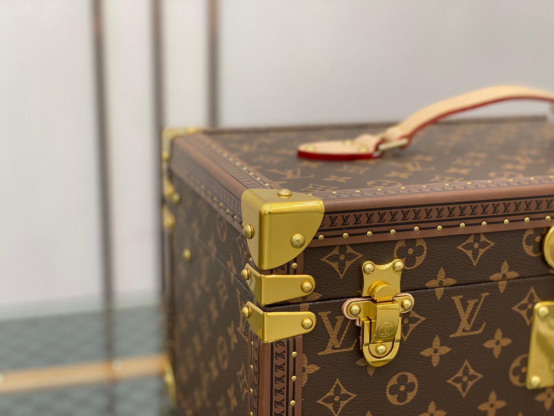 带镜化妆箱 老花配栗色 这款Monogram帆布化妆箱的盖子暗藏镜子。内部采用可水洗质料,设有十四个瓶架,是旅行的理想配件。 42.0 x 23.0 x 21.0 cm (长 x 高 x 宽) – Monogram帆布材质,天然牛皮手柄 – 金色金属配件 – 配有S形锁扣与钥匙,以及一对插锁 – 可水洗内衬,盒盖内侧配有一面镜子,14个瓶套,带皮革扣带 – 金属包角,皮革饰边,配有钉饰Lv硬箱
