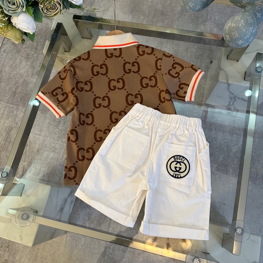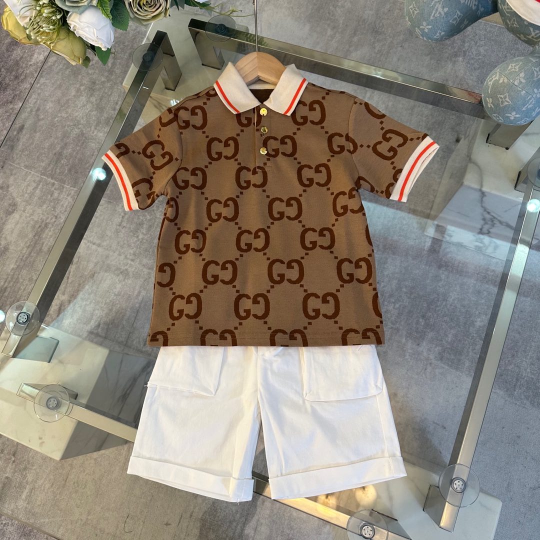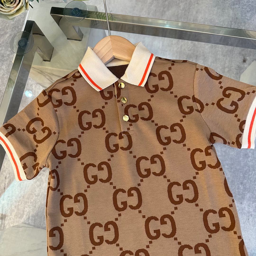 春夏款现货发售,出货三标齐全 尺码:100-110-120-130-140-150cm 元套装 单拿衣服无折 裤子无折 GG新款翻领Polo套装手感和做工堪称完美 纯棉面料 透气舒适微弹 版型挺括 翻领的设计在满足简约的风格上的需求同时,实穿性强,简约不简单!走线精致,话不多说,推荐入手