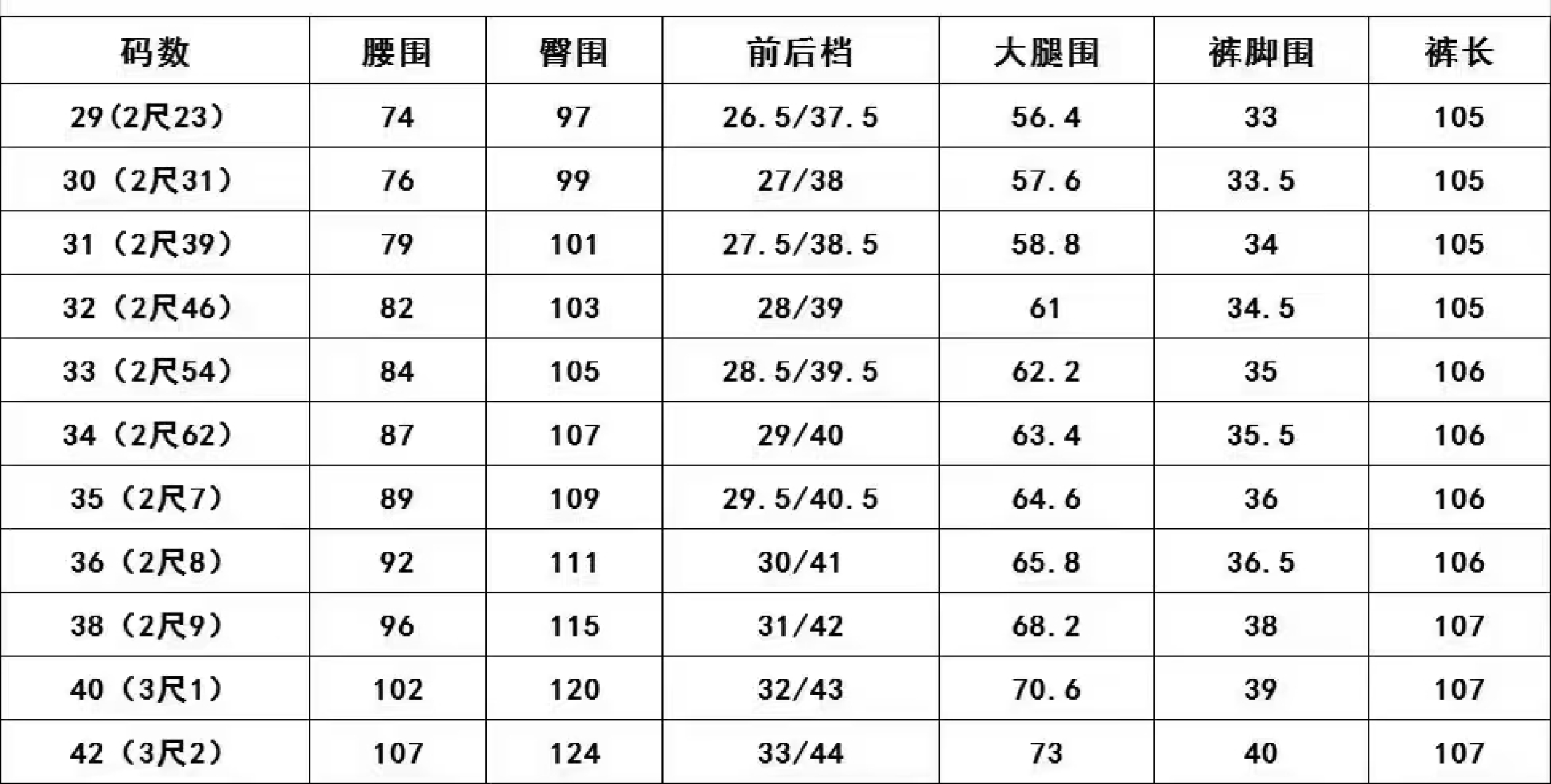 尺码29/30/31/32/33/34/35/36/38/40/42