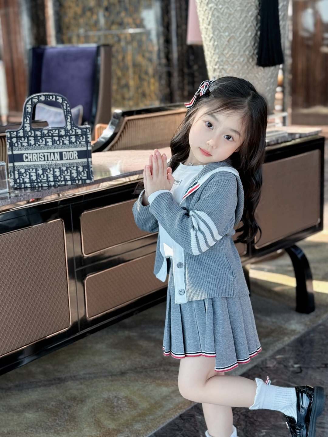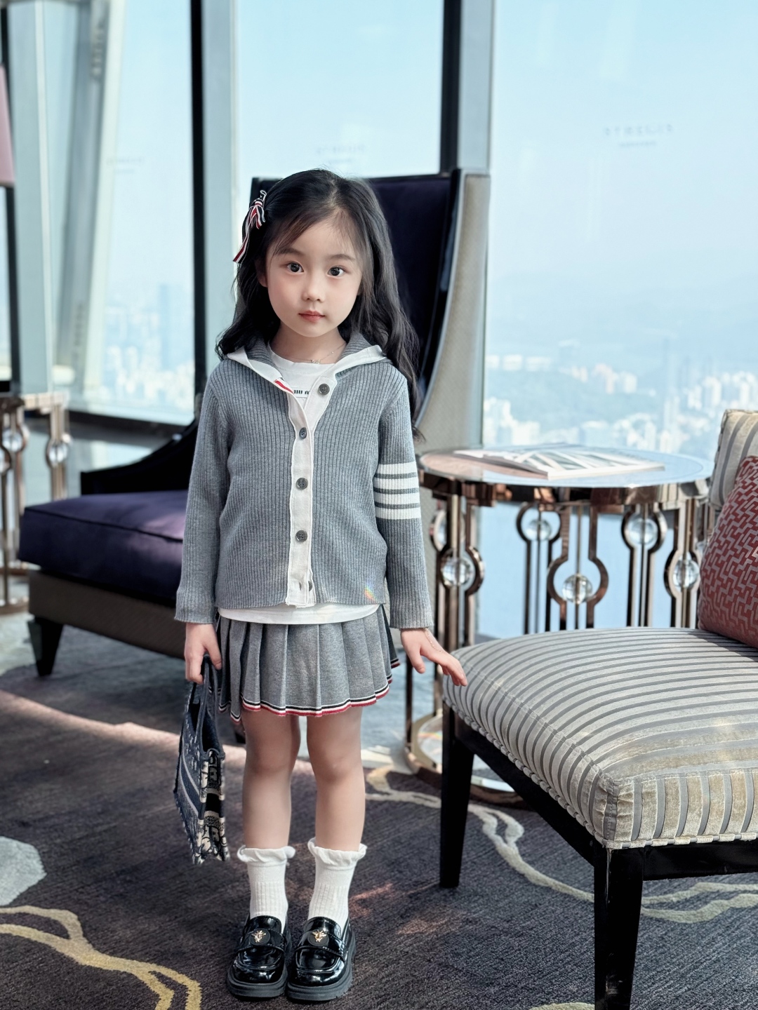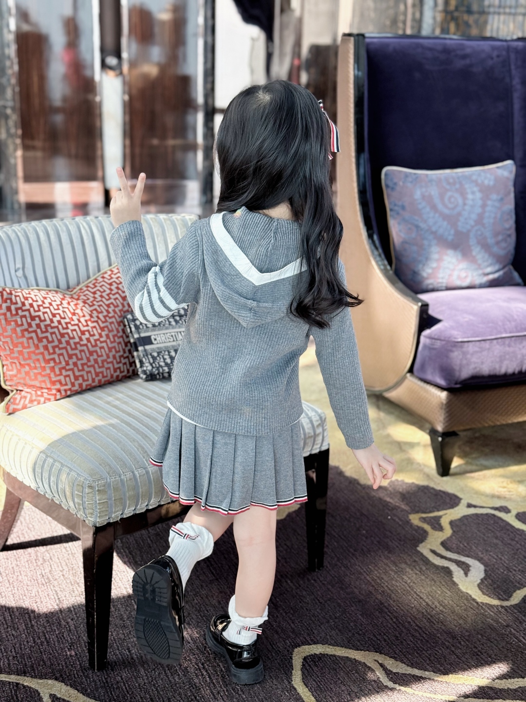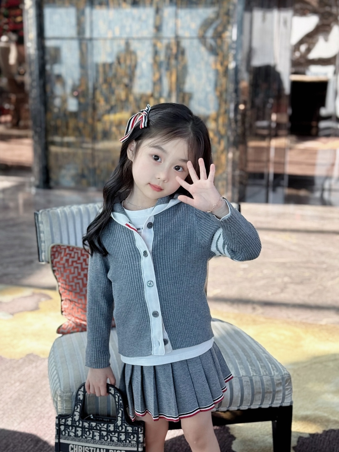 模特图!钱 TB这款灰色学院风毛衣套装,是春季日常搭配的理想选择,采用经典的设计,展现出青春活泼的气息,十分适合学校和休闲场合。 采用优雅的灰色,简洁大方,易于搭配,传递出浓厚的学院风格。无论是单穿还是叠搭,均显得格外时尚。 – 带帽开衫的设计,不仅保暖舒适,还增添了活泼感,适合各种天气变化,让孩子在户外活动时也能保持舒适。 – 袖口经典的四条杠提花设计,突显了学院风的正统感,独特的细节让整件套装更显层次! – 精选优质面料,使得毛衣柔软舒适,亲肤性良好,适合孩子娇嫩的肌肤,即使长时间穿着也不会感到不适。