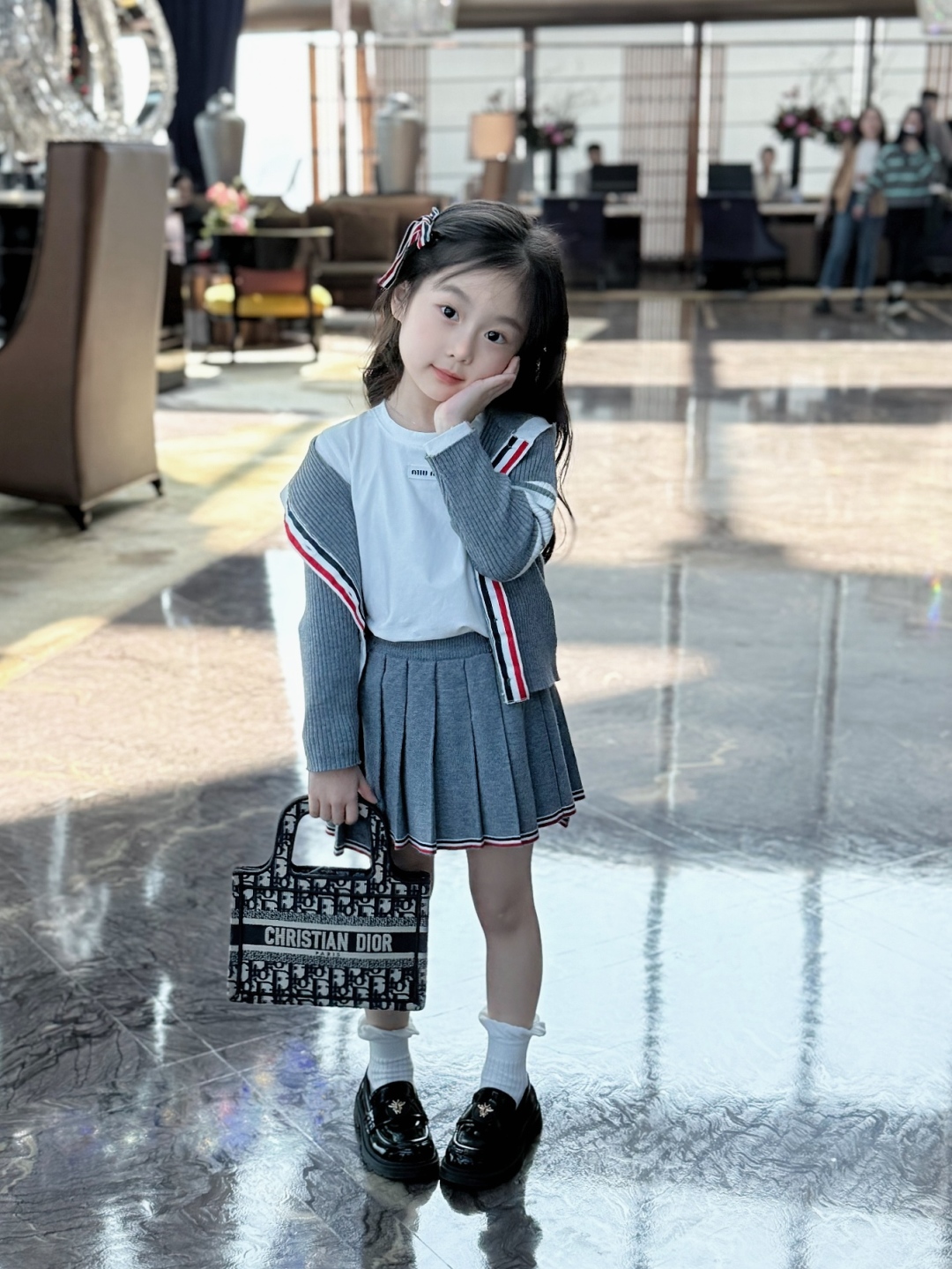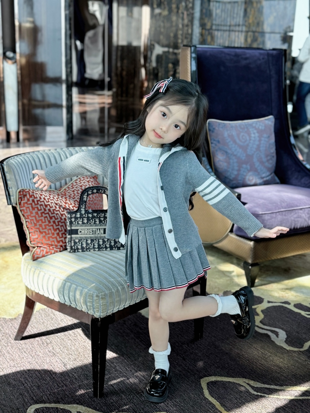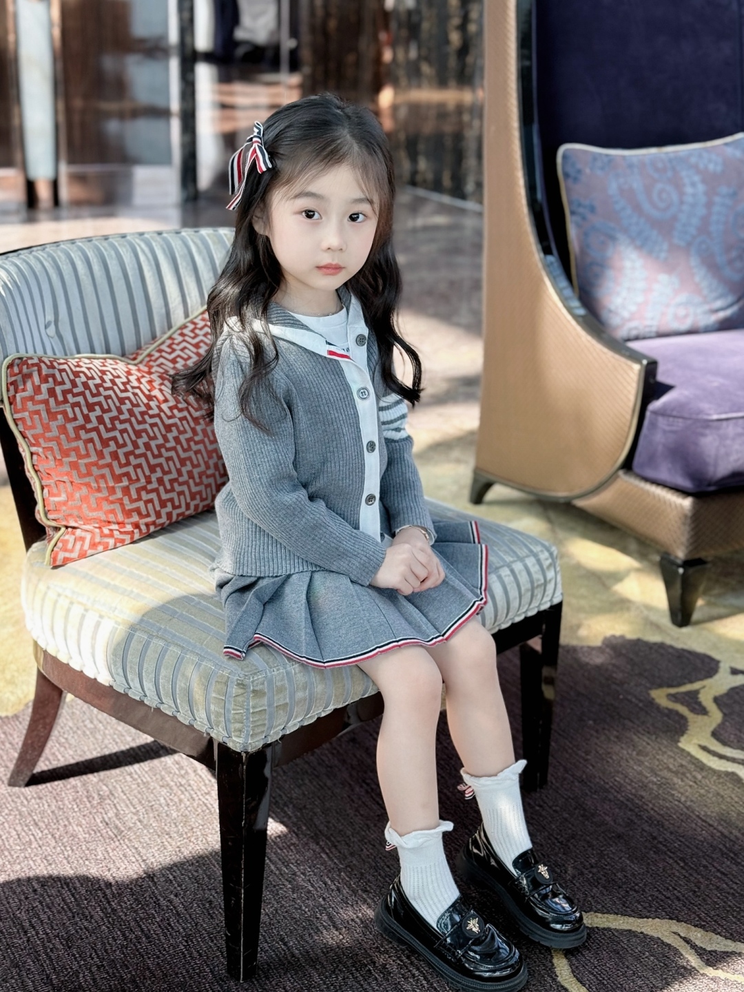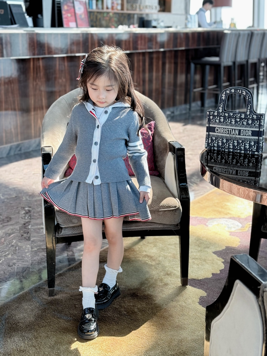 模特图!钱 TB这款灰色学院风毛衣套装,是春季日常搭配的理想选择,采用经典的设计,展现出青春活泼的气息,十分适合学校和休闲场合。 采用优雅的灰色,简洁大方,易于搭配,传递出浓厚的学院风格。无论是单穿还是叠搭,均显得格外时尚。 – 带帽开衫的设计,不仅保暖舒适,还增添了活泼感,适合各种天气变化,让孩子在户外活动时也能保持舒适。 – 袖口经典的四条杠提花设计,突显了学院风的正统感,独特的细节让整件套装更显层次! – 精选优质面料,使得毛衣柔软舒适,亲肤性良好,适合孩子娇嫩的肌肤,即使长时间穿着也不会感到不适。