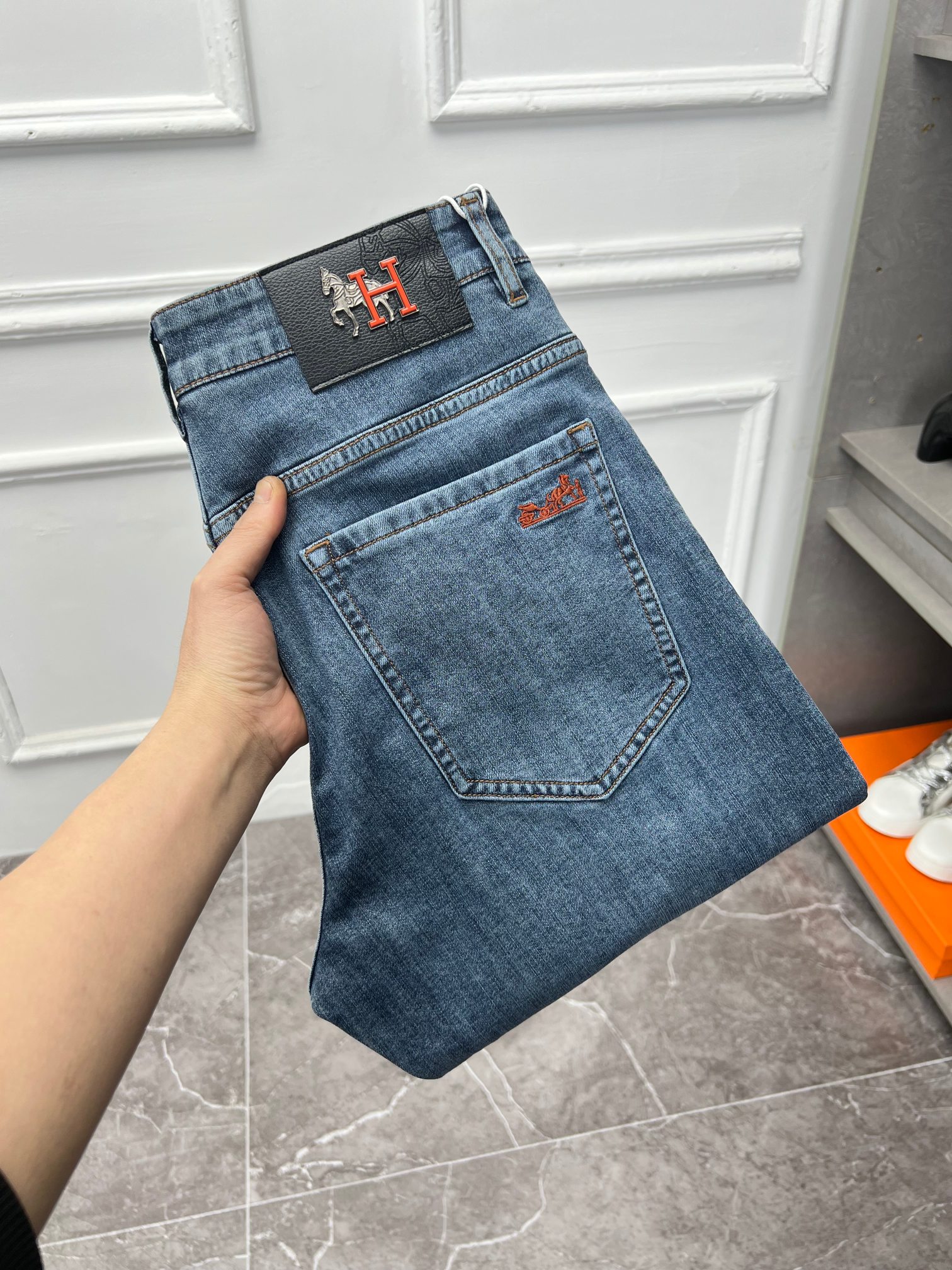 爱马仕 新款来袭新春爆款新品 专柜有售 实体店极品牛仔裤 专柜原版1:1好货,适合各个年龄段。市场最高版本的欧洲进口面料。舒适柔软亲肤,上身效果超级棒时尚百搭,笔挺有型,衣橱必备!适合任何场合穿着 尺码:29-42