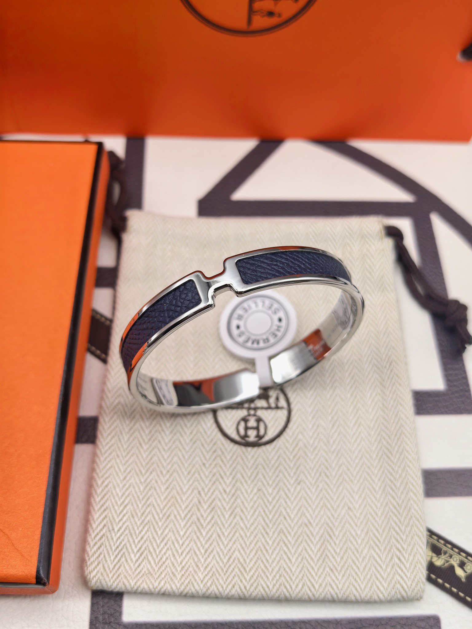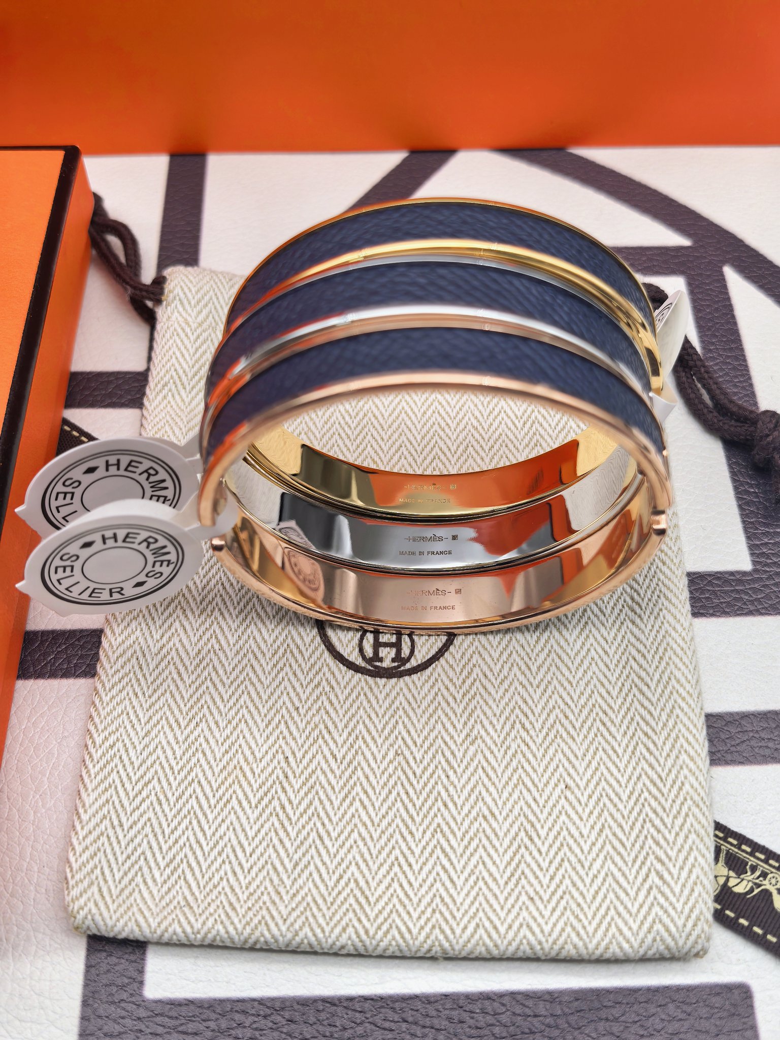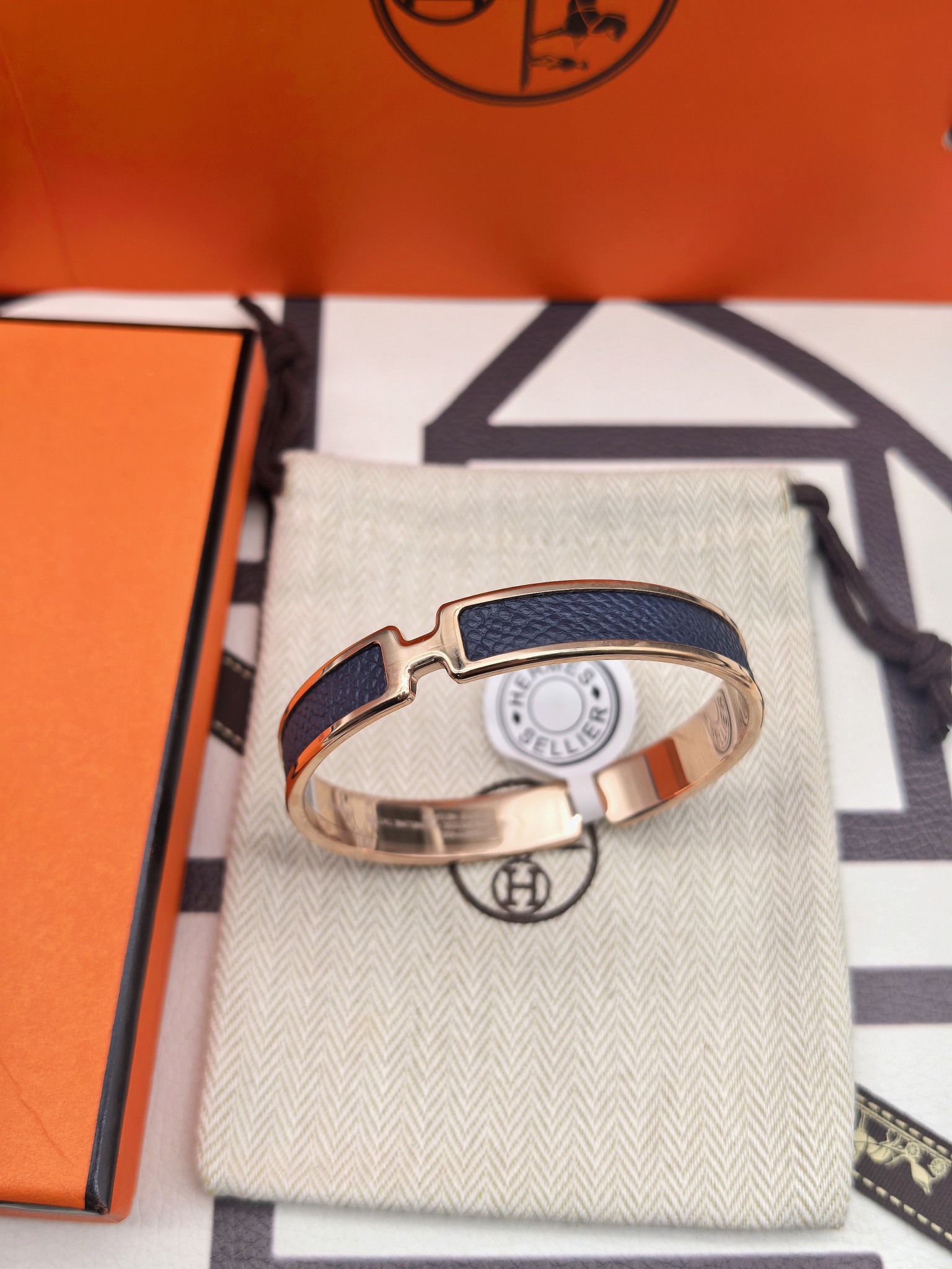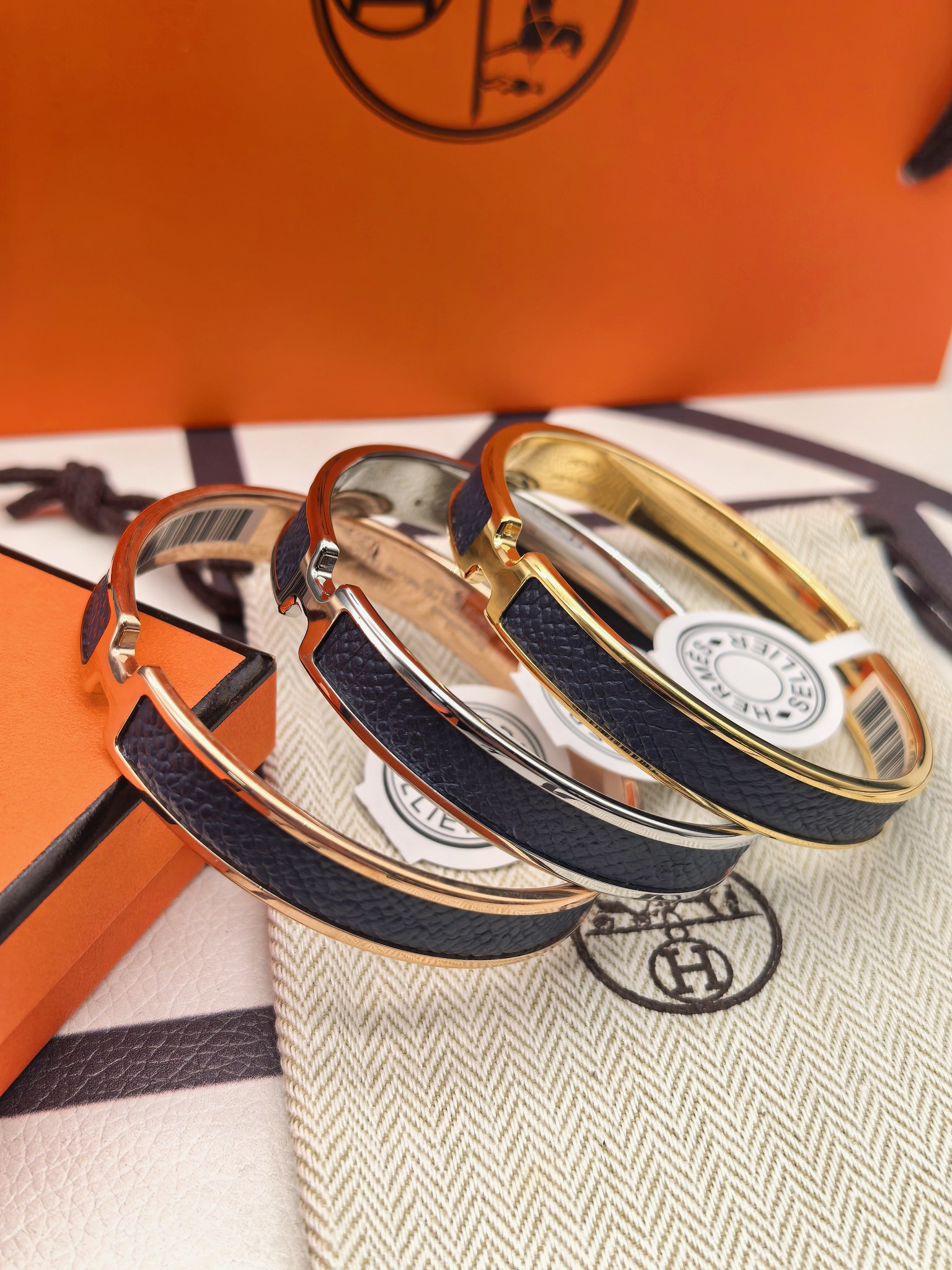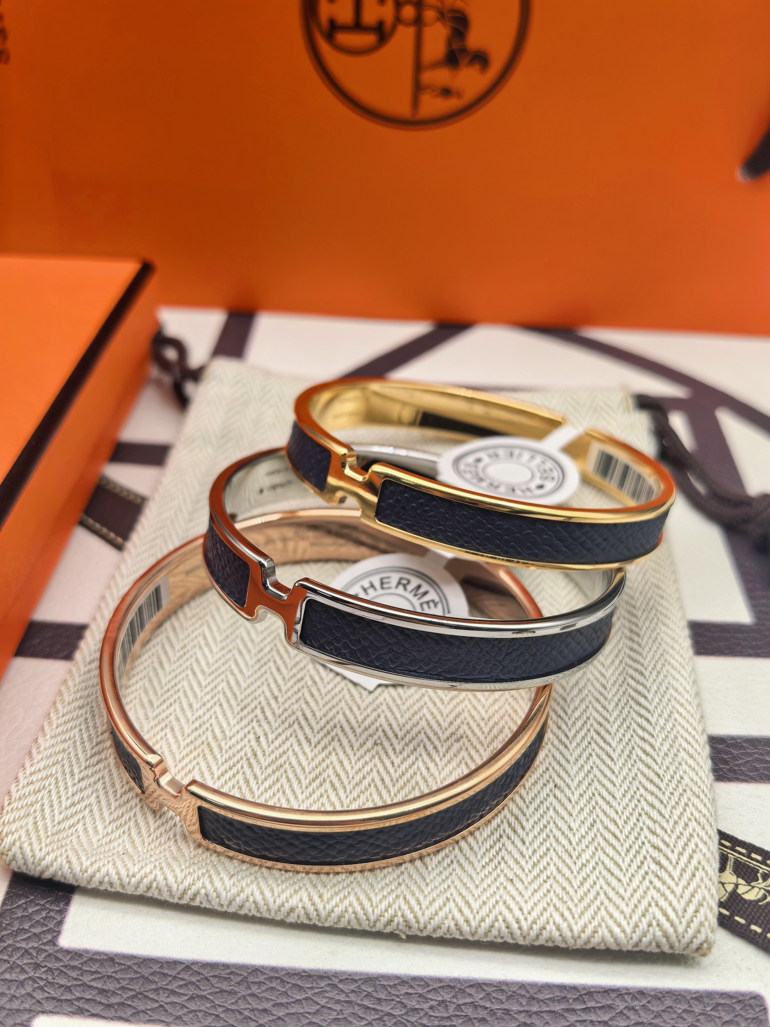 爱马仕深蓝色皮手镯 新款 版本:升级款 (高) 材料:小牛皮(高成本) 细节:采用原版手镯开版,皮采用内粘工艺,做到不起边,更牢固,精工抛光工艺,光泽度饱满,激光原版刻字,立体清晰。 尺寸:18(统一尺寸 颜色:玫瑰金 金色 银色 图片包装➕