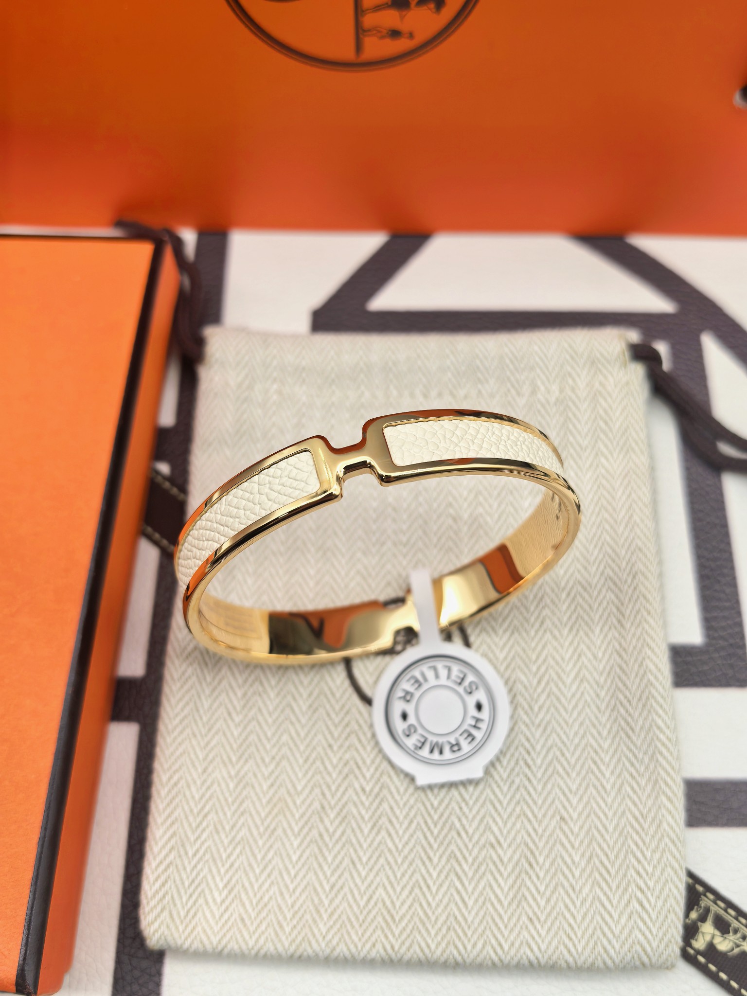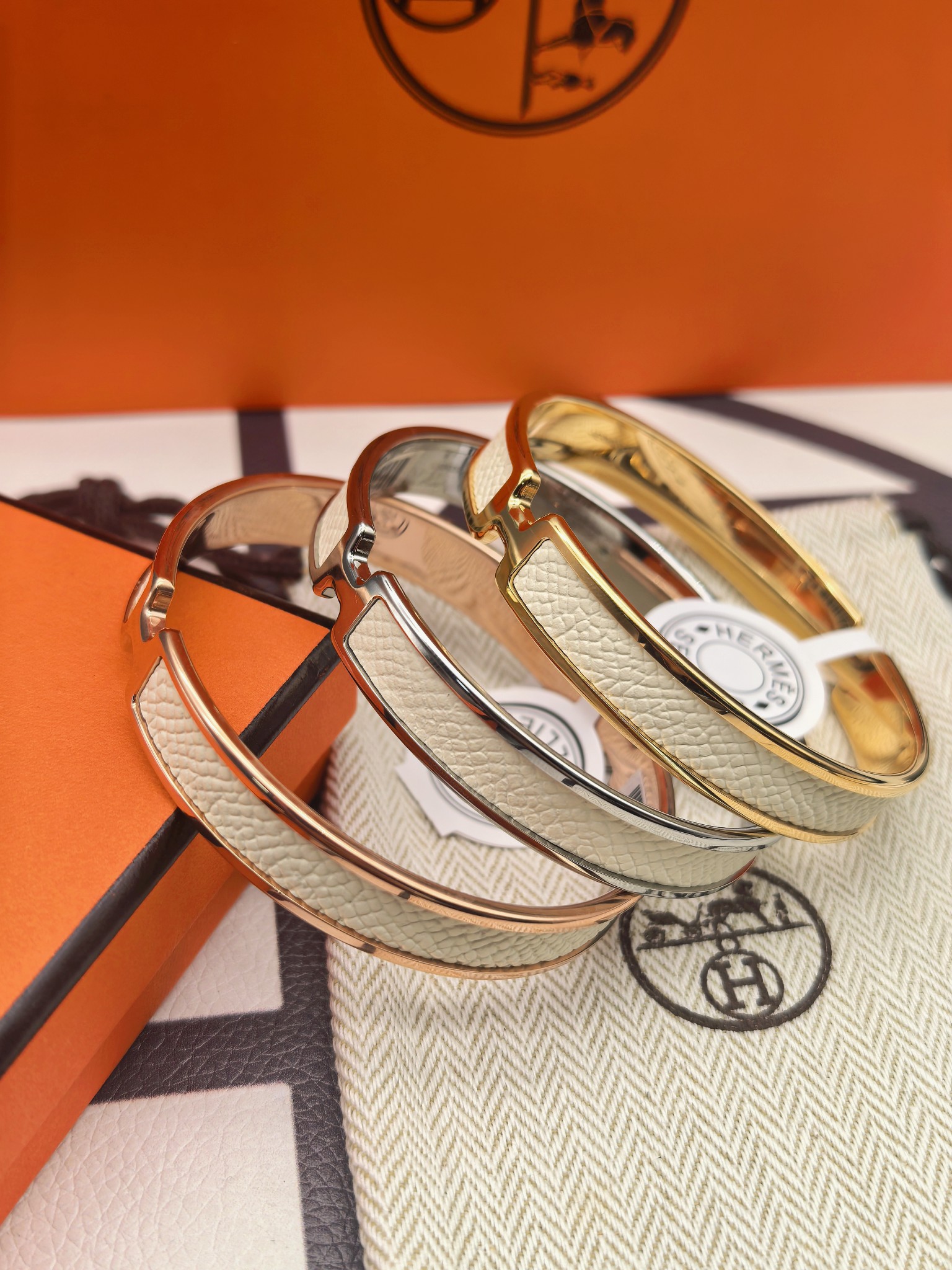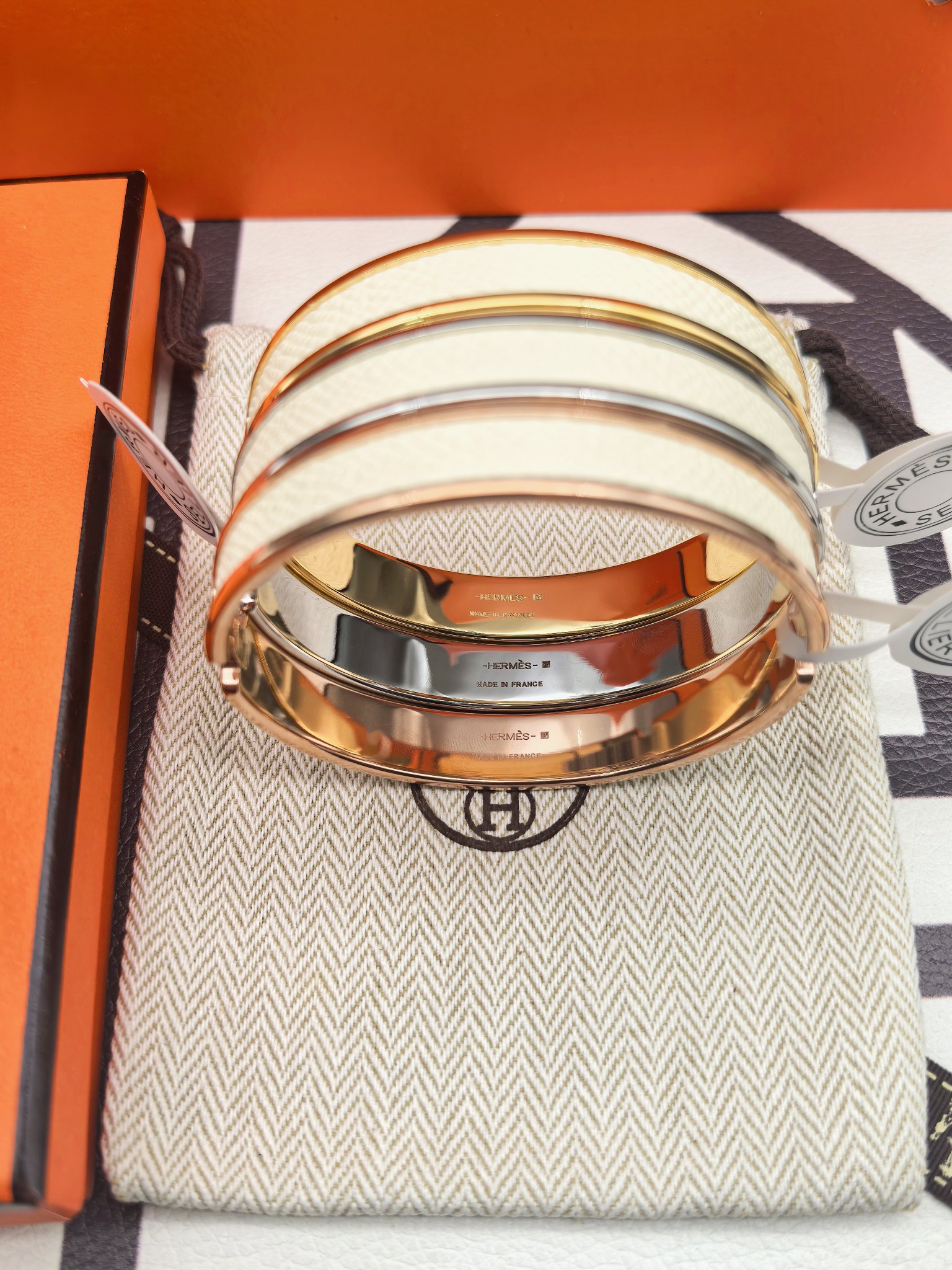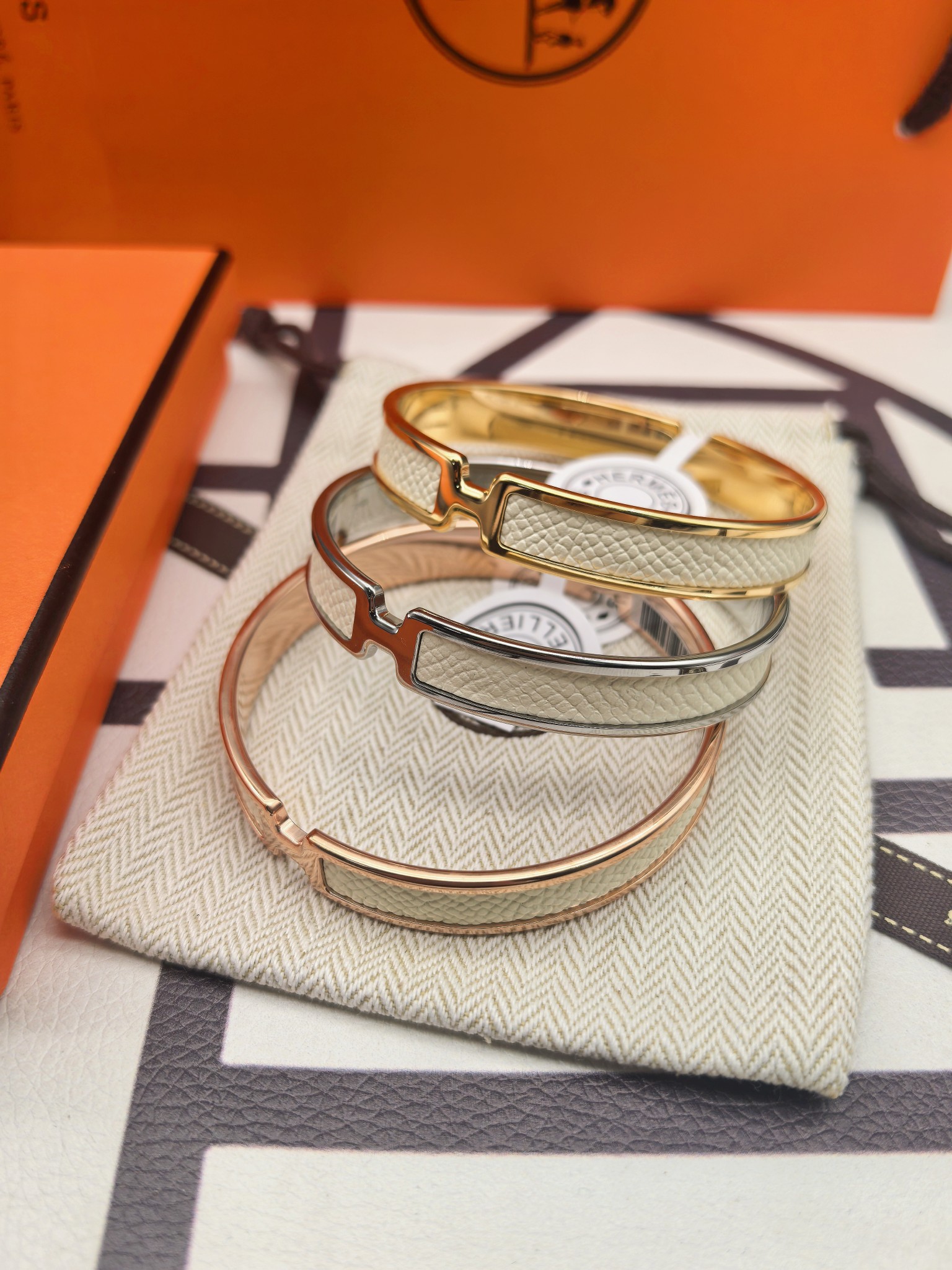 爱马仕白色皮手镯 新款 版本:升级款 (高) 材料:小牛皮(高成本) 细节:采用原版手镯开版,皮采用内粘工艺,做到不起边,更牢固,精工抛光工艺,光泽度饱满,激光原版刻字,立体清晰。 尺寸:18(统一尺寸 颜色:玫瑰金 金色 银色 图片包装➕