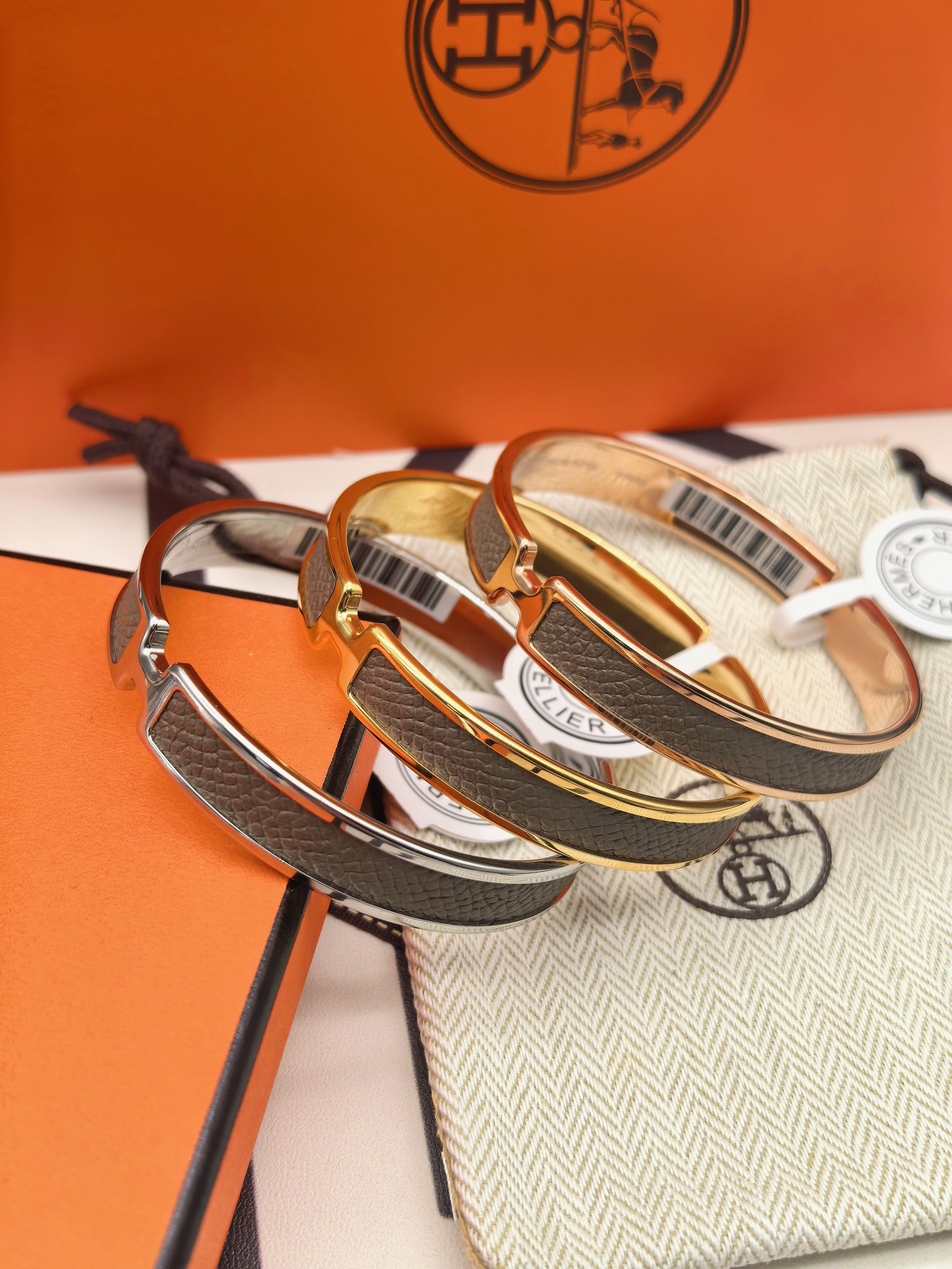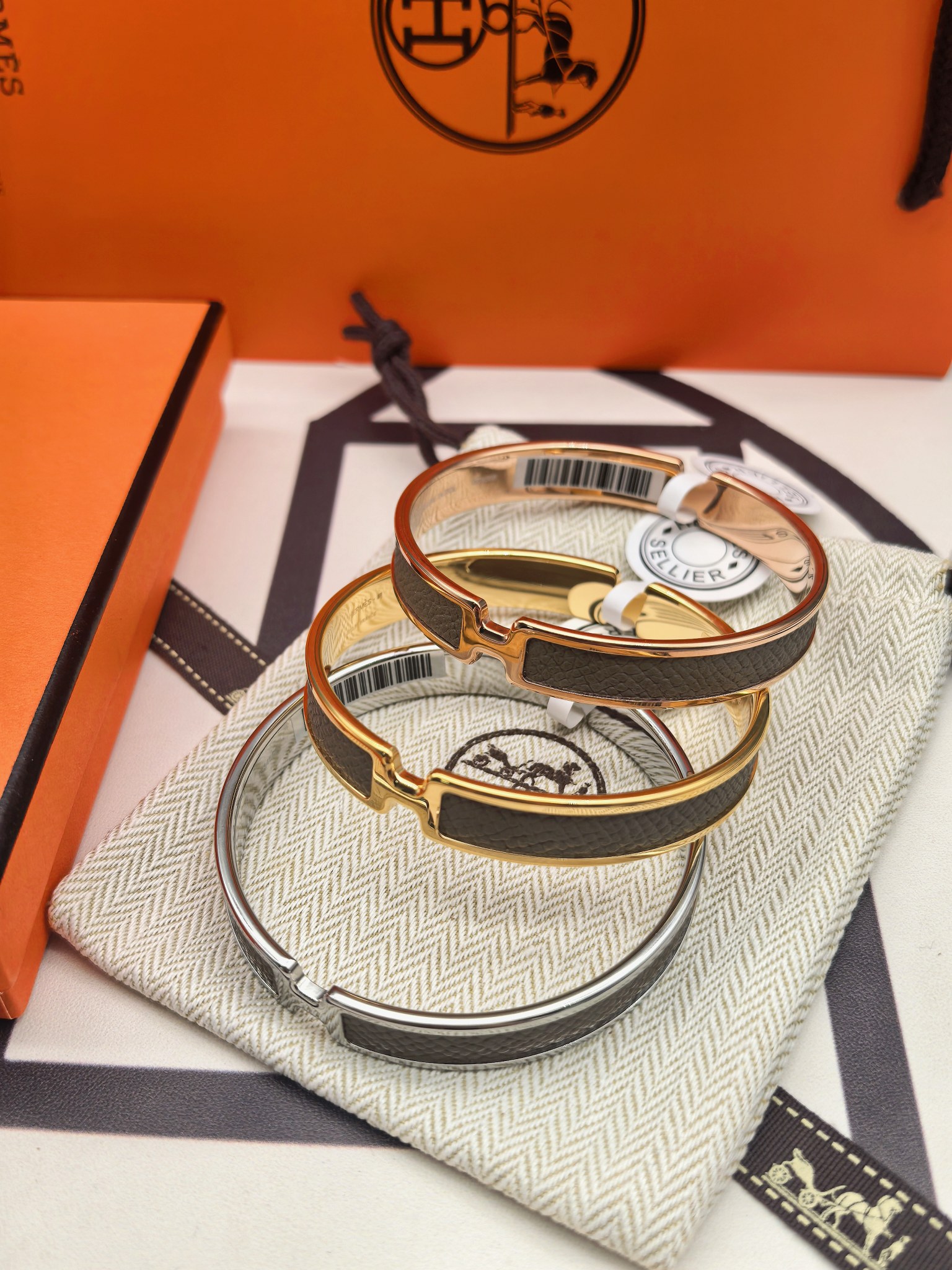 爱马仕褐色皮手镯 新款 版本:升级款 (高) 材料:小牛皮(高成本) 细节:采用原版手镯开版,皮采用内粘工艺,做到不起边,更牢固,精工抛光工艺,光泽度饱满,激光原版刻字,立体清晰。 尺寸:18(统一尺寸 颜色:玫瑰金 金色 银色 图片包装➕