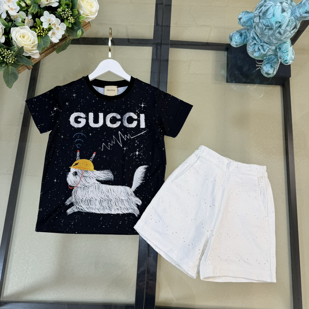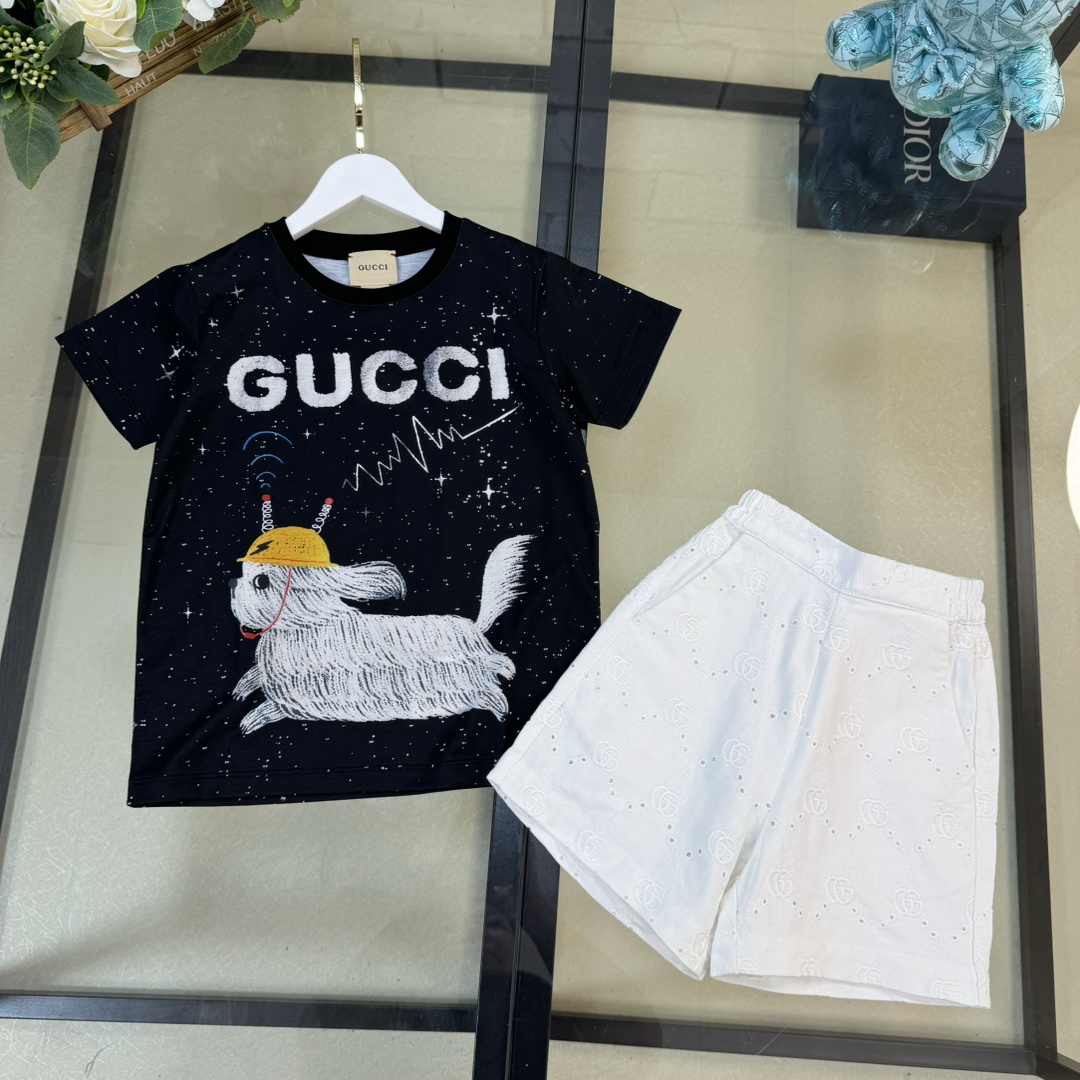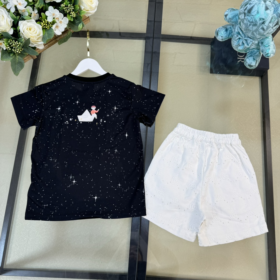 独家首发 高端童装 尺码:100-160 无折一套 CU*CCl 24/新款 童装 夜空繁星信号小狗狗logo图案前后印花圆领短袖T恤+短裤 男女宝宝同款 码数100-150cm
