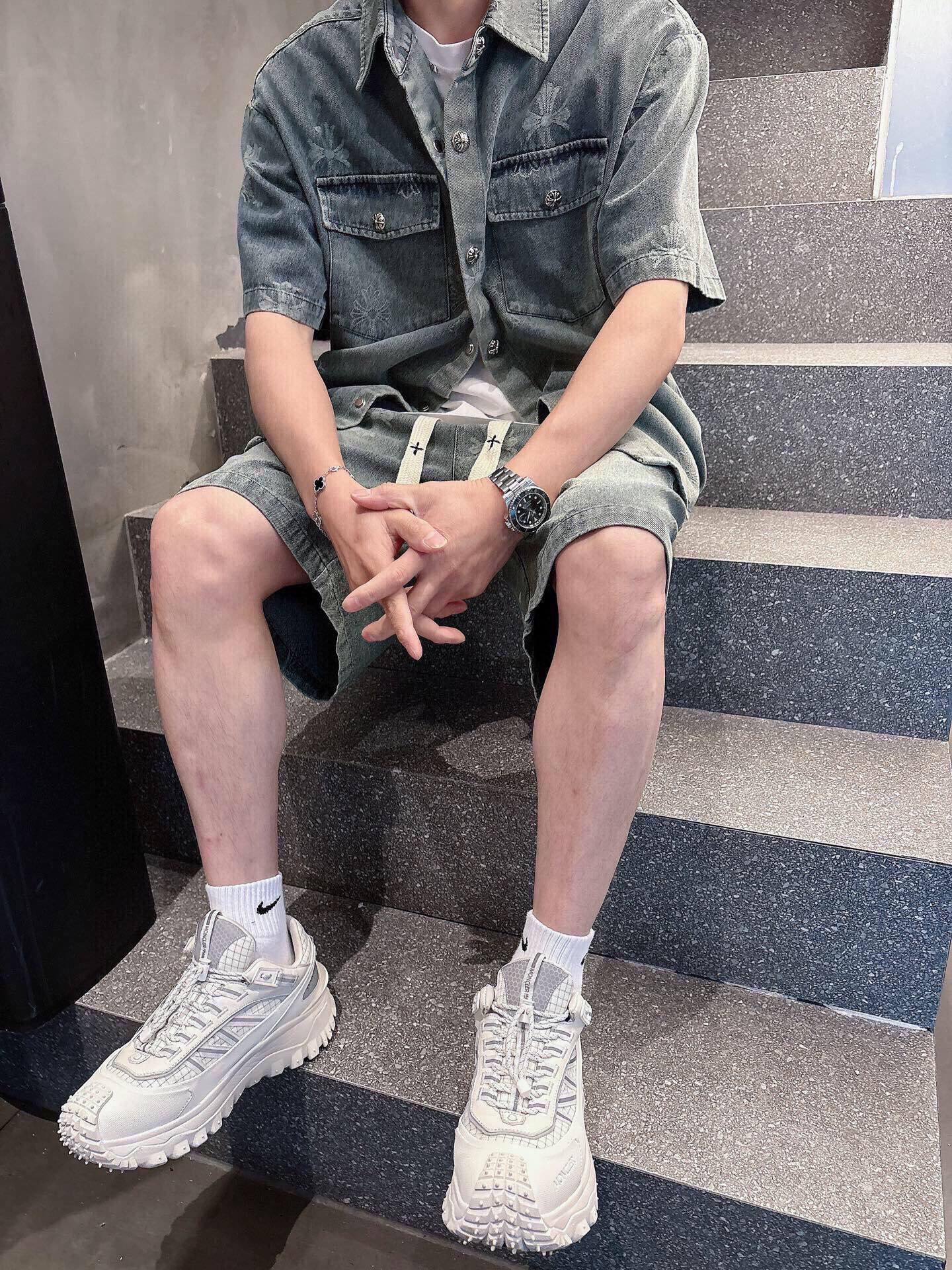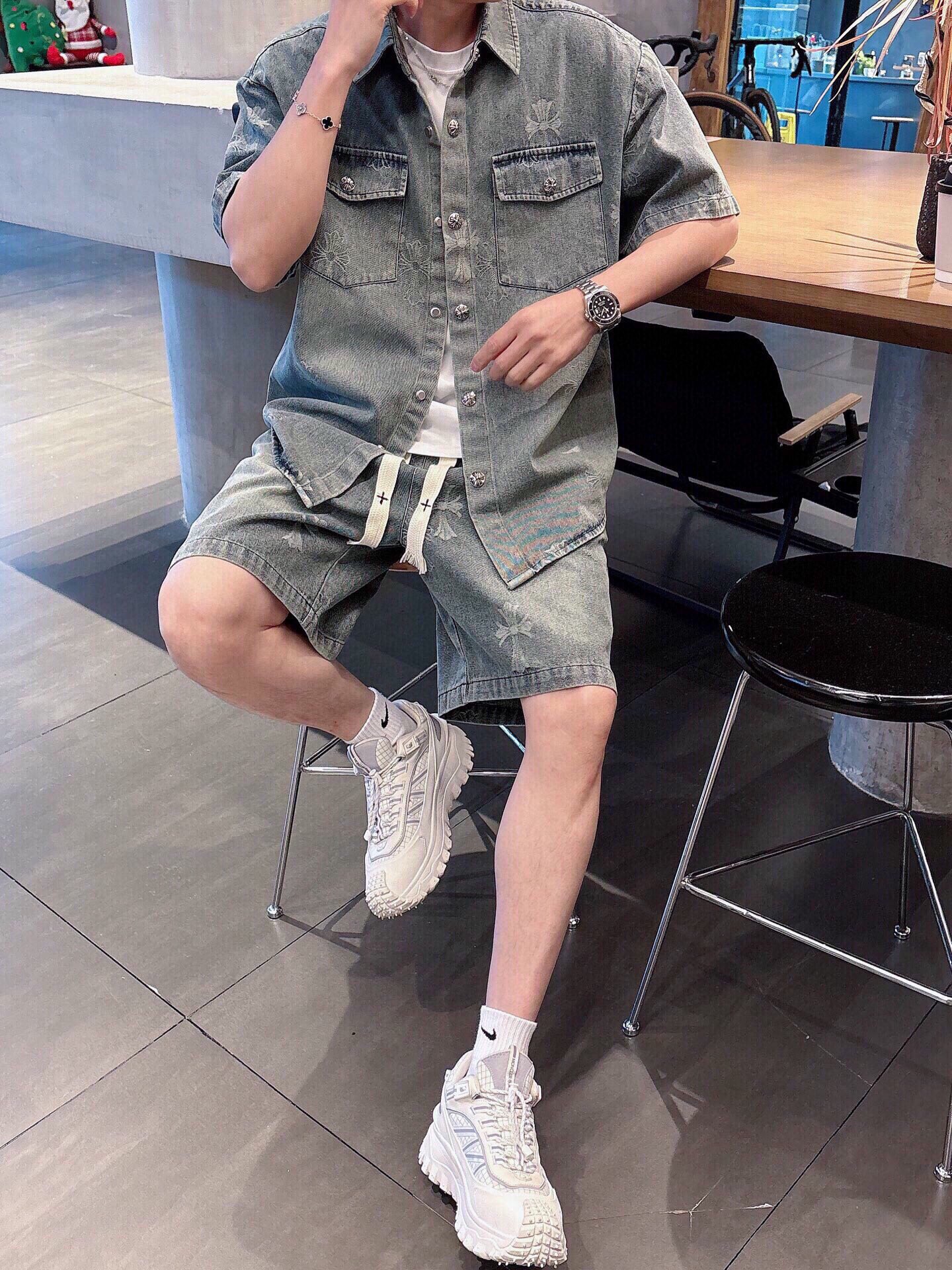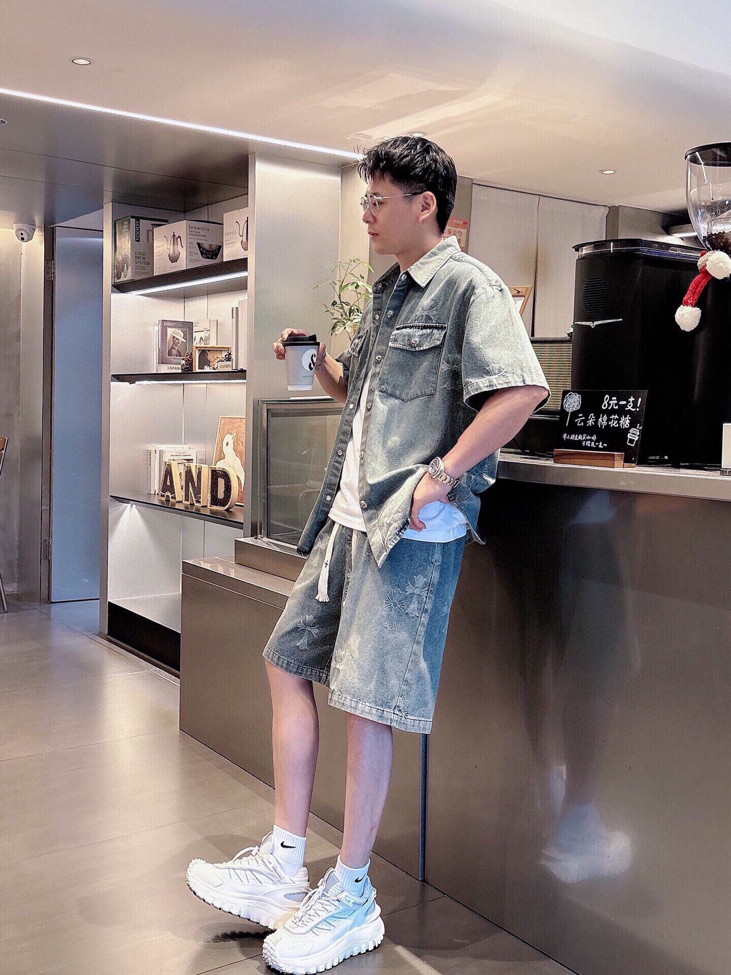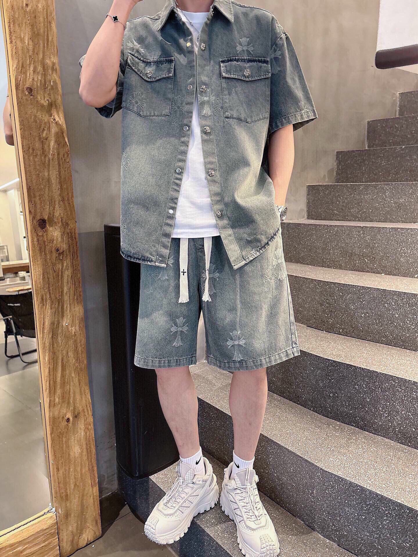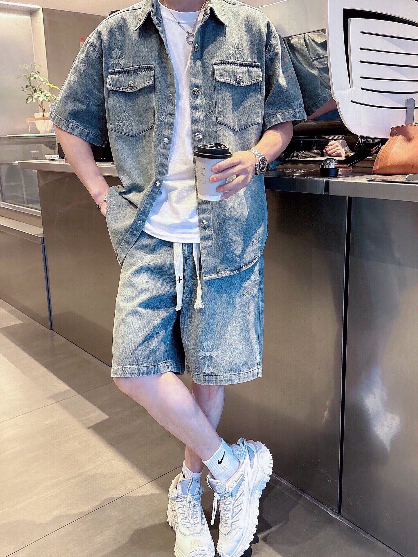 短裤 上衣 《克罗心系列提花牛仔短袖套装》 高端版本!专柜定制最新面料,定织定染的洗水牛仔。轻薄透气时尚个性,细节无可挑剔,品牌元素设计理念,体现高品质。呈现休闲裁剪,上身版型超赞!情侣 穿非常洋气!