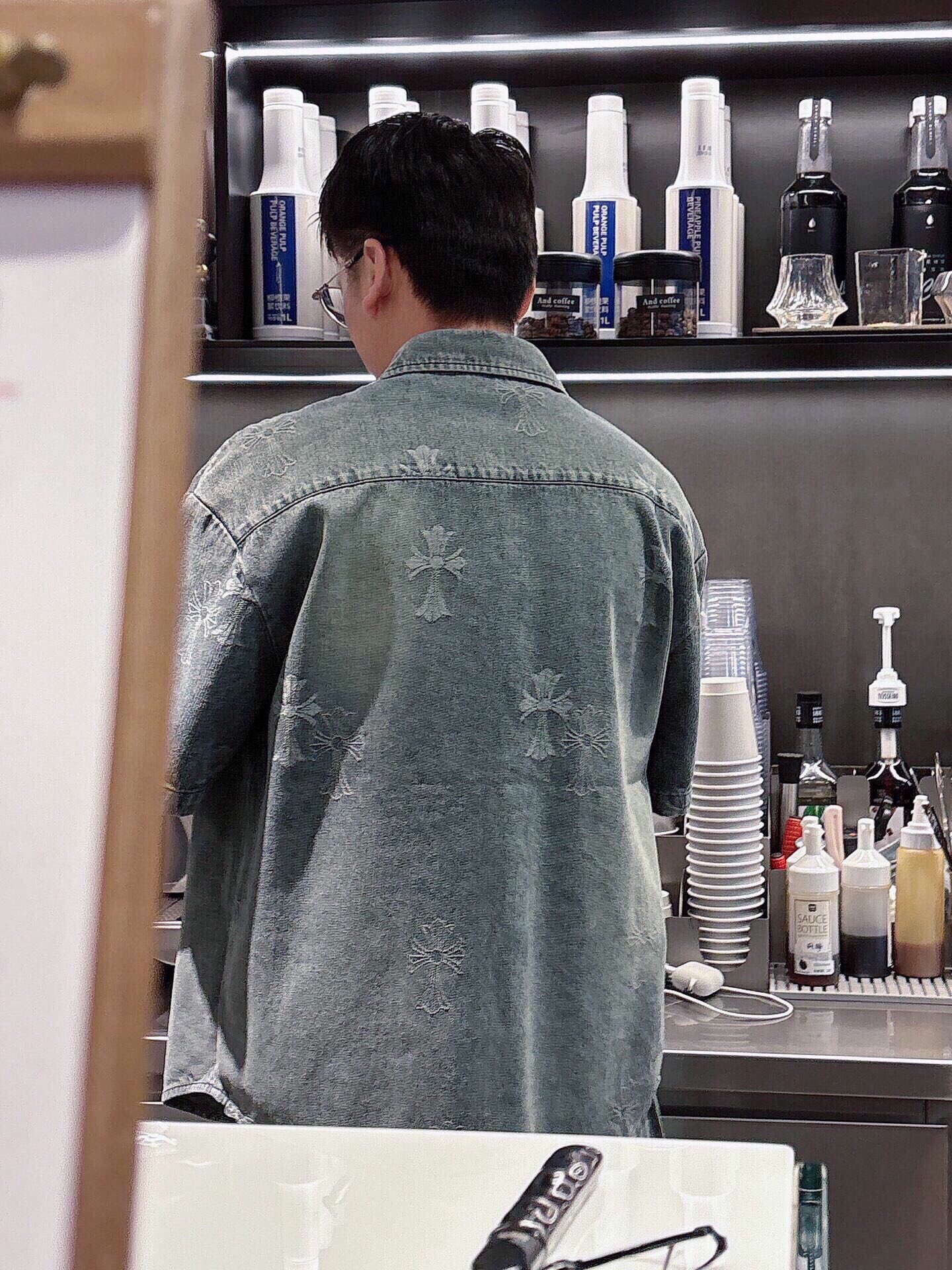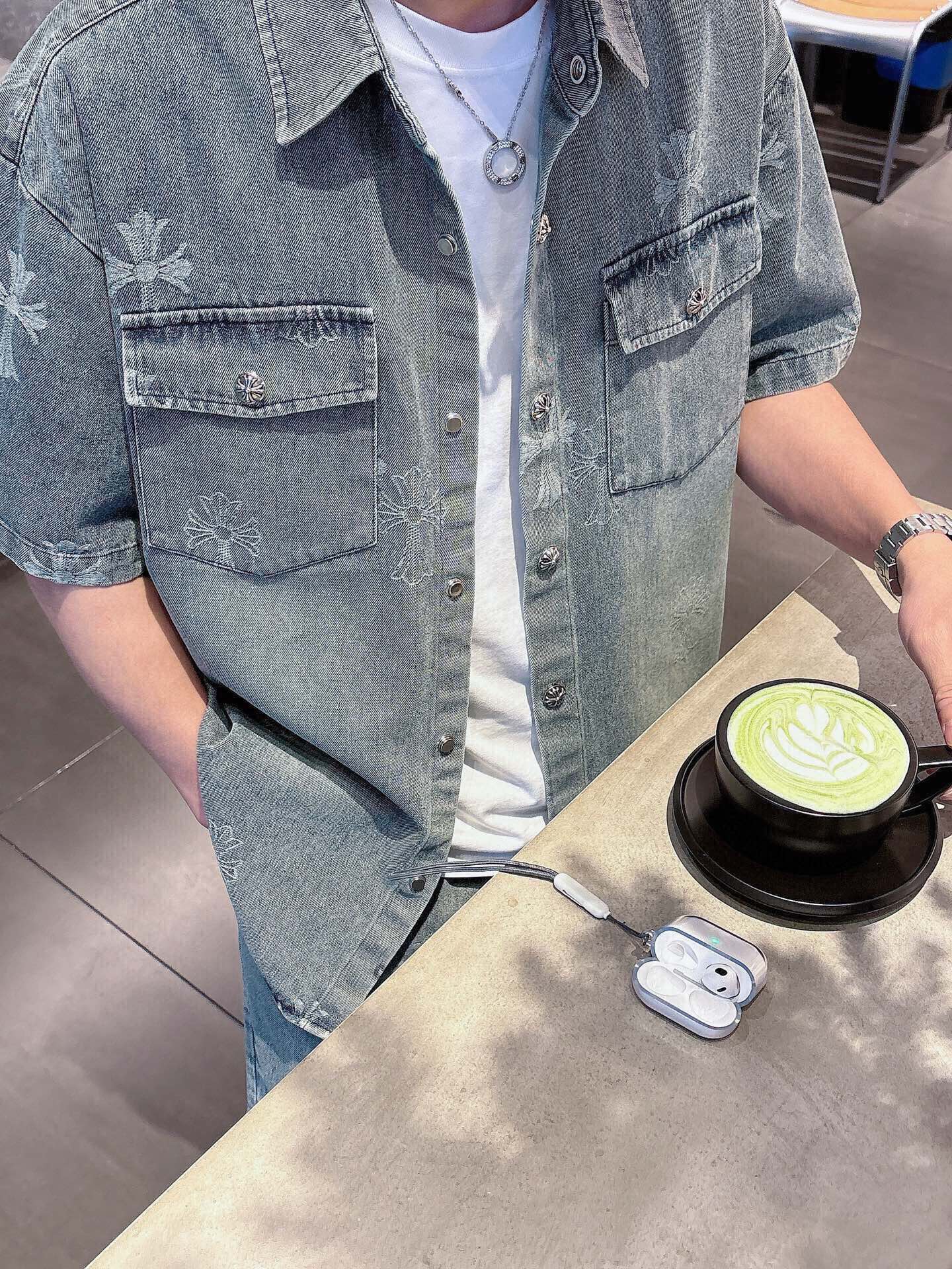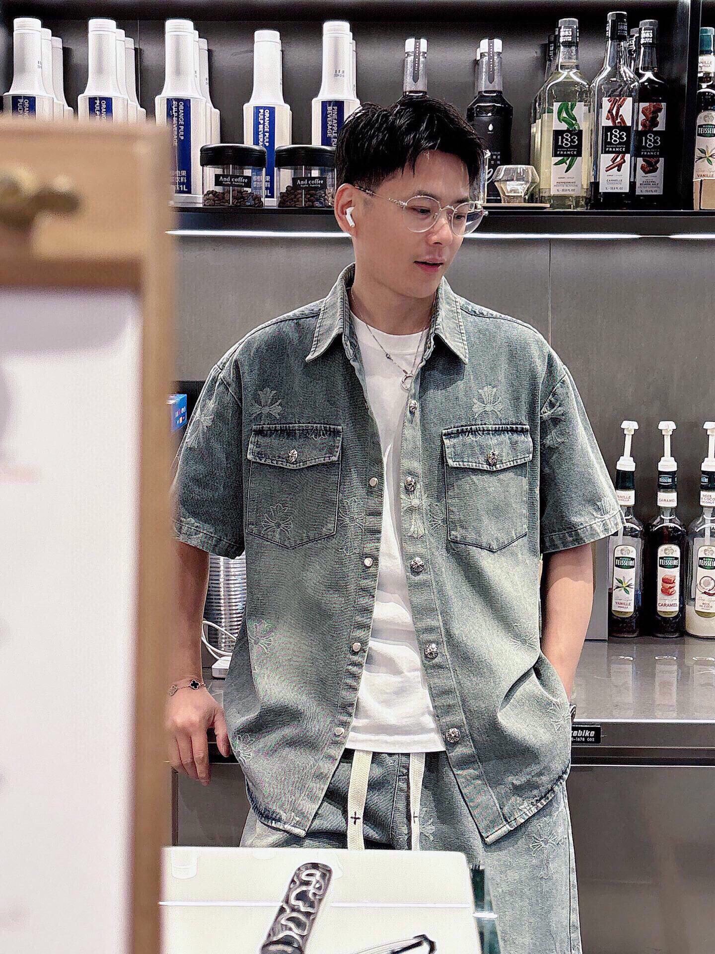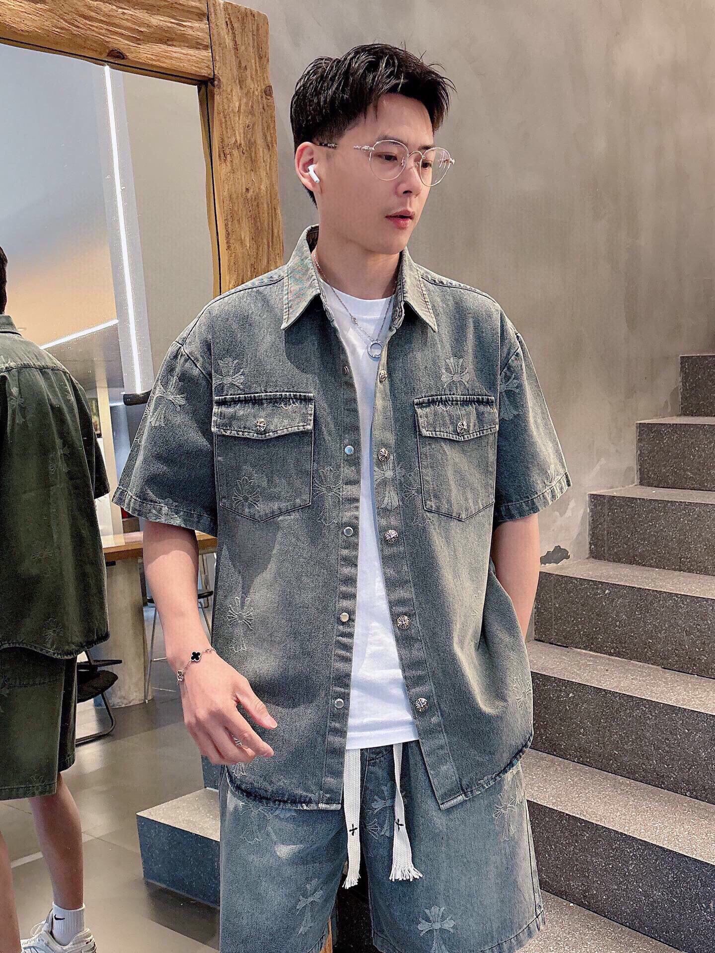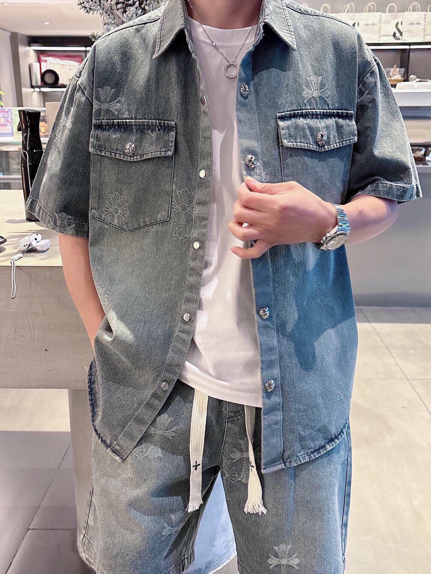 短裤 上衣 《克罗心系列提花牛仔短袖套装》 高端版本!专柜定制最新面料,定织定染的洗水牛仔。轻薄透气时尚个性,细节无可挑剔,品牌元素设计理念,体现高品质。呈现休闲裁剪,上身版型超赞!情侣 穿非常洋气!