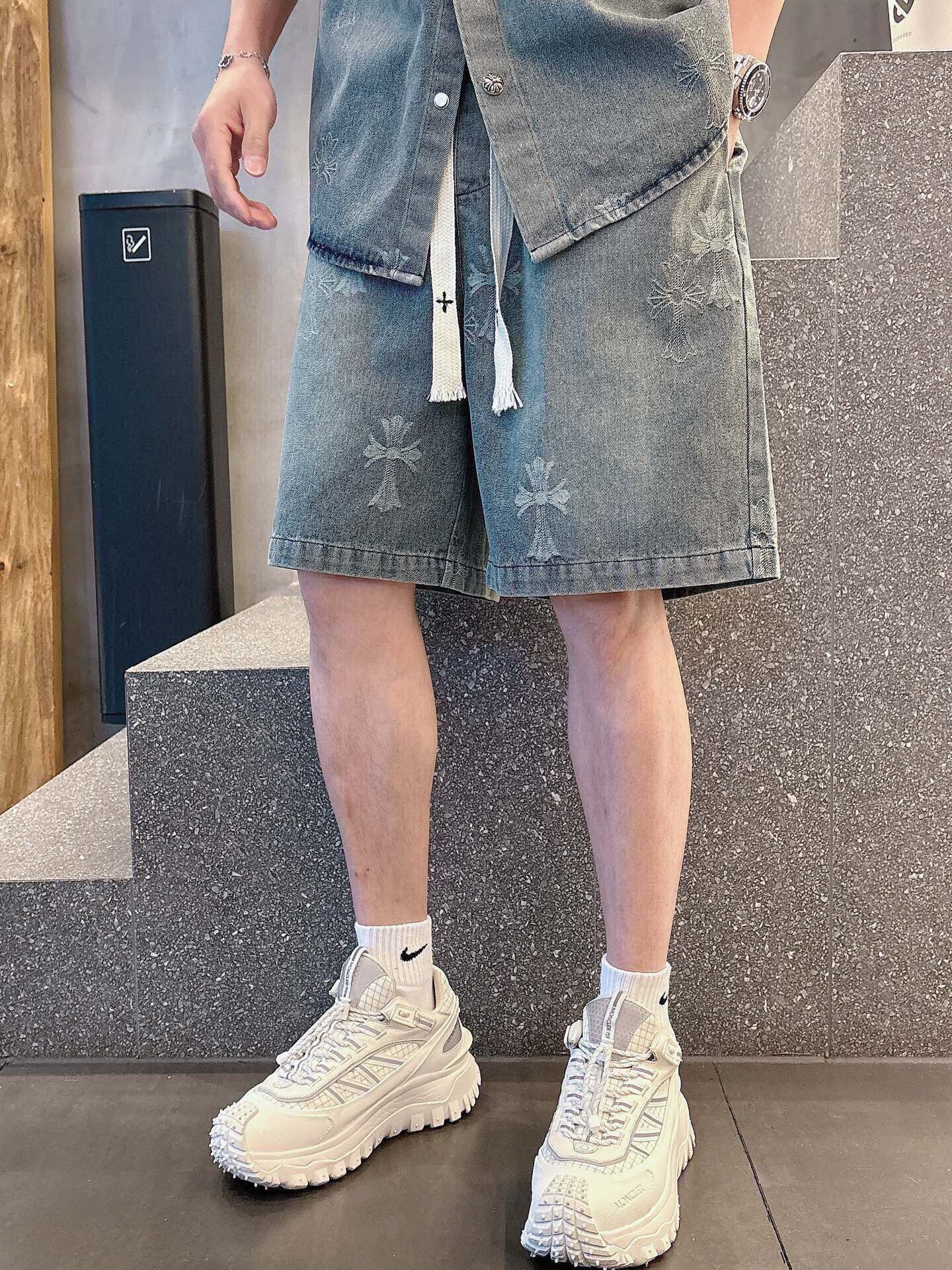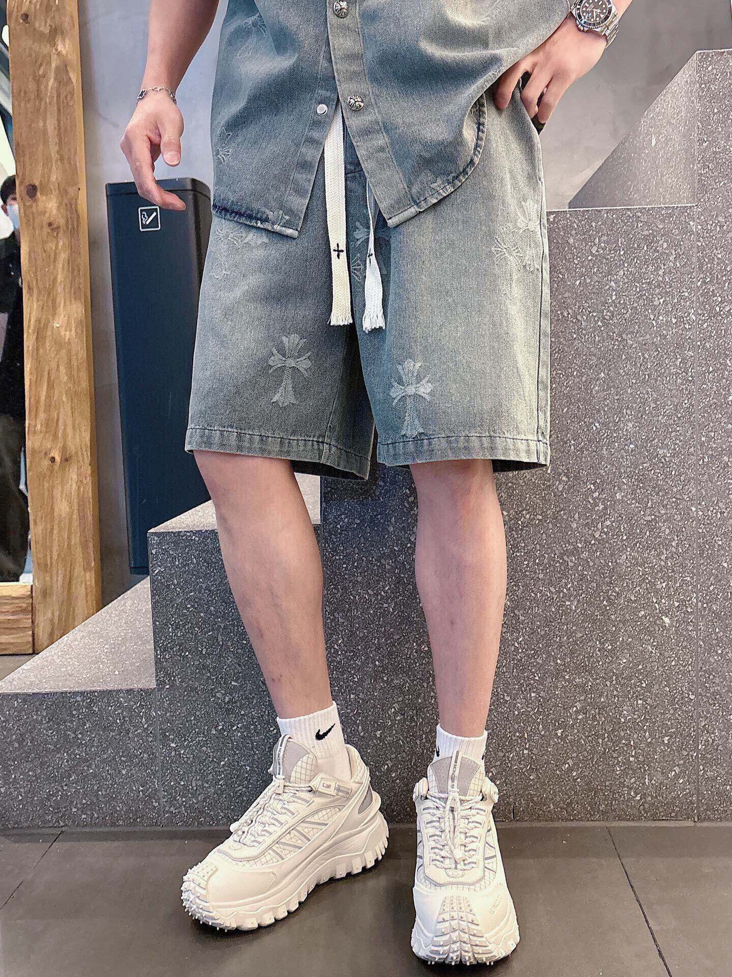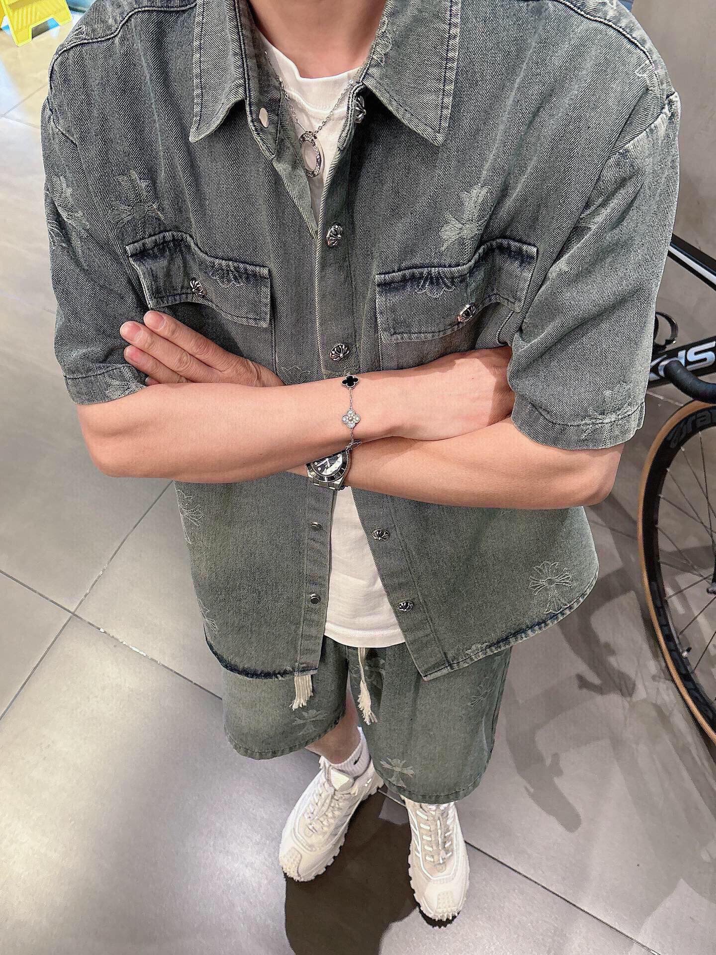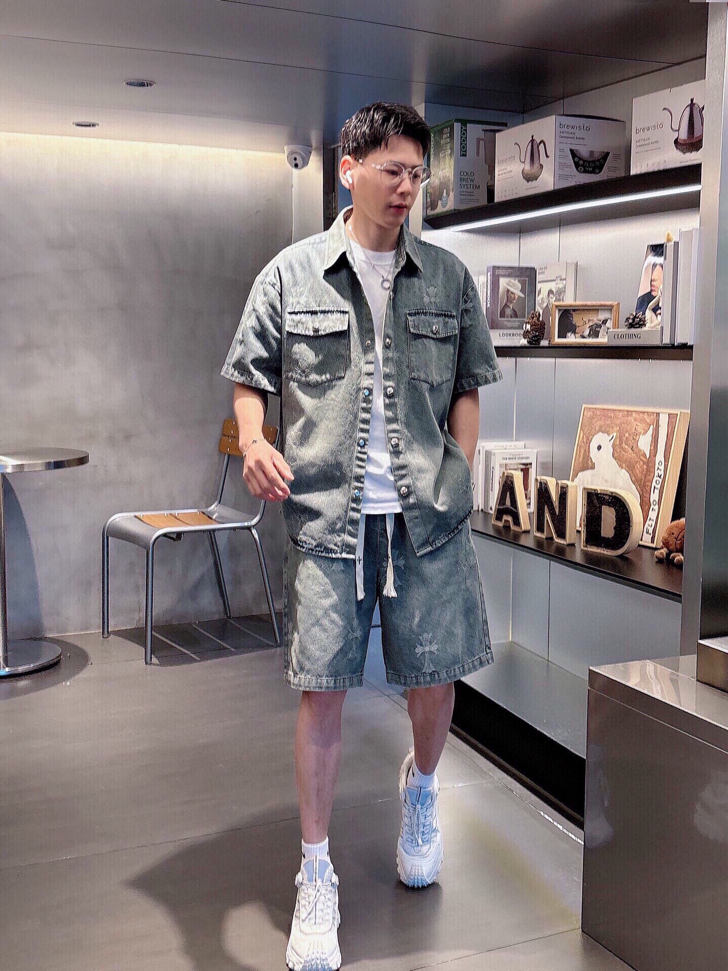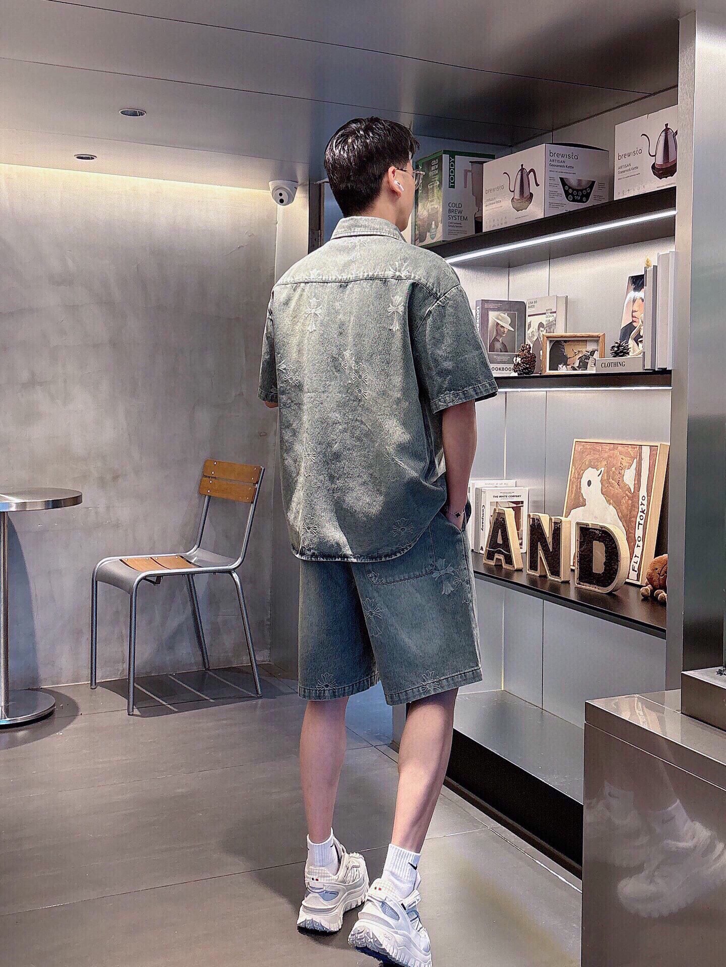 短裤 上衣 《克罗心系列提花牛仔短袖套装》 高端版本!专柜定制最新面料,定织定染的洗水牛仔。轻薄透气时尚个性,细节无可挑剔,品牌元素设计理念,体现高品质。呈现休闲裁剪,上身版型超赞!情侣 穿非常洋气!