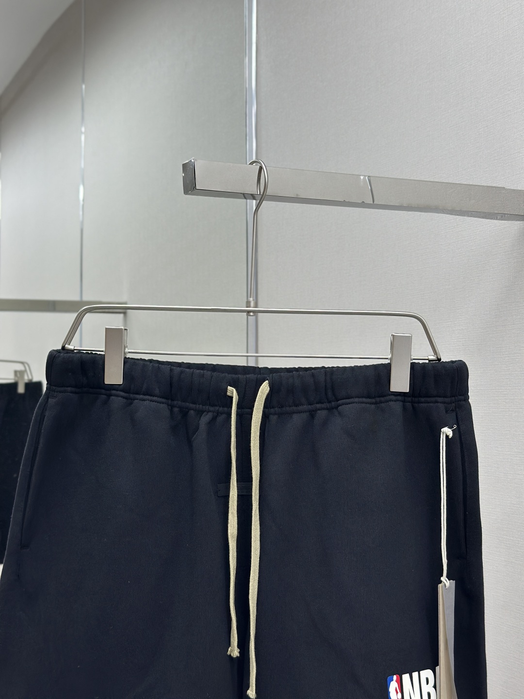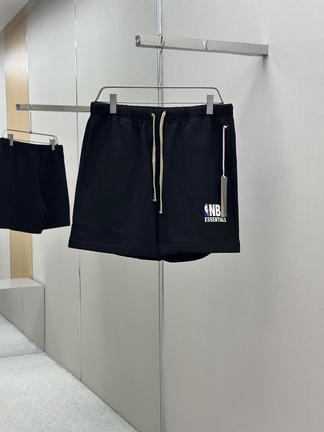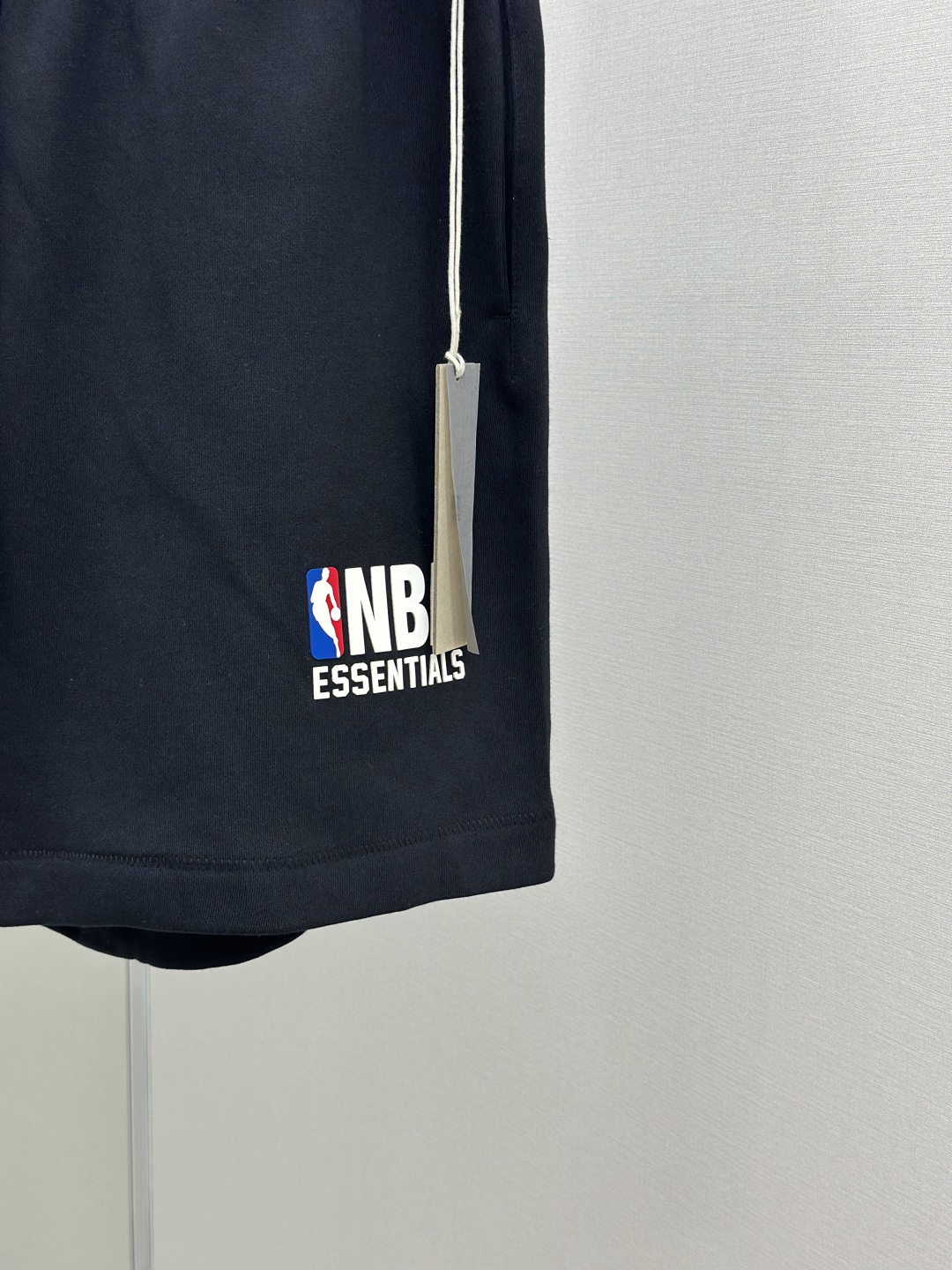 Essentials × NBA 25ss 联名NBA硅 简约棉质松紧腰短裤 面料采用328特厚直供,口袋内里皆埋夹工艺,采用筒子缝工艺,通过来回俩道车线,再手工分缝,内部包边,熨烫定型修剪缝边,日产量低损耗高,加工单价昂贵,纯棉配腰里,门襟和里襟等看不见的地方也是同等用料,定制牛角扣,脚口遵循原版锁边设计,定制全套辅料,大厂出品非常考验做工,高标准缝纫做工,行业顶尖品质,另做定型处理,上身挺阔不易变形,定制辅料三标