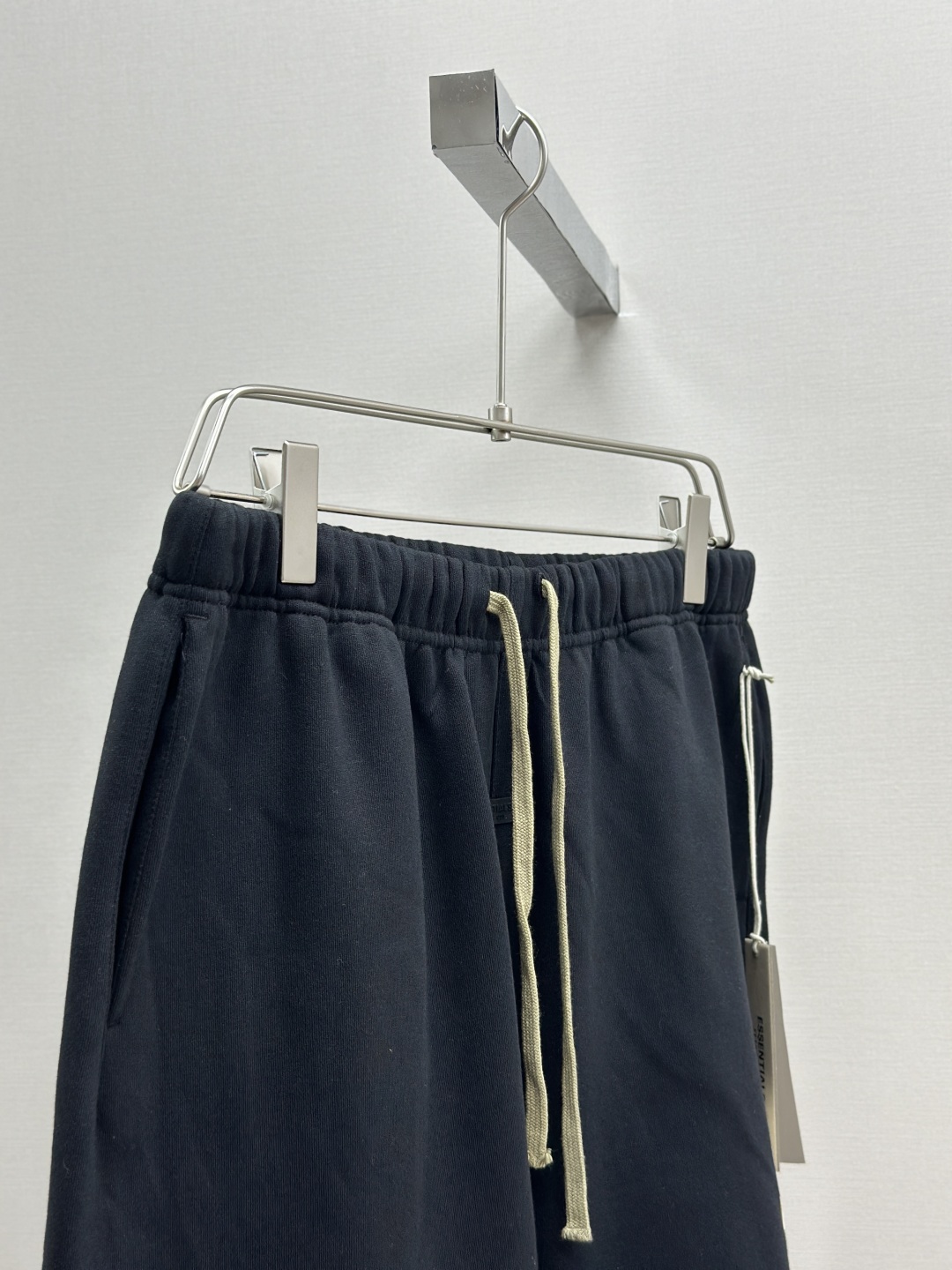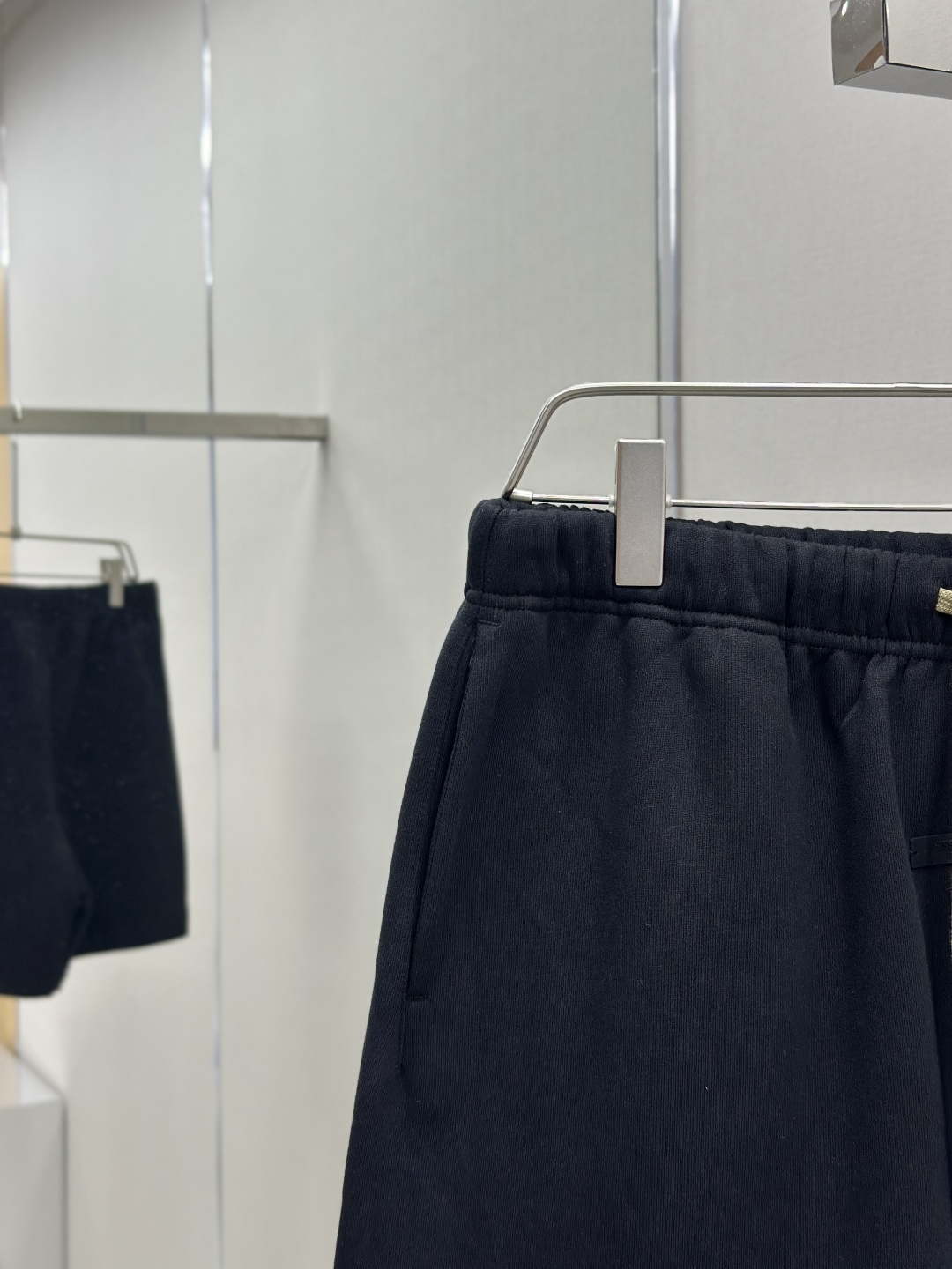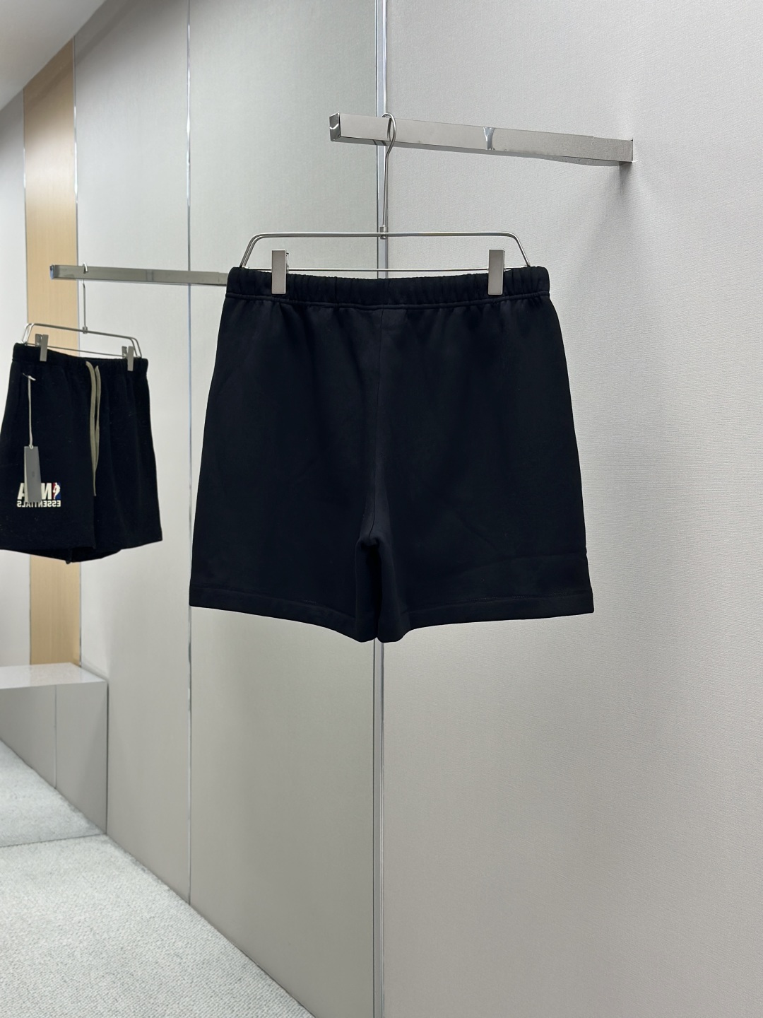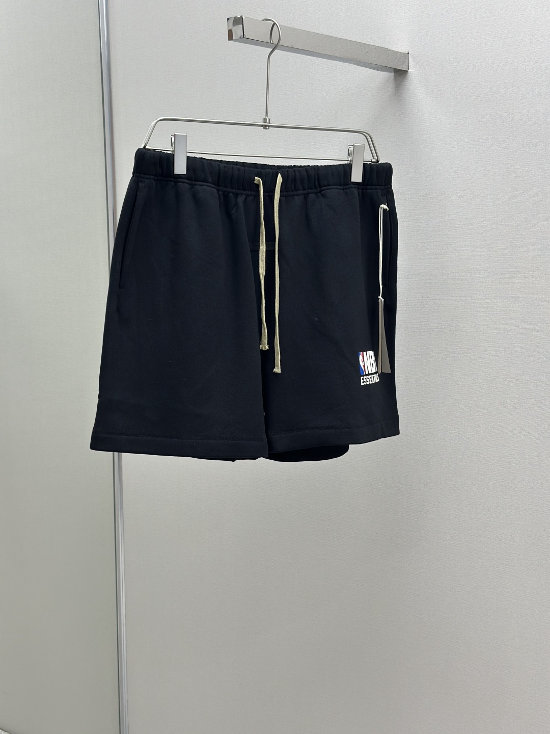 Essentials × NBA 25ss 联名NBA硅 简约棉质松紧腰短裤 面料采用328特厚直供,口袋内里皆埋夹工艺,采用筒子缝工艺,通过来回俩道车线,再手工分缝,内部包边,熨烫定型修剪缝边,日产量低损耗高,加工单价昂贵,纯棉配腰里,门襟和里襟等看不见的地方也是同等用料,定制牛角扣,脚口遵循原版锁边设计,定制全套辅料,大厂出品非常考验做工,高标准缝纫做工,行业顶尖品质,另做定型处理,上身挺阔不易变形,定制辅料三标
