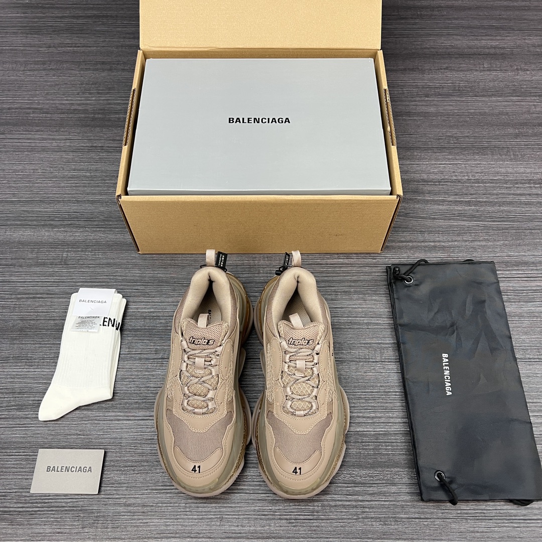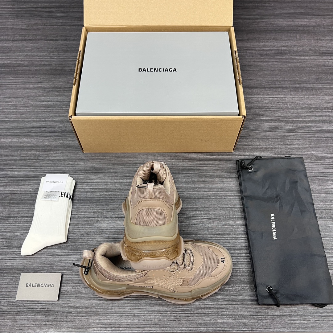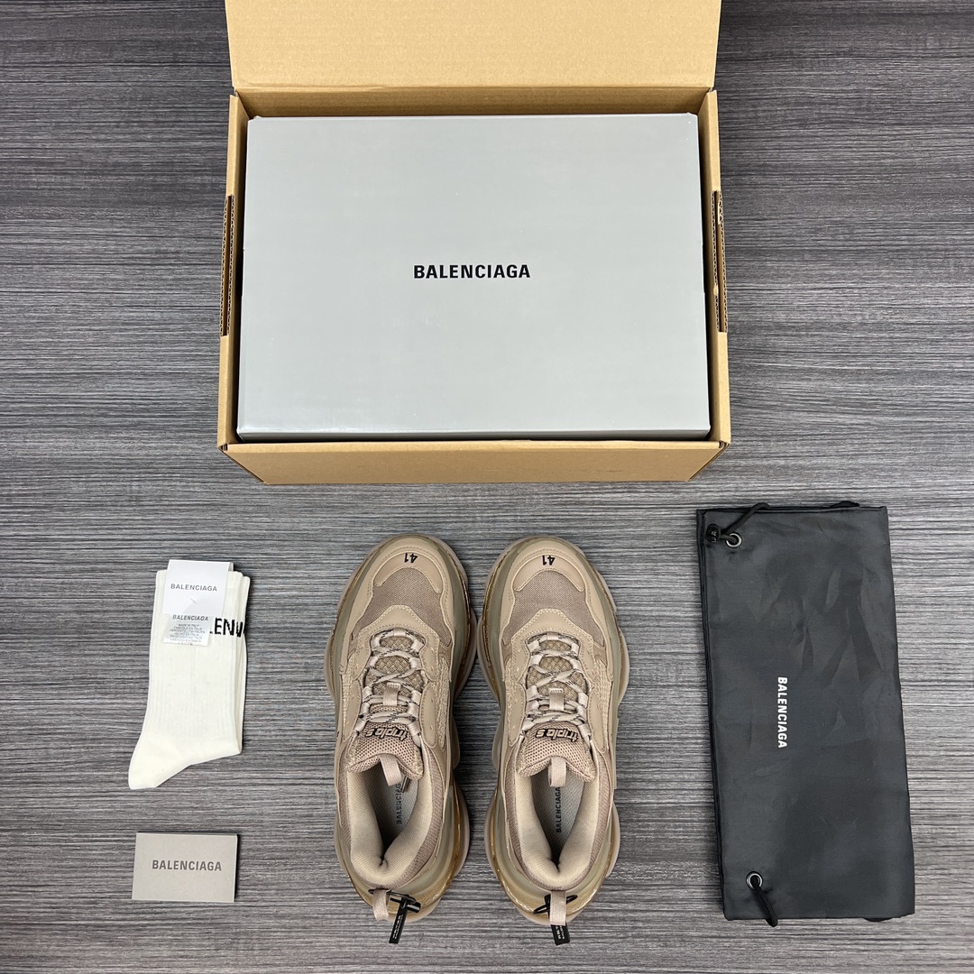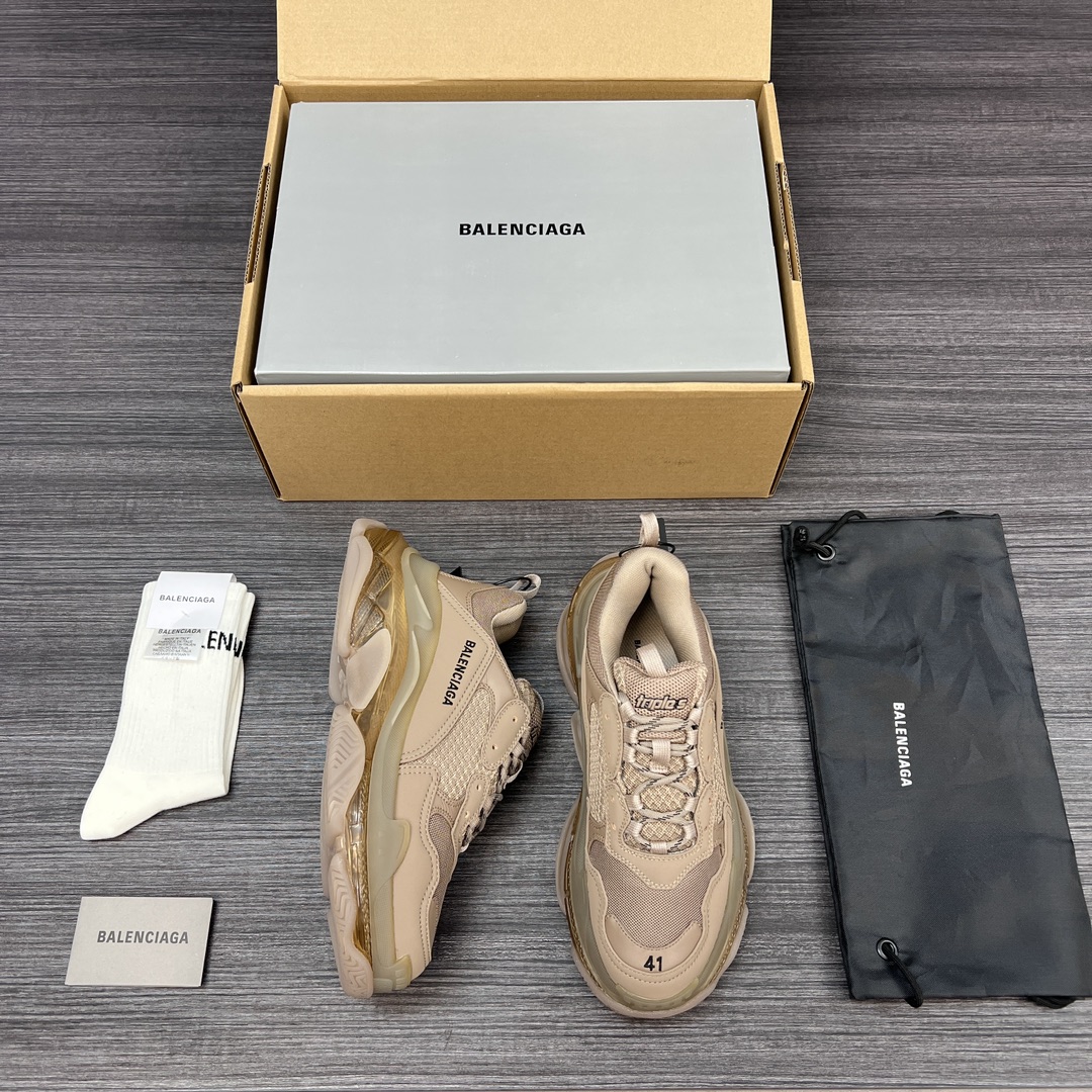 纯原版本 Balenciaga Triple S 巴黎世家 官方发售气垫版本纯原版本 正确字体电绣 粗细、位置、大小正确侧边TPU 透气孔匹配意产原版正确气垫分离大底,⚠️注意区分一鞋一码标注!原版大底做旧工艺 原版一致”Balenciaga” 大底LOGO 。鞋面采购原厂网纱。 包装:全套得物配件加固飞机盒包装! 码数:35-45码(正码)
