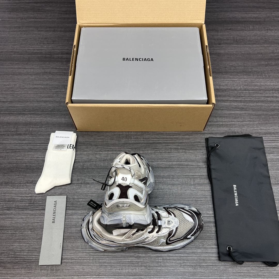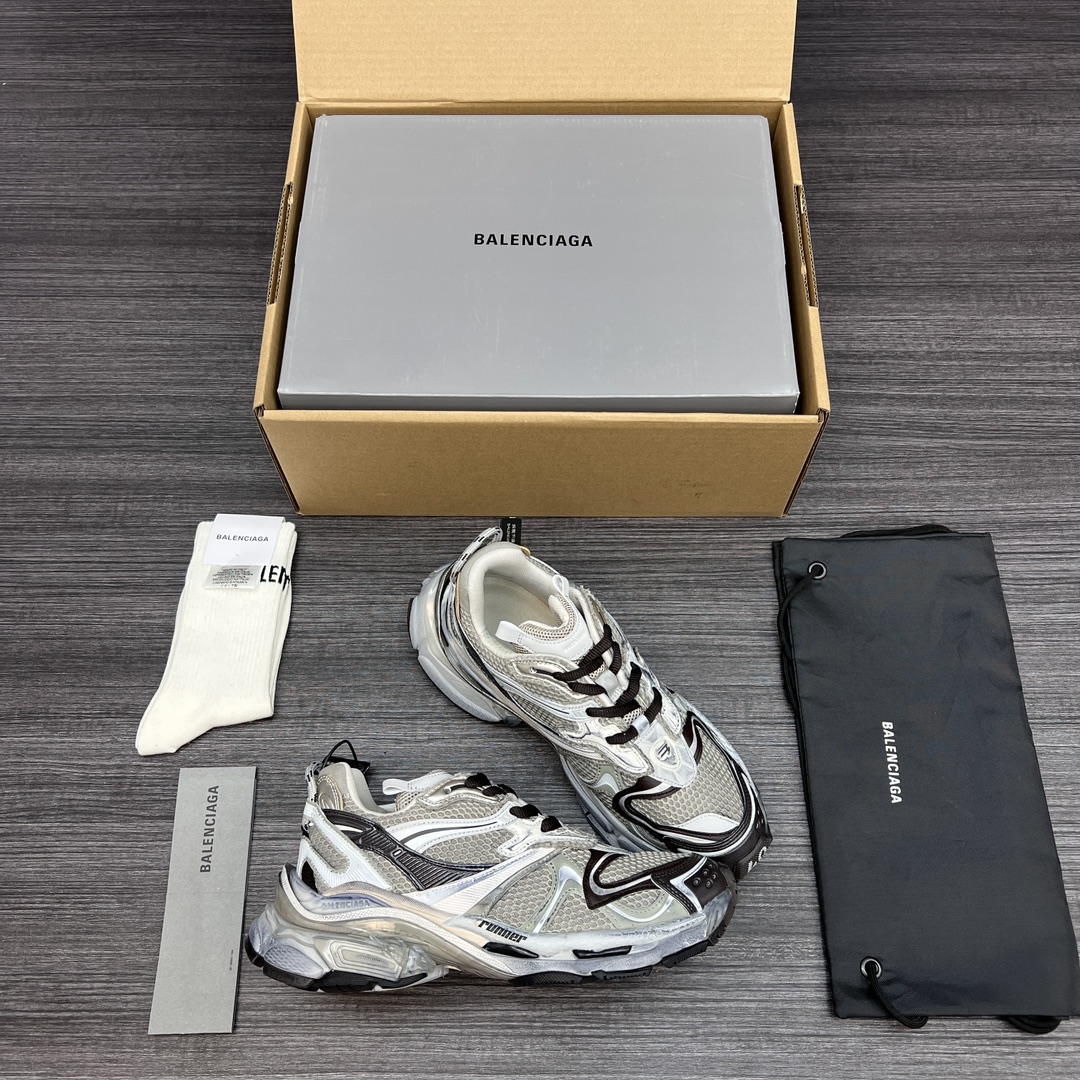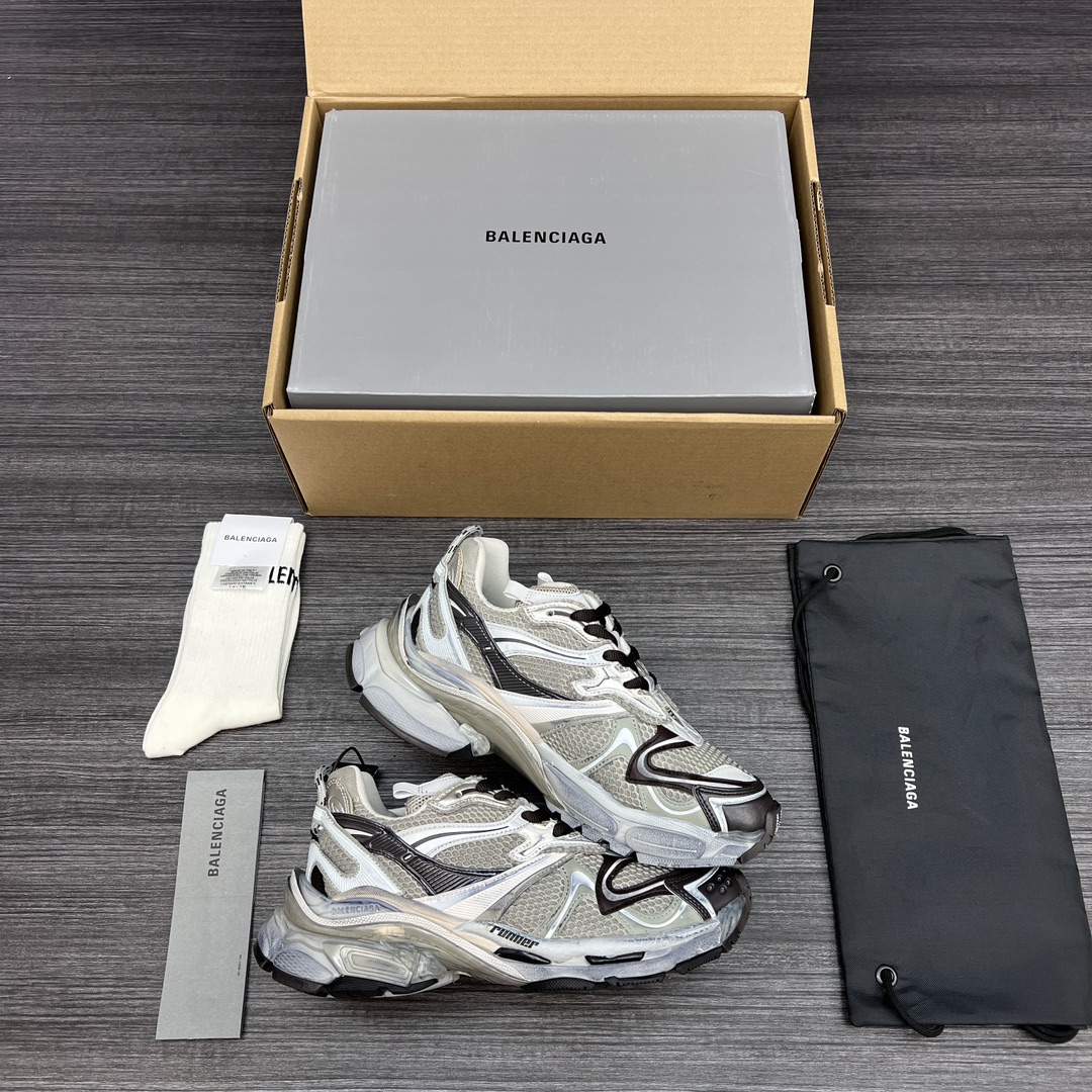 纯原BALENCIAGA 巴黎世家-Runner、是通过溢胶、做旧、缝线等细节,展示了设计师 Demna 的运动鞋风格,用一双「旧鞋」传递复古感,后侧板、翘起的鞋头,则展示了 Demna 在结构上的未来构想;