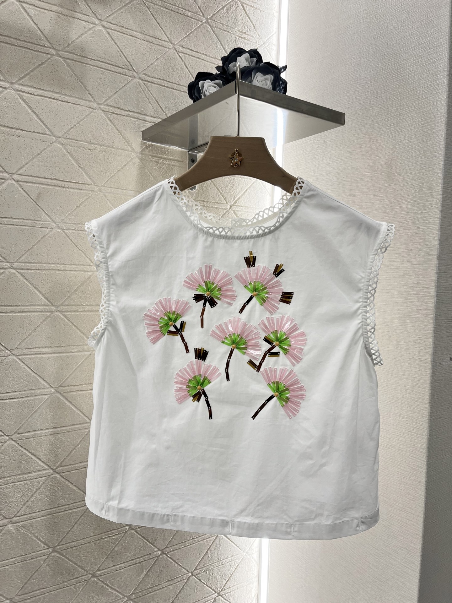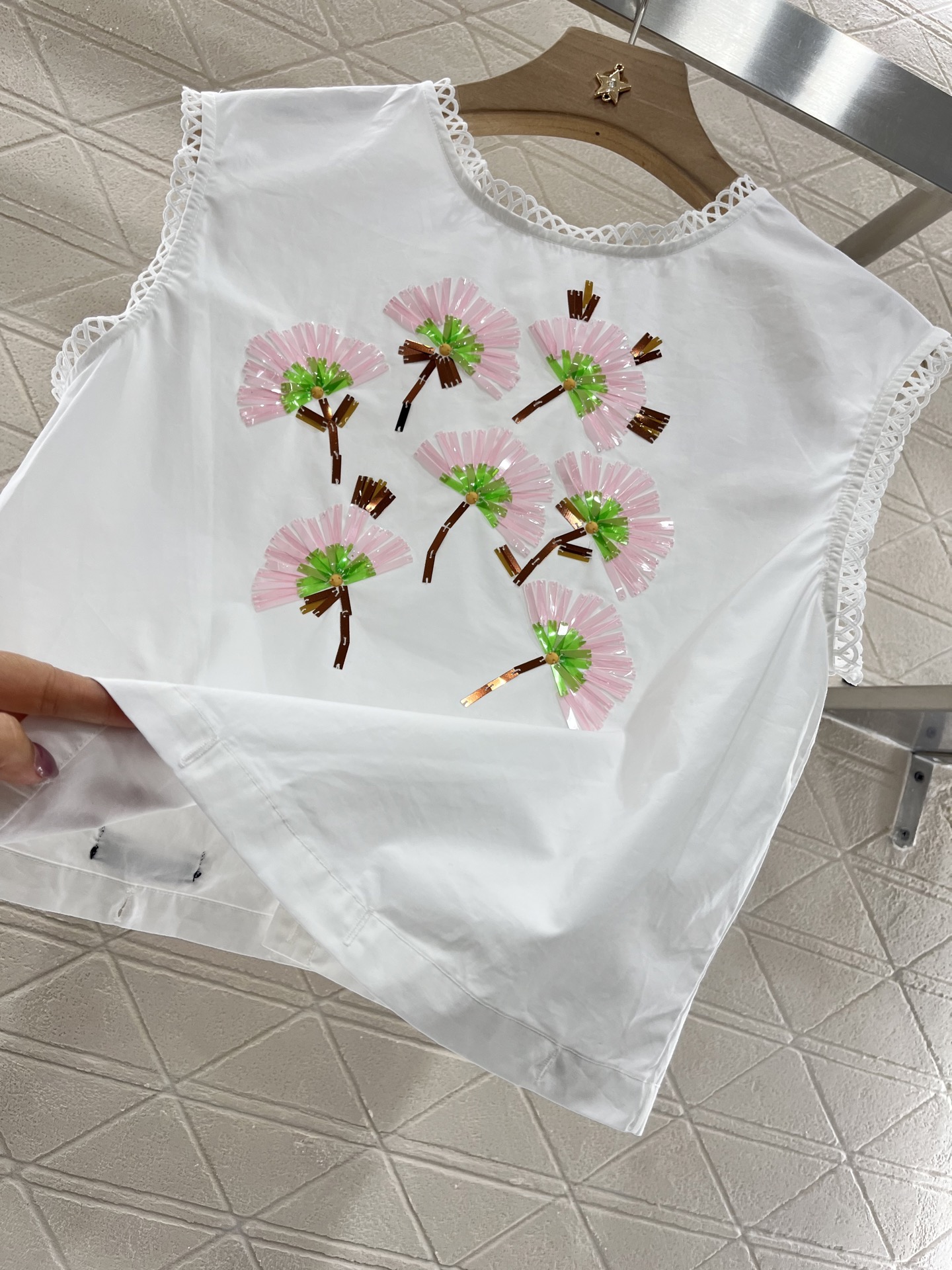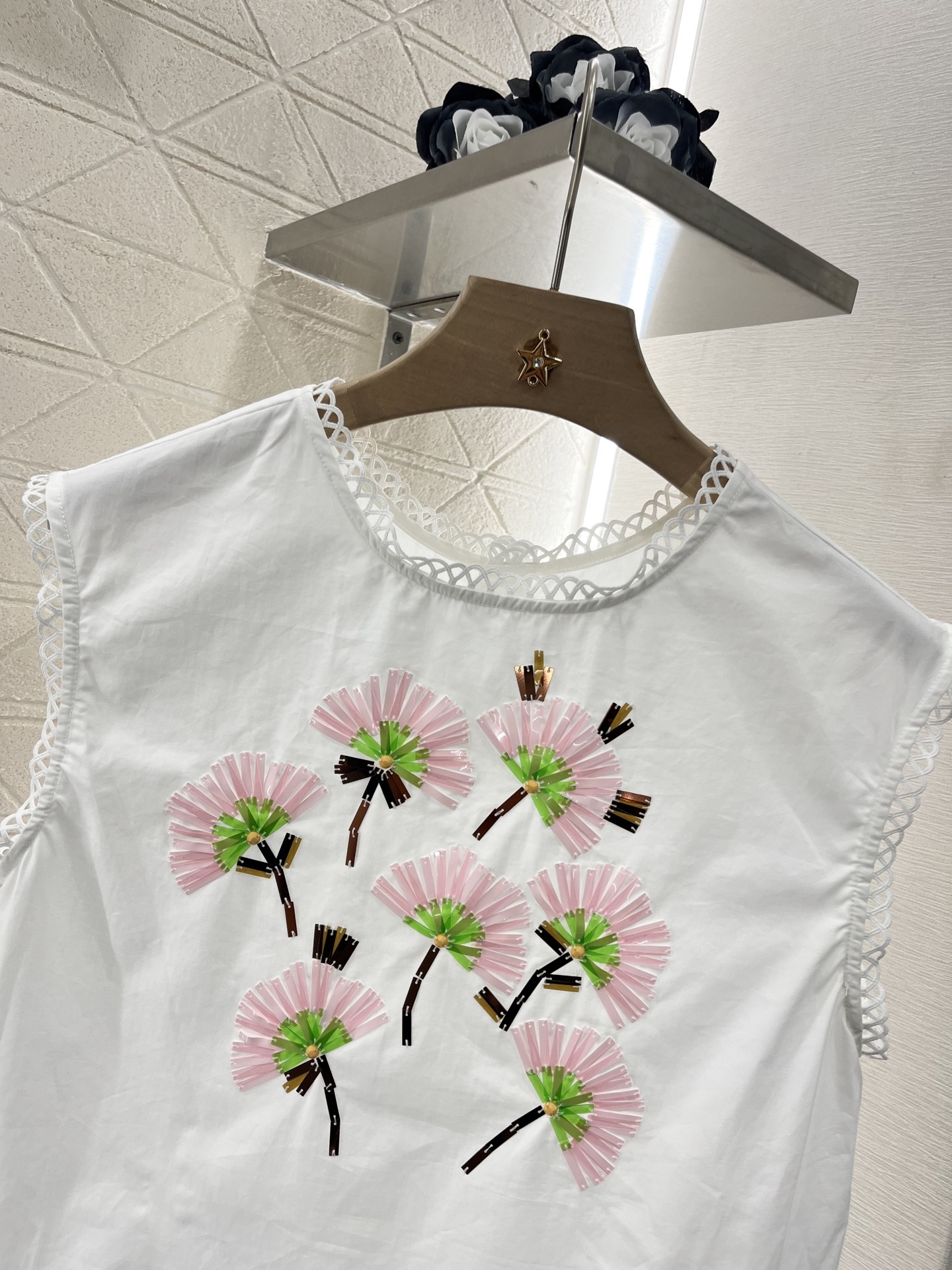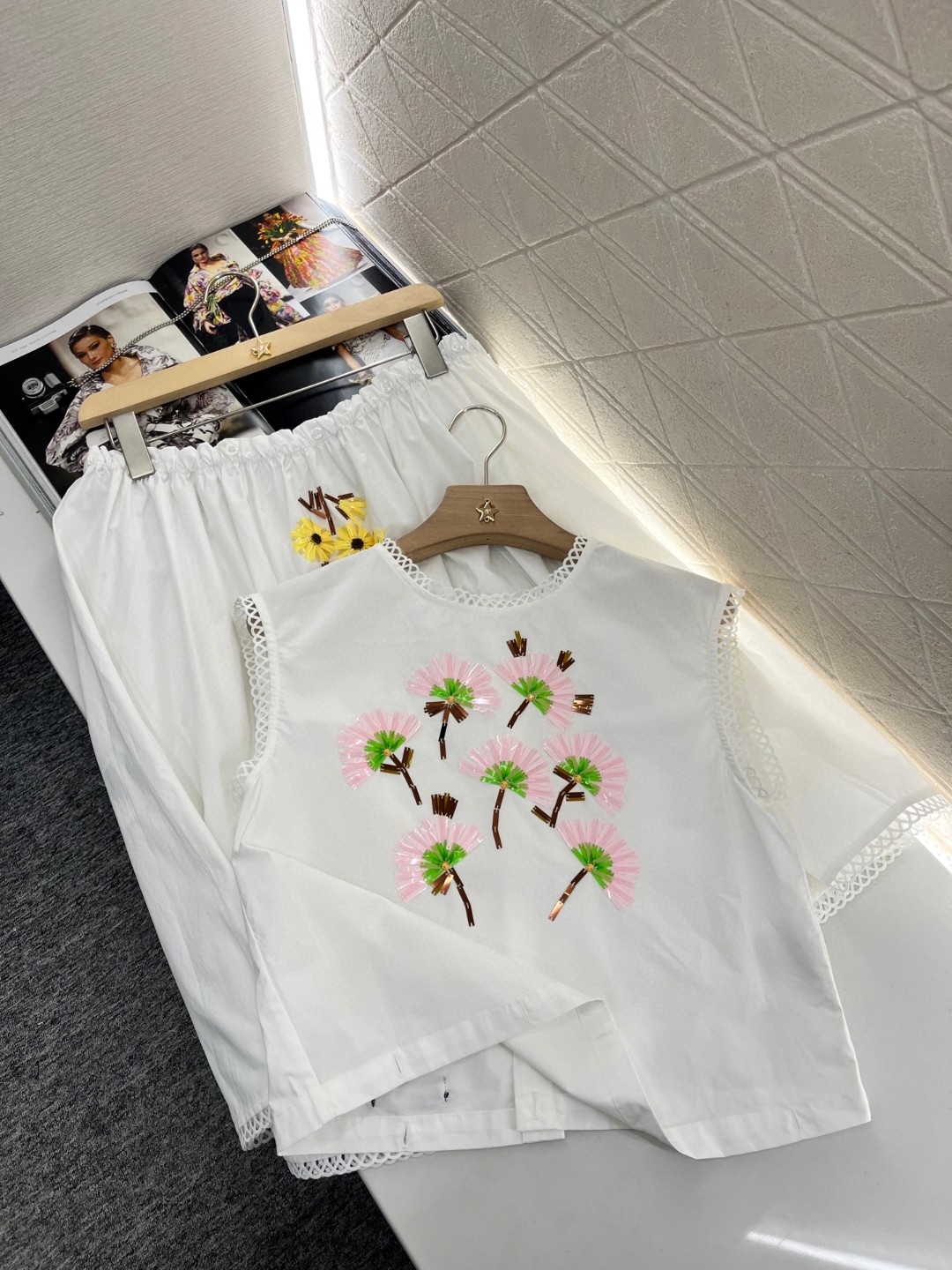 上衣 半裙原单狠货女装 配包装♥Miumi*♥2025新品上架 重工订珠可拆分背心裙 定制YB原生全棉材质 质感光泽 品相十足 上下身可拆分两件套背心裙剪裁 腰间以钮扣固定 丰富穿搭方案 可解可系增添文艺气质 定位重工亮片组合成花朵造型 与下半身不同花样和颜色形成碰撞 彰显满满清新甜美氛围 复古又时尚 连衣裙袖口裙摆均作镂空花边加持 更显设计感和俏皮减龄风格 ⚠️裙子多种穿法 拆分可搭配不同单品 腰间襟扣正反扣法也会呈现不同效果 一个常规 一个花边造型 妥妥的诚意单品 定制面辅料 认准版本 高版本