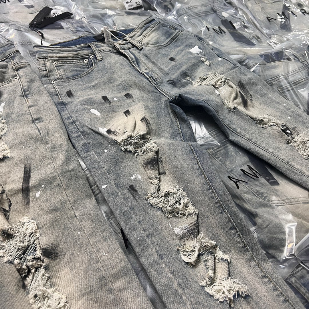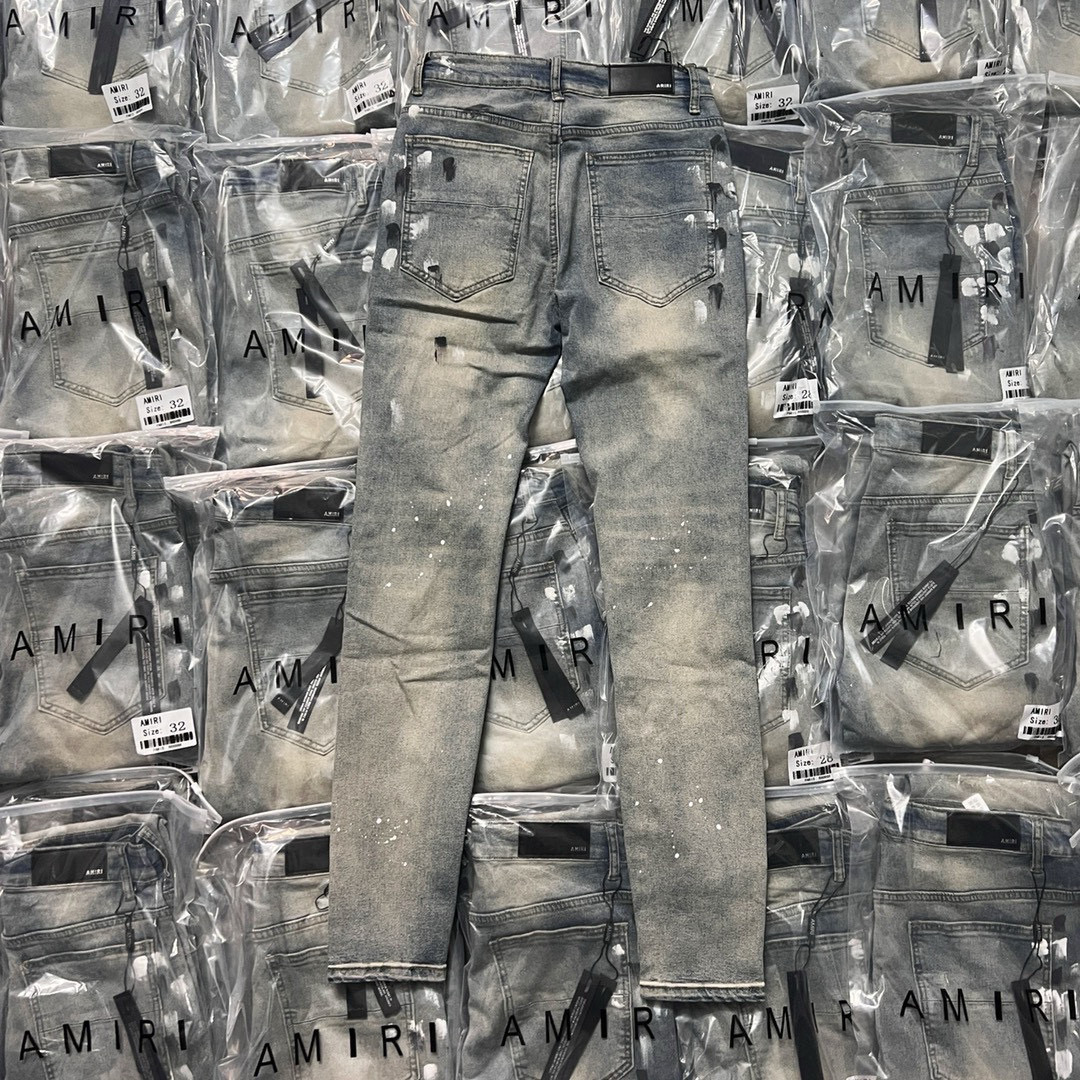 自主 AMIRI手绘泼墨破洞做旧水洗蓝牛仔裤长裤 AMIRI高街破洞泼墨直筒弹力牛仔裤长裤 Amiri蓝牛