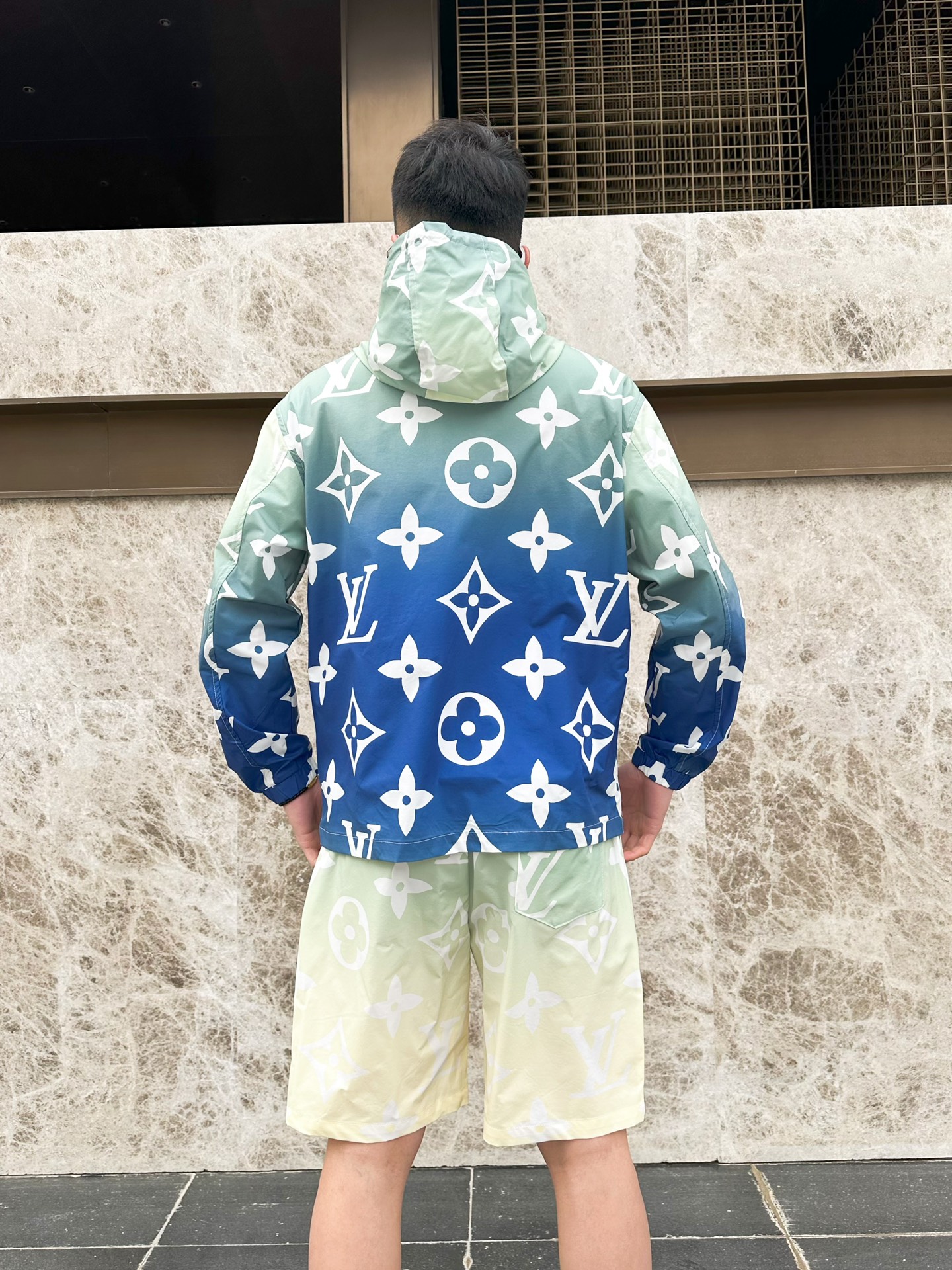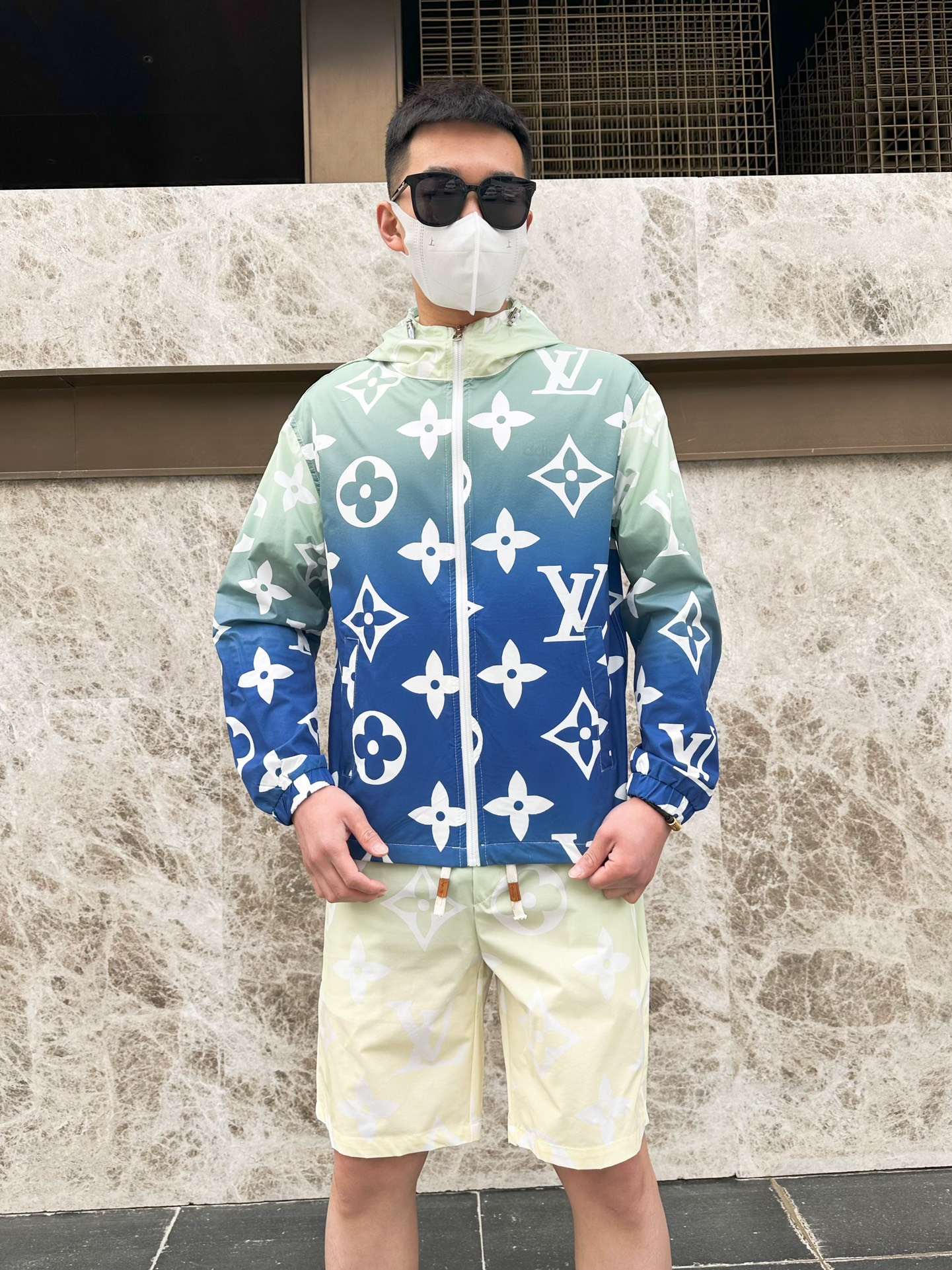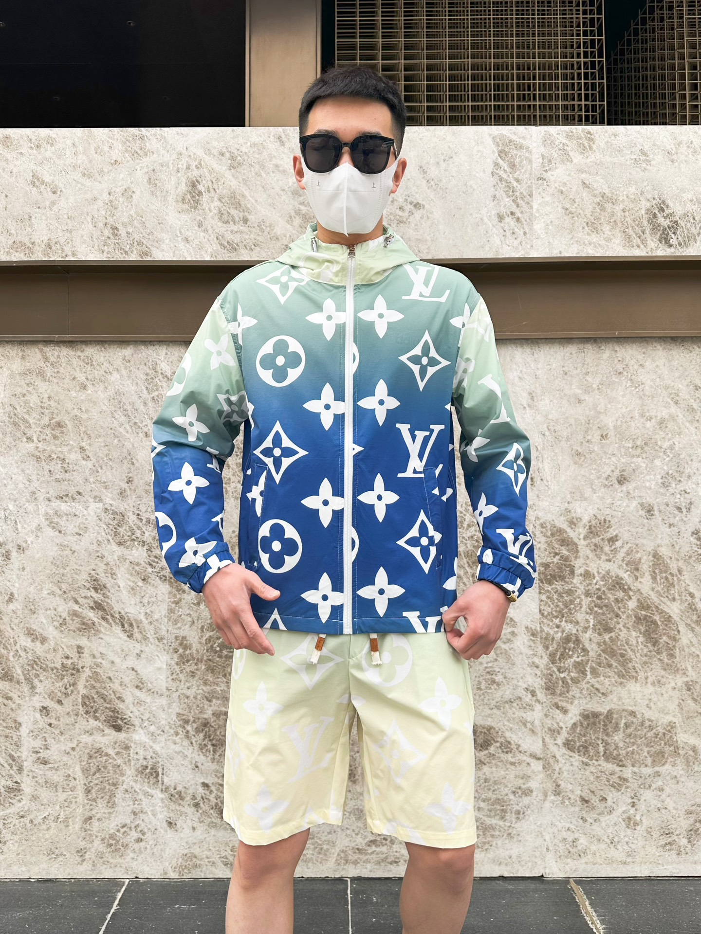路易威登LV 2025夏季防晒衣短裤套装,海外专柜同步 轻薄高品质面料奢华高级定制 任何人都可以轻松驾驭,客供进口聚纤维面料 手软舒适有型 吸汗透气 ,外贸公司订单,n国内一线代工厂出品,订制高密度面料,过水不变型,奢华上身显年轻,街头时尚居家必备款 m-xxxL L穿175/140斤 下单报身高体重
