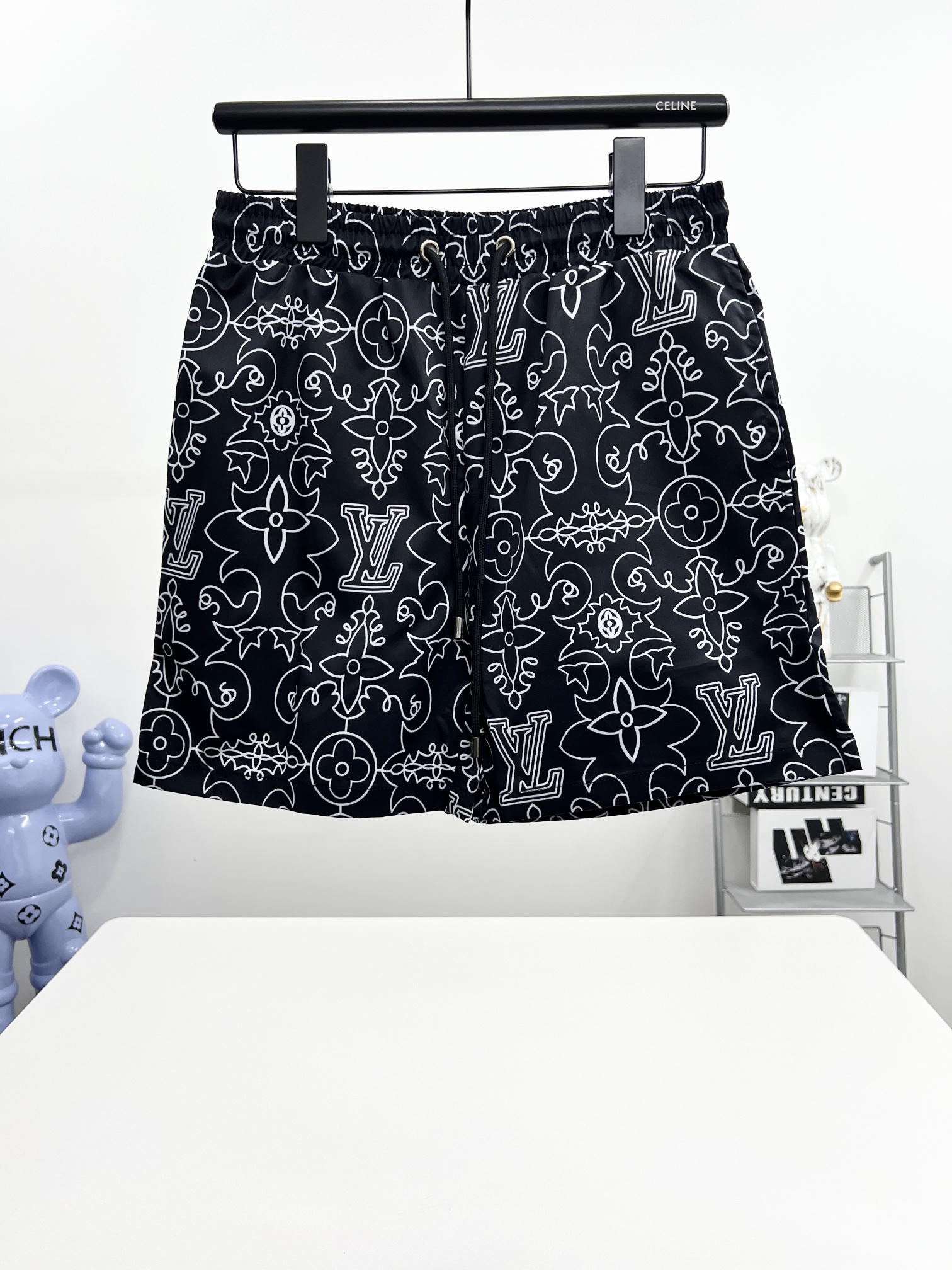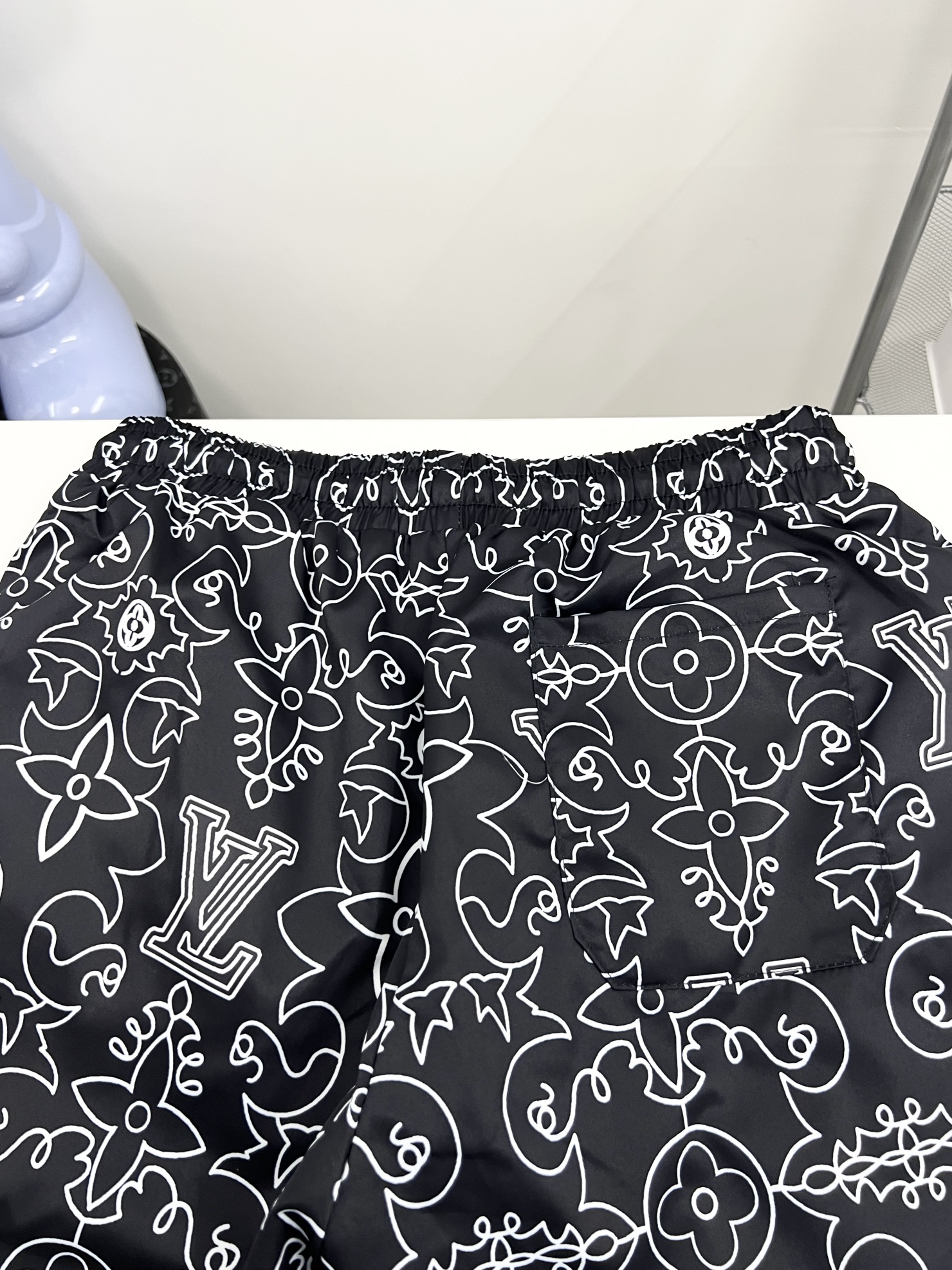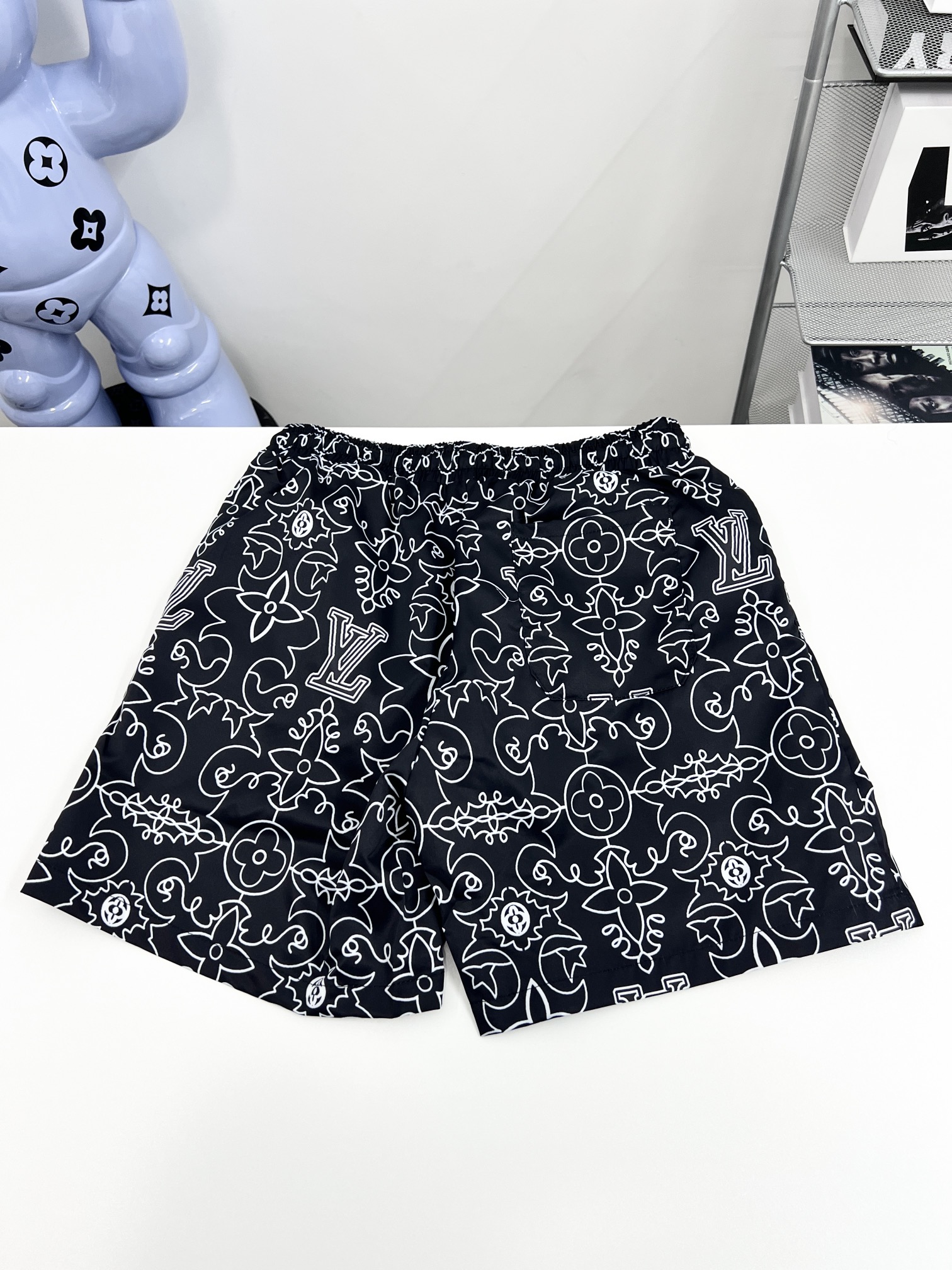 路易沙滩裤篮球短裤梭织尼龙美式运动休闲潮流短裤、绝配潮流运动休闲结合 选用卡丝尼龙面料、透气性、舒适性、功能性极佳、专业做梭织运功工厂代工、细节到位 前后的印花图案、高温压烫牢固不掉