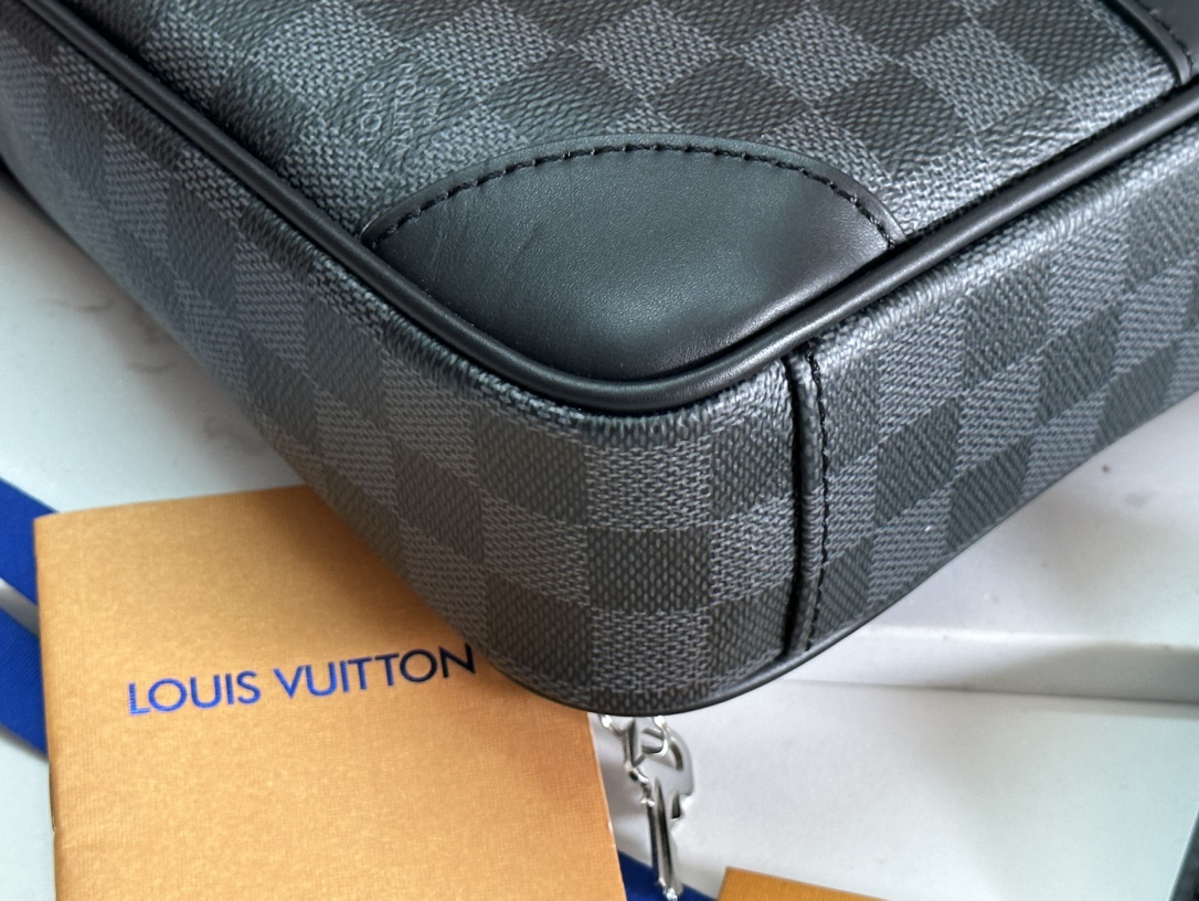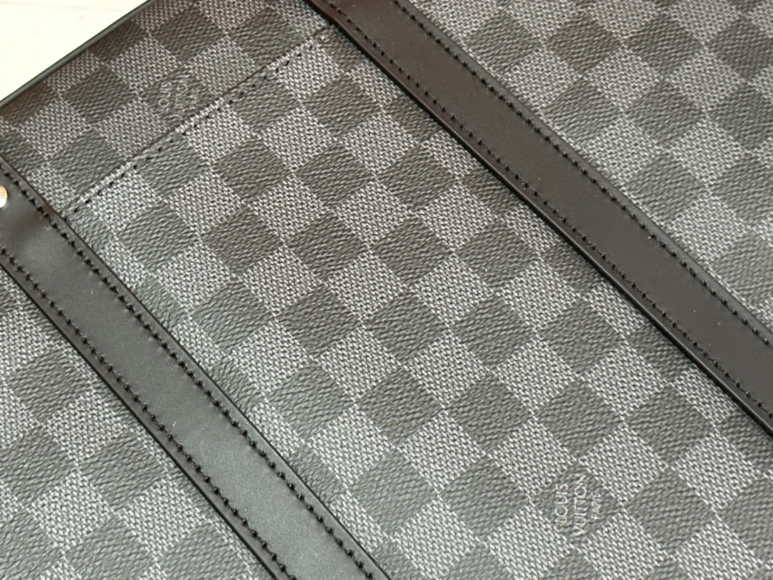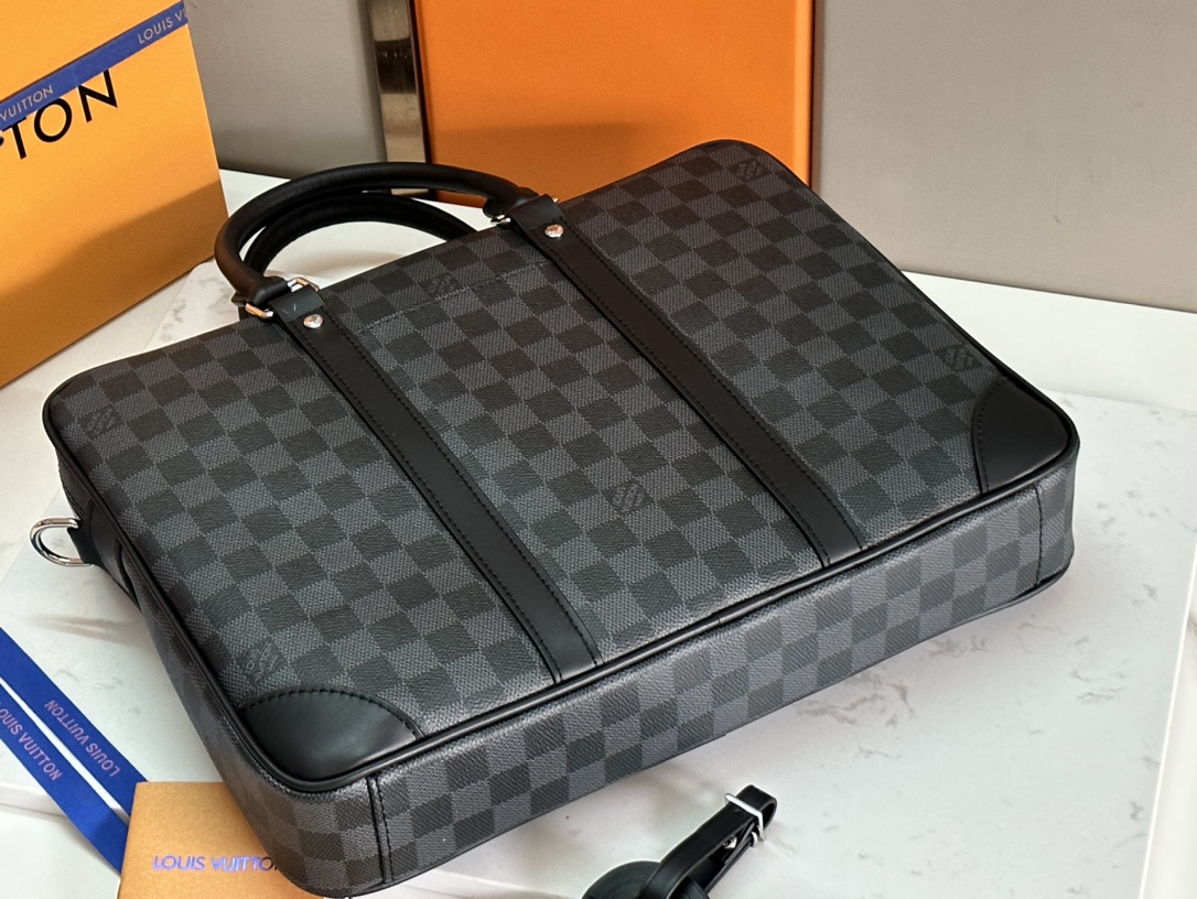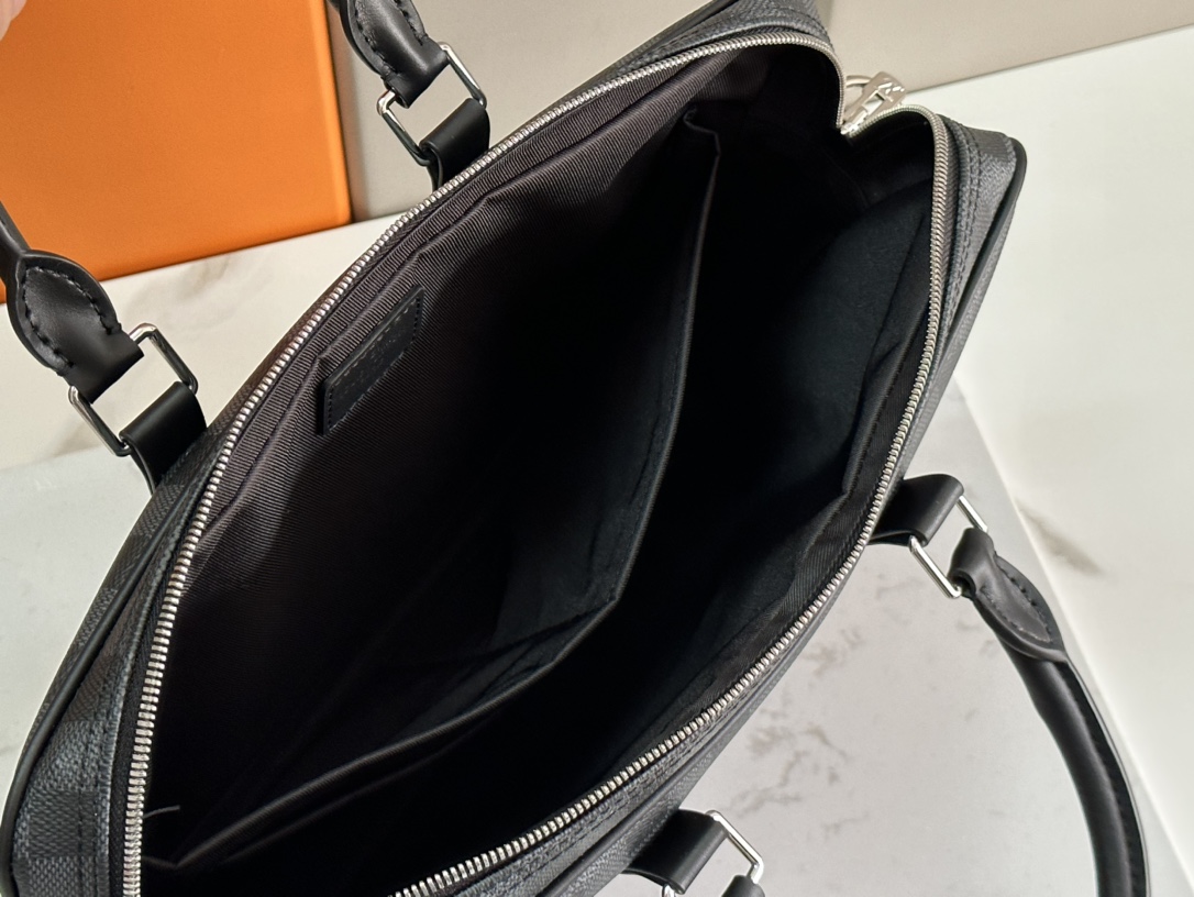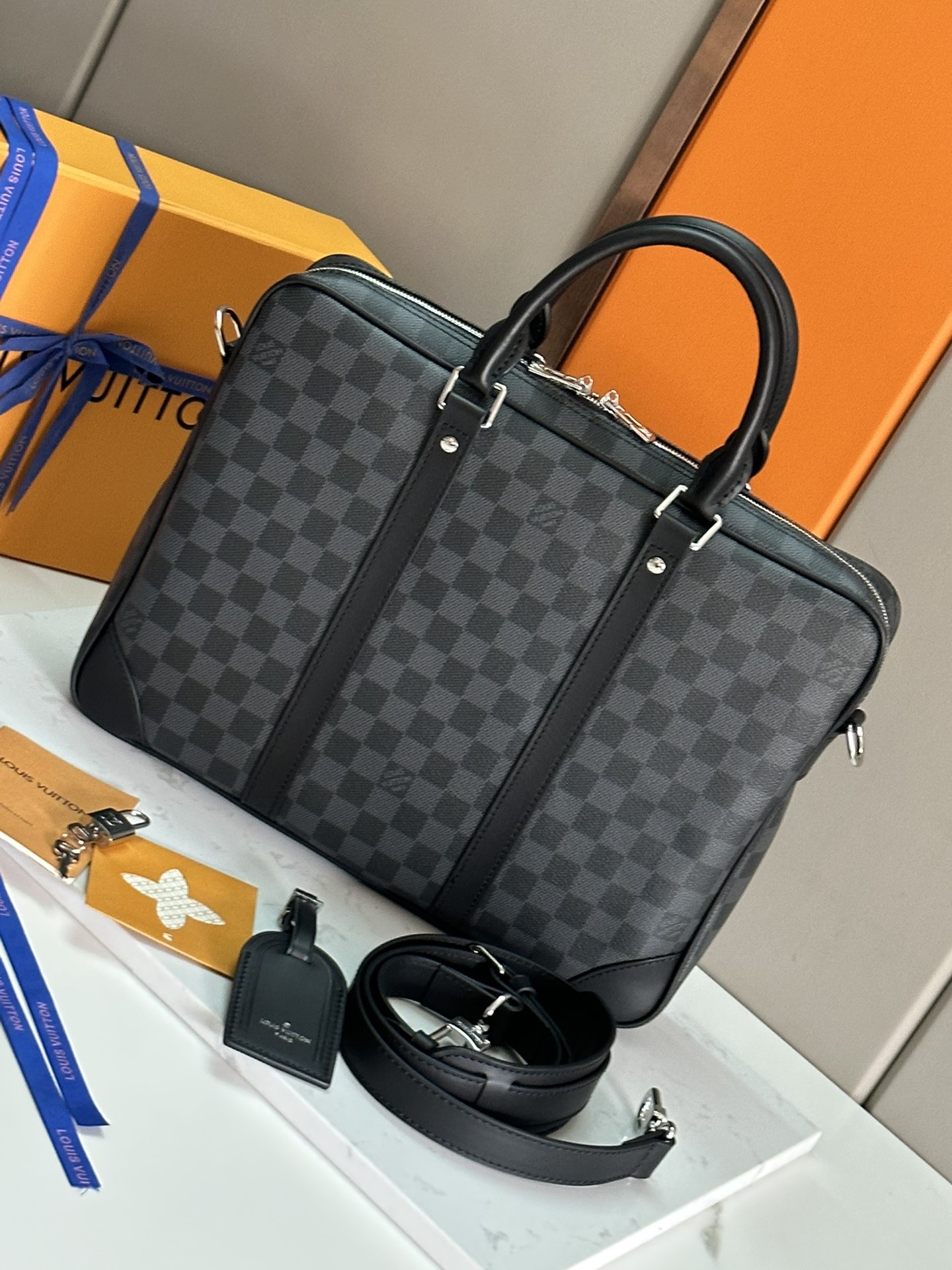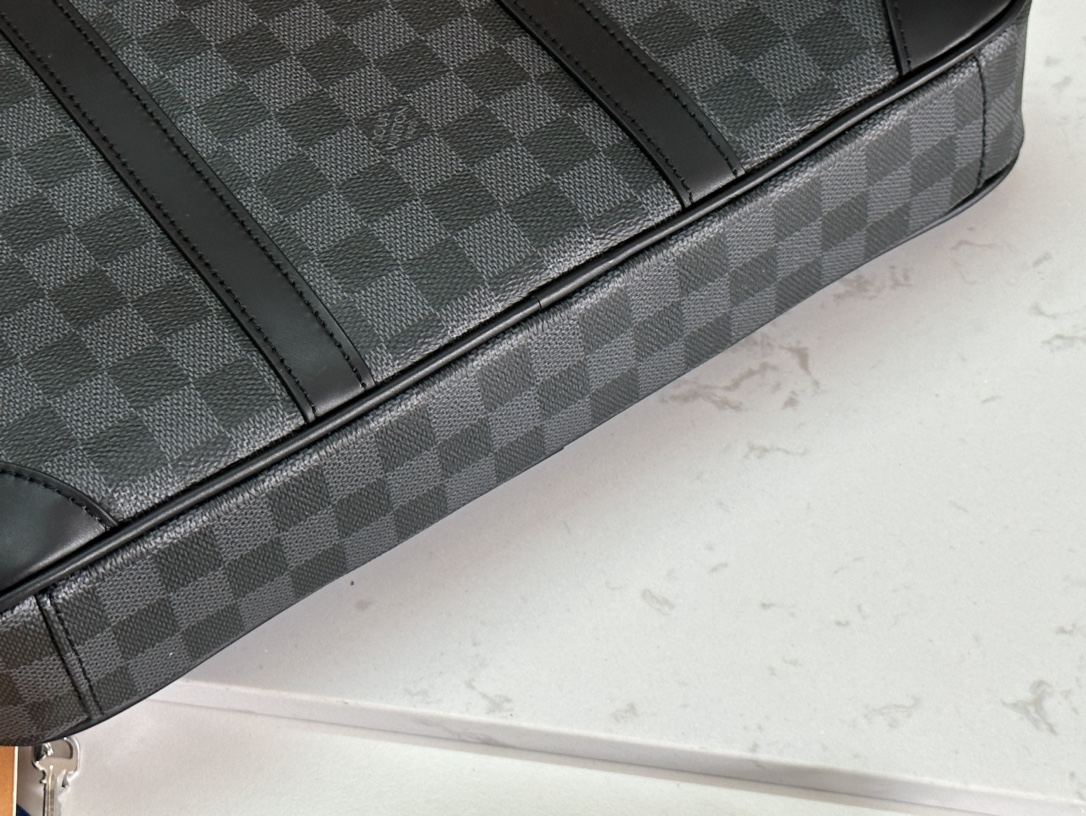 ‼️顶级原单【 N40445黑格 】本款 Voyage 小号公文包取材 Damier Graphite 涂层帆布,搭配皮革侧带、加固包角、顶部手柄和名牌。外袋便于存放智能手机,加垫内隔层可容纳 13 寸笔记本电脑,可拆卸并调节的肩带实现舒适肩背。size:36.5×27.5x6cm。