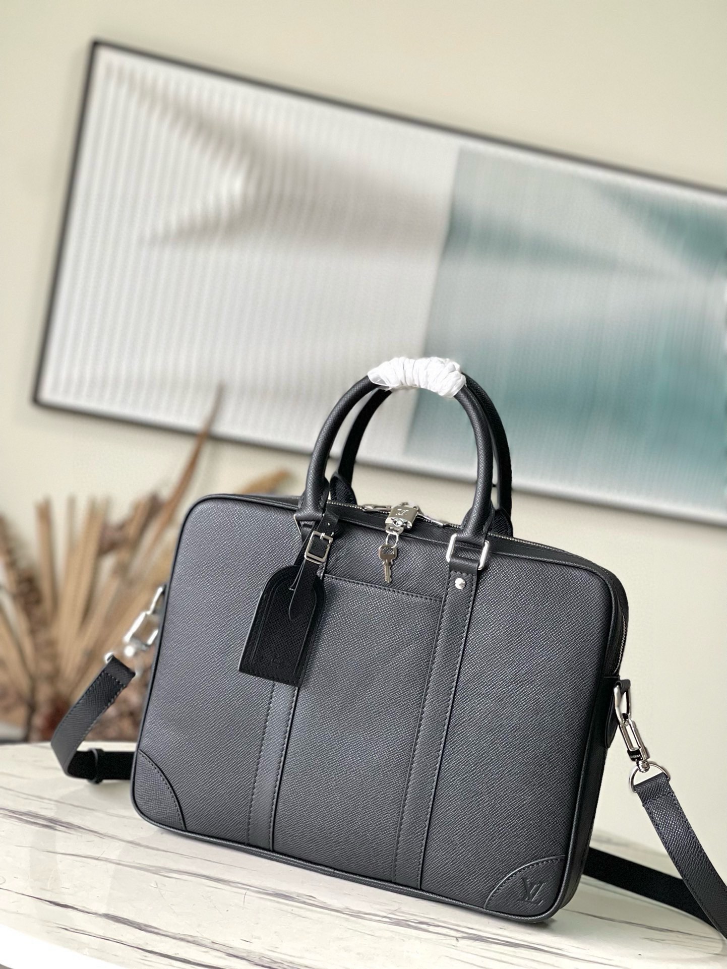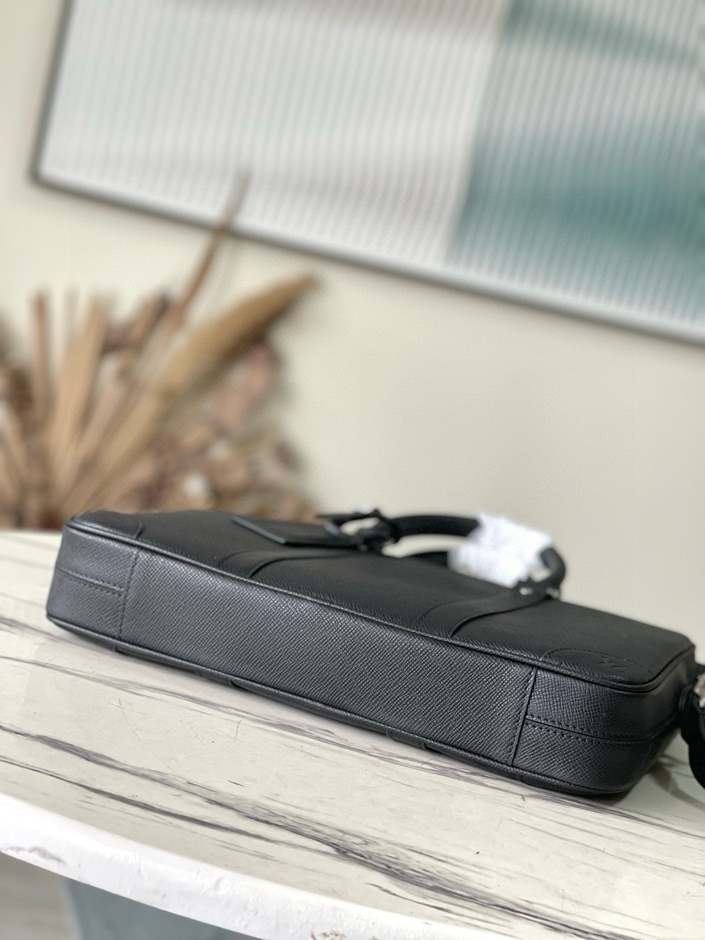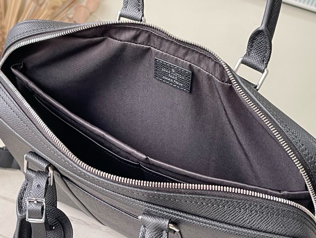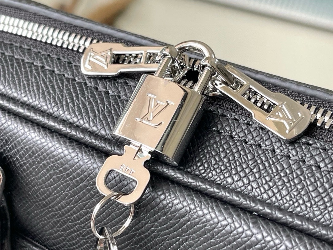 顶级原单 M30925 十字纹 本款 Voyage 小号公文包选取 Taïga Noir 牛皮革,在抚平、抛光等工序后压印细腻纹理。衬垫内里可收纳 13 寸笔记本电脑,后侧双贴袋再添功能细节,搭配顶部手柄和可拆卸并调节的肩带。详细特征:36.5 x 27.5 x 6 厘米 (长度 x 高 x 宽)