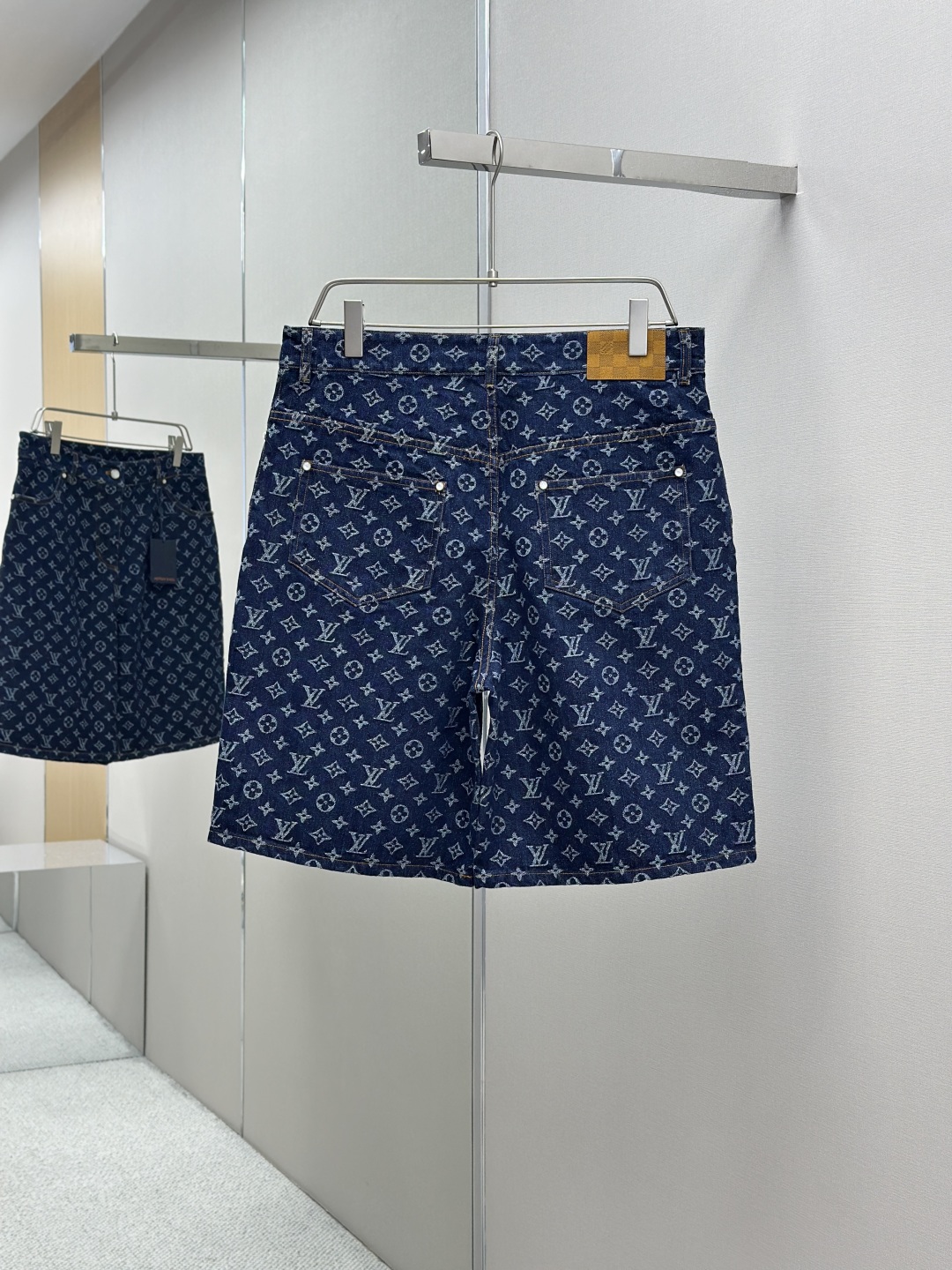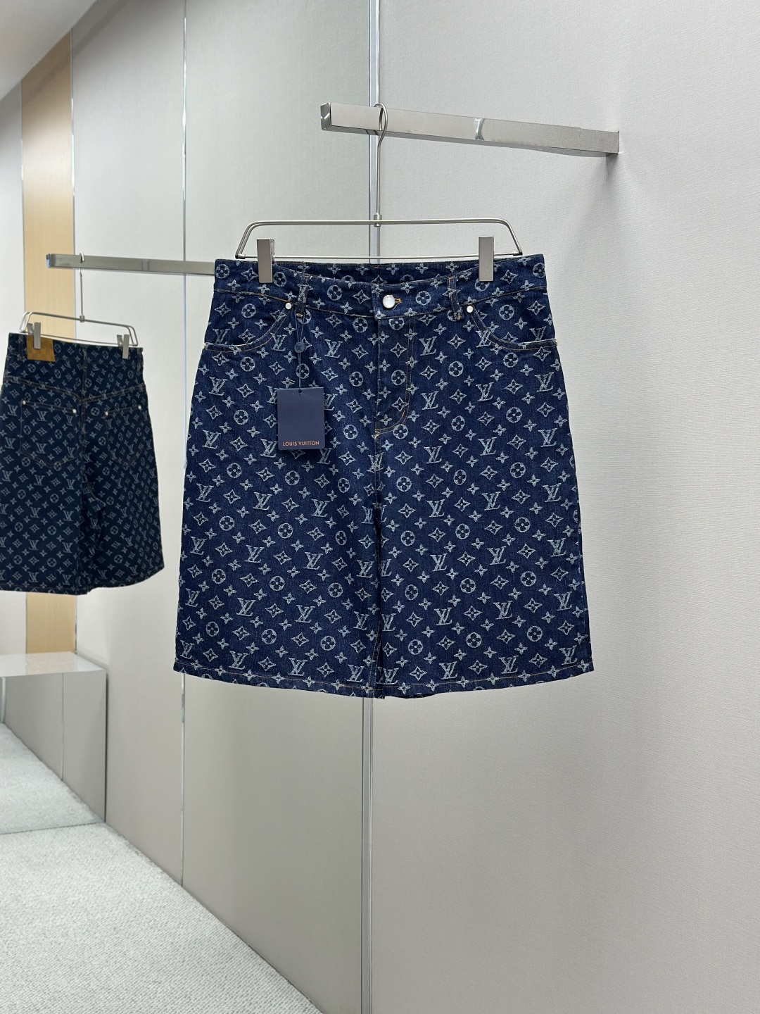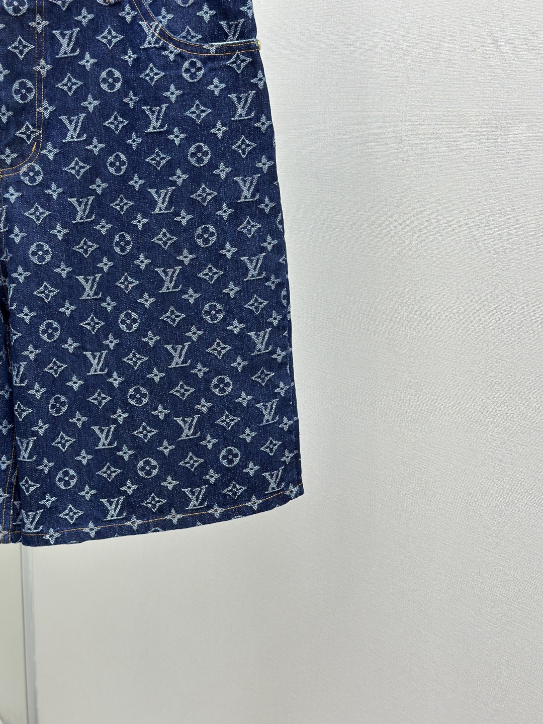 1v 2025ss 春夏新款 重工款提花牛仔短裤 深蓝色洗水牛仔面料 定制白珠刻字纽扣 全新设计辅料纽扣细节 直筒剪裁版型设计 满身经典品牌logo提花效果 腰部做旧植绒皮牌 微宽松版型 尺码:s m l xl