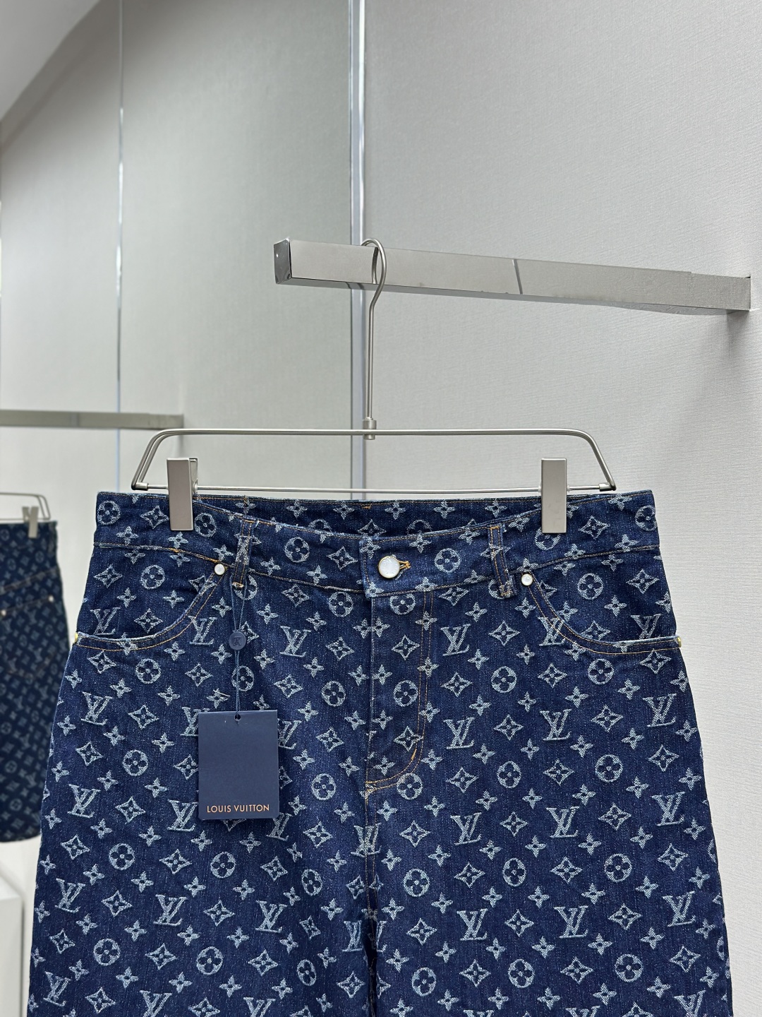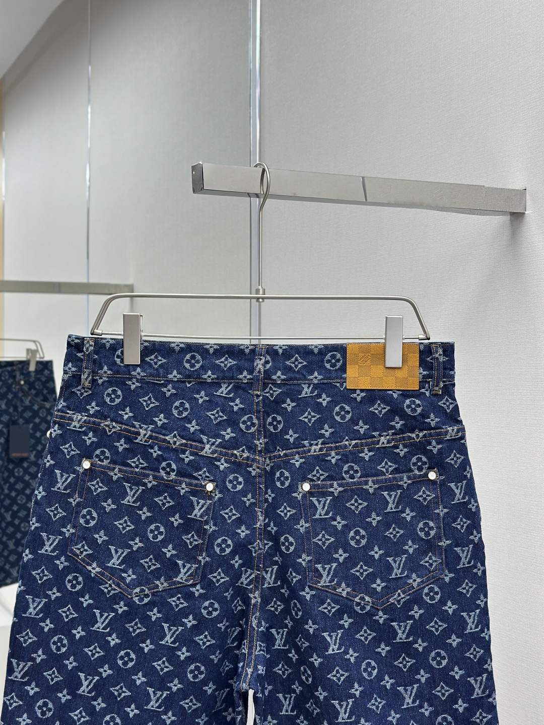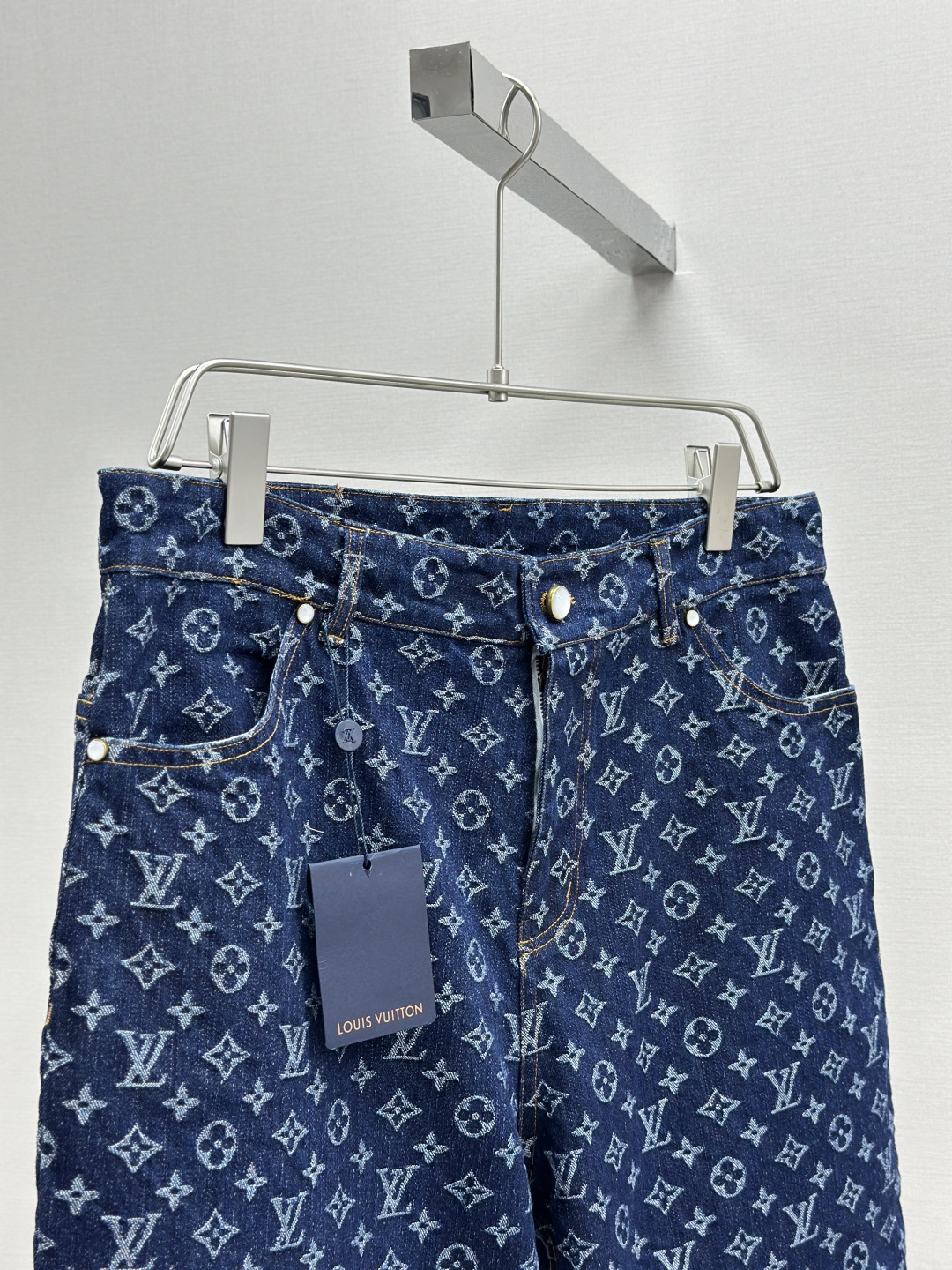 1v 2025ss 春夏新款 重工款提花牛仔短裤 深蓝色洗水牛仔面料 定制白珠刻字纽扣 全新设计辅料纽扣细节 直筒剪裁版型设计 满身经典品牌logo提花效果 腰部做旧植绒皮牌 微宽松版型 尺码:s m l xl