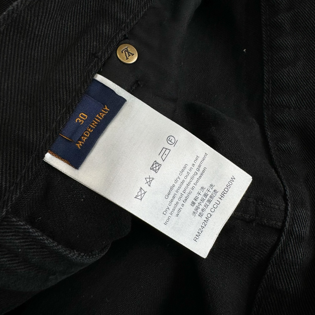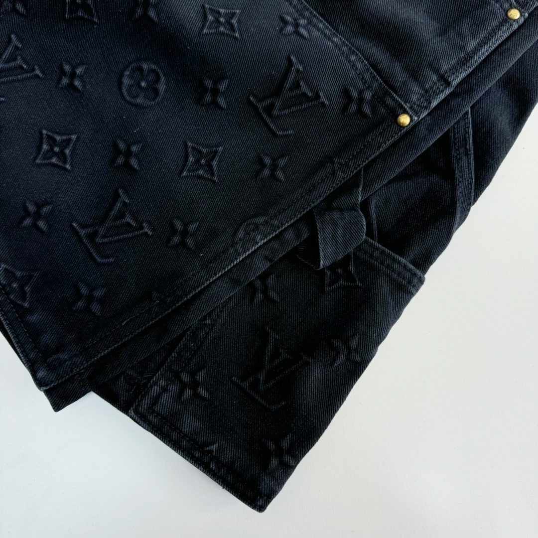 1v 24FW 压花浮雕牛仔短裤 7*7支精梳赛络纺纱做加厚480克斜纹牛仔面料,整体采用Monogram压纹工装元素,拼接结构和尖角口袋压印元素提花细节对位,浮雕压花纹路清晰,口袋双走线做工,线迹细密匀称规整,五处压花均对板开五套铝模,前幅二侧压花根据尺寸每个码开一套模,高温压成型后由人工对每个花型填充硅胶防止凹陷,洗水工艺采用重酵洗炒花色,喷马骝等等多工艺结合。新皮革贴饰配有品牌草写刻纹方定钉直筒下摆设计,隐藏式拉链门襟,辅料五金全部定制对版古铜做旧颜色size:30/32/34/36