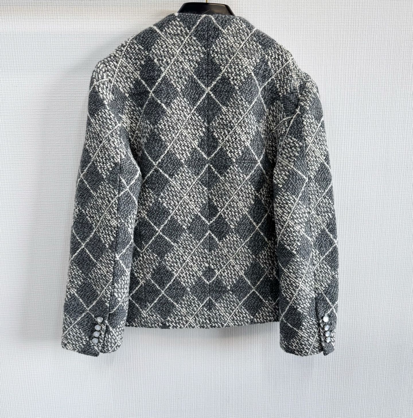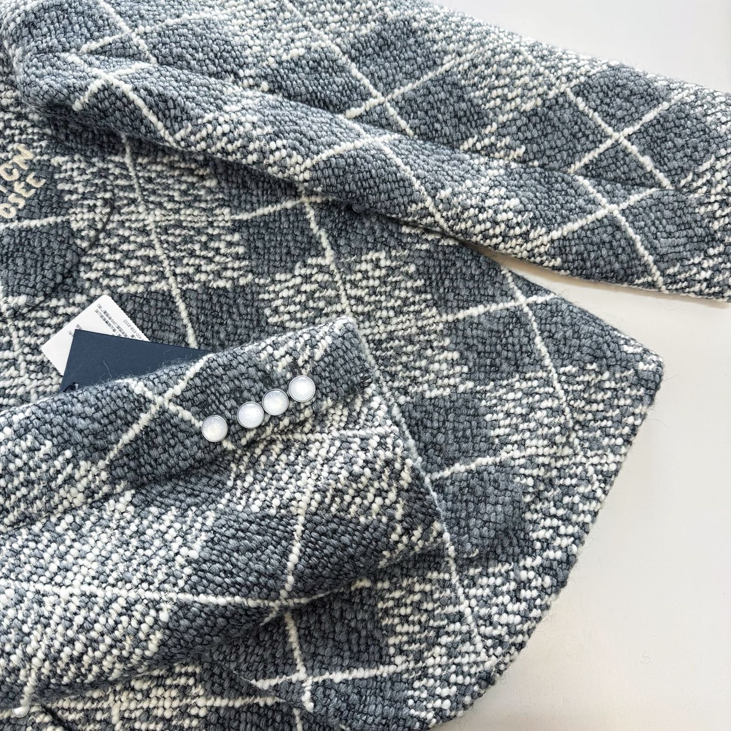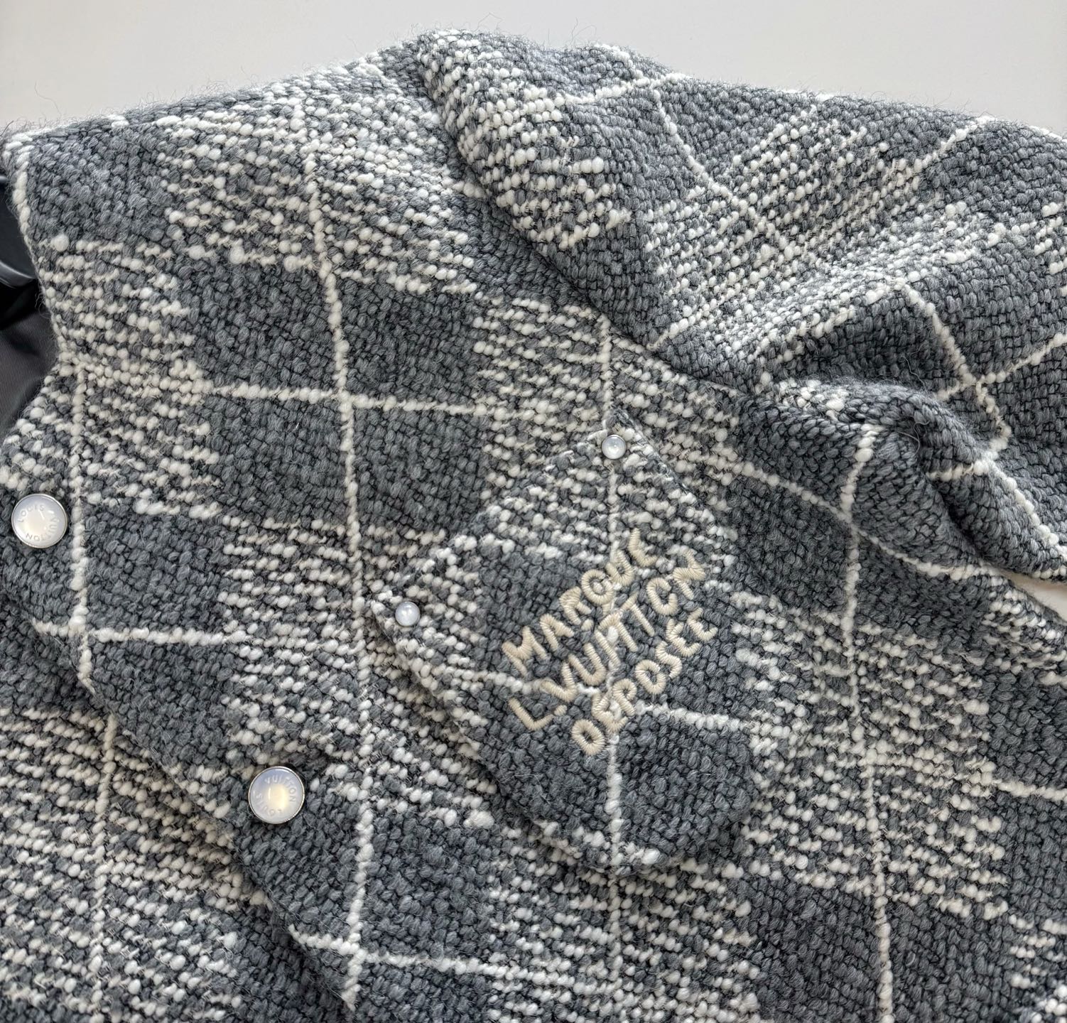 1v 24fw 羊毛粗花呢外套 羊毛粗花呢色织面料,定制特种经纱盘头 12公支两种规格两种颜色羊毛纱线,采用三角有光锦纶丝,S向加捻纬纱制成特种纱线,高速剑杆机色织出成品布,前幅采用格子居中还原花,三个口袋也是还原花手工剪裁,小口袋采用特种毛线绣花机刺绣,双线榻榻米斜向绣法,人造丝斜纹缎面里布,工字扣+铆钉均,挂镀古银色底托,内里镶嵌抛光高亮珍珠母贝,贝壳采用激光雕刻字母图案,后中配白金色挂衣链条size:44/46/48/50