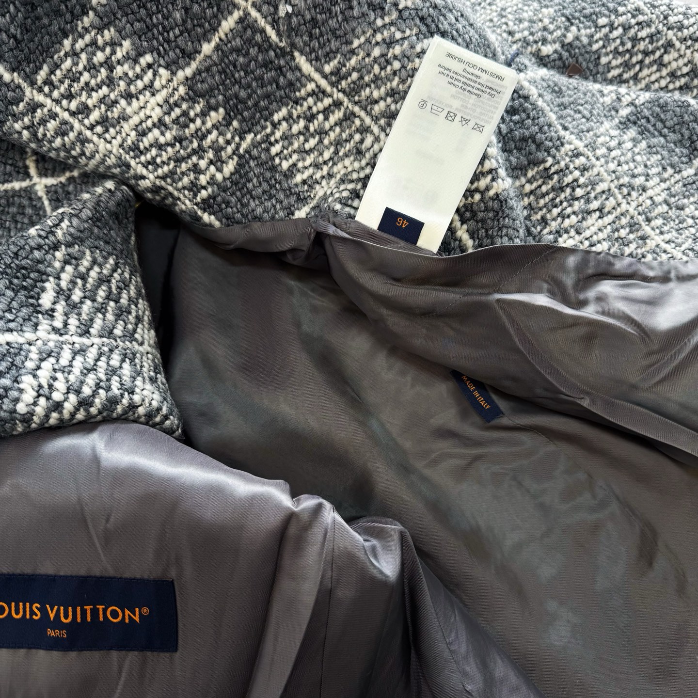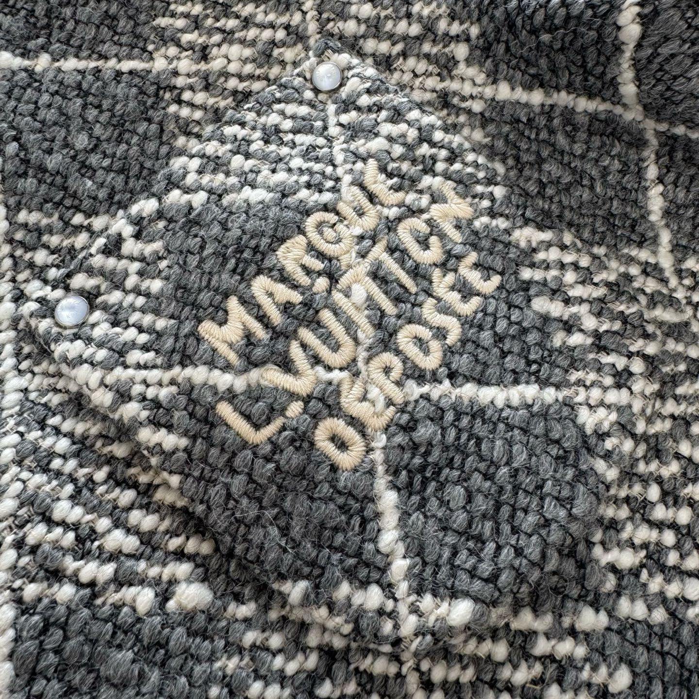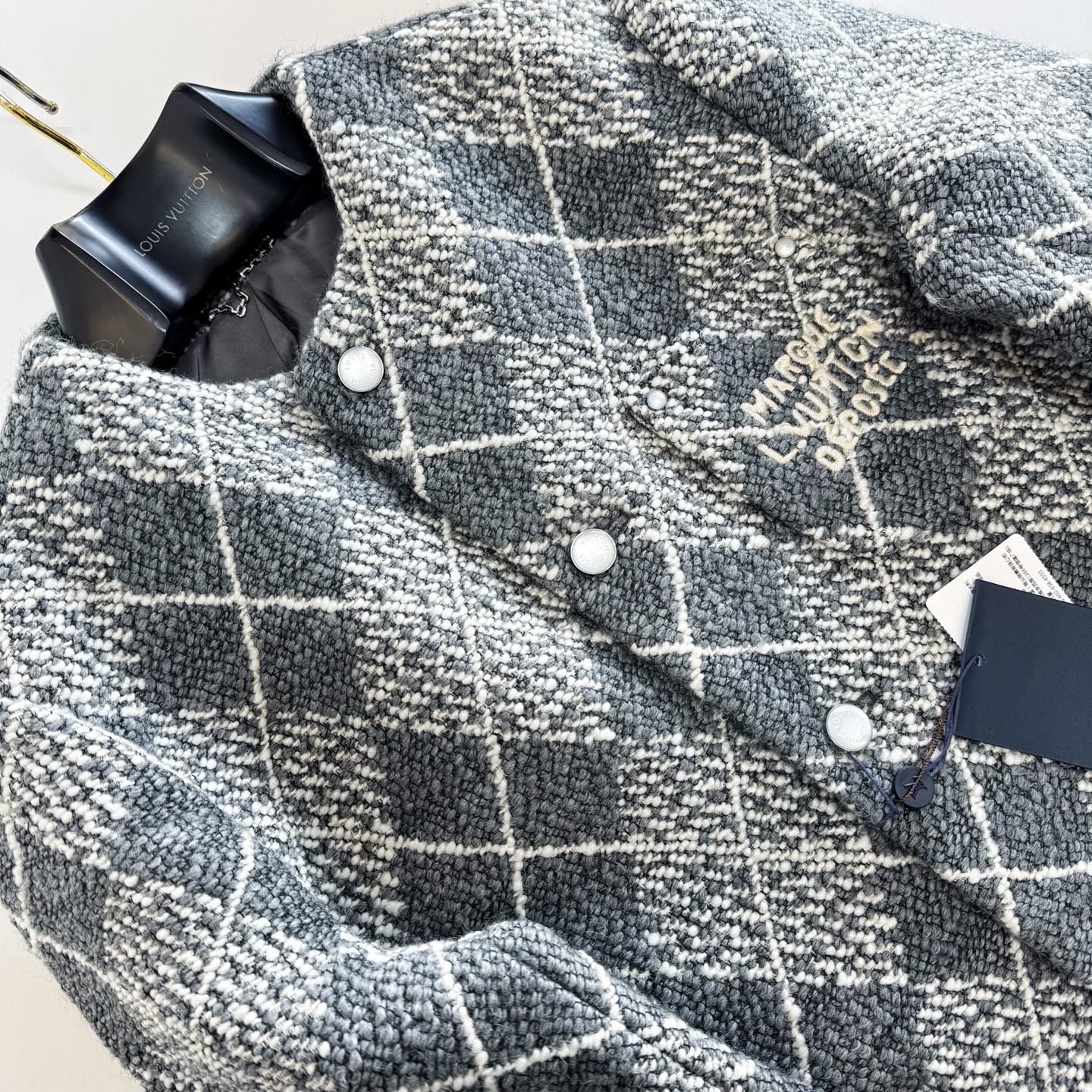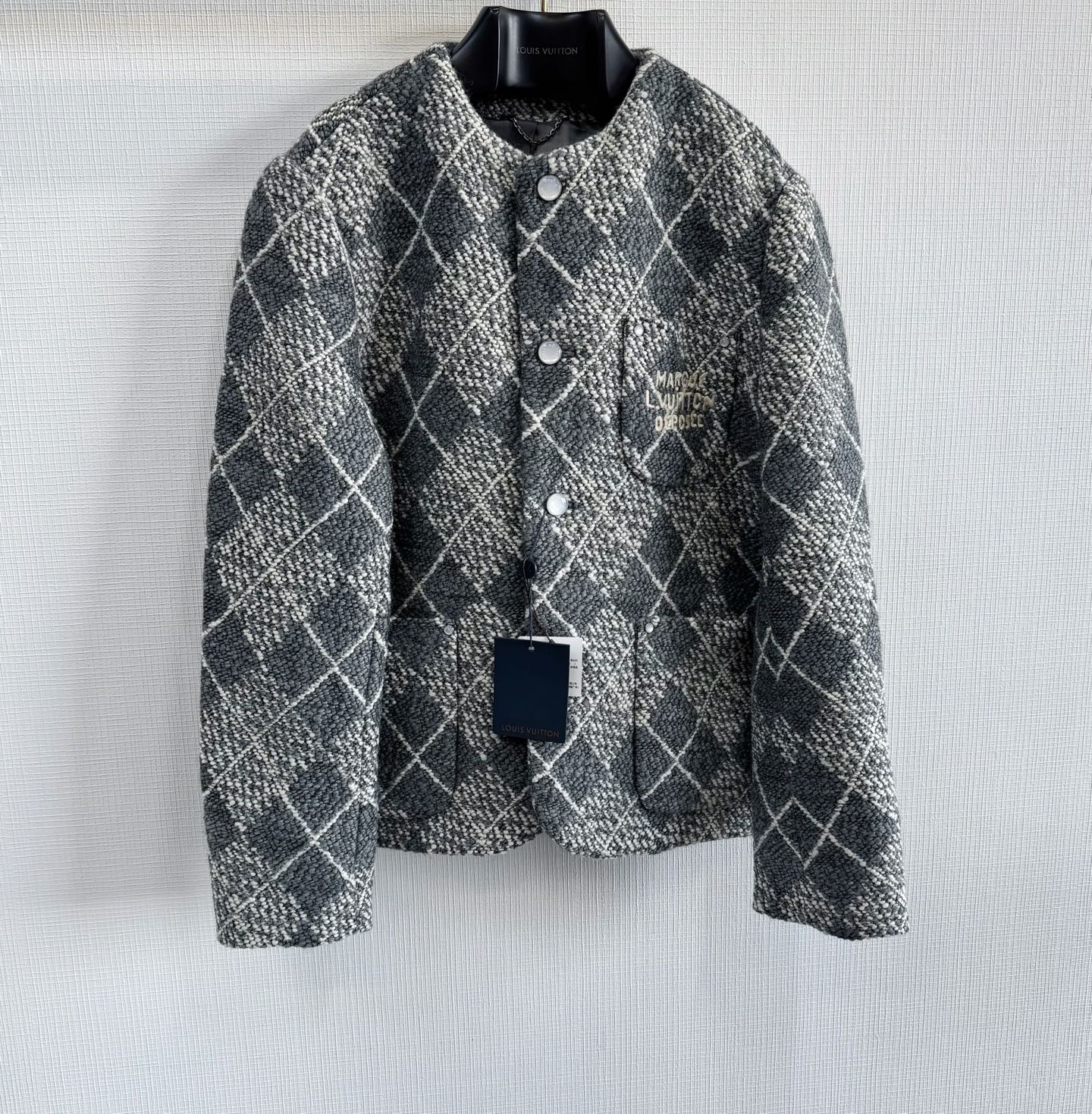 1v 24fw 羊毛粗花呢外套 羊毛粗花呢色织面料,定制特种经纱盘头 12公支两种规格两种颜色羊毛纱线,采用三角有光锦纶丝,S向加捻纬纱制成特种纱线,高速剑杆机色织出成品布,前幅采用格子居中还原花,三个口袋也是还原花手工剪裁,小口袋采用特种毛线绣花机刺绣,双线榻榻米斜向绣法,人造丝斜纹缎面里布,工字扣+铆钉均,挂镀古银色底托,内里镶嵌抛光高亮珍珠母贝,贝壳采用激光雕刻字母图案,后中配白金色挂衣链条size:44/46/48/50