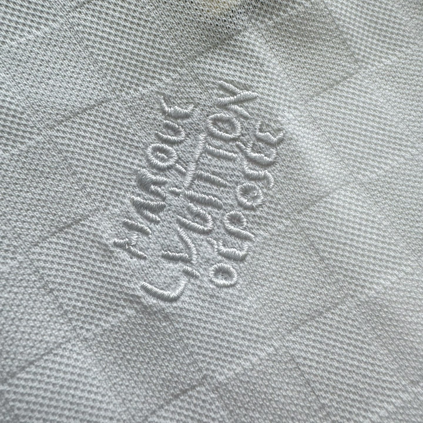 两根双股纱线并织,18针单面提花机织造胚布,打版放匹样测试花型缩率,确保大货洗水定型后花型完全对版,前幅采用日本进口田岛绣花机刺绣,棉质绣花线平绣堆线绣法,字母立体饱满,全件定位对花缝纫工艺,对花剪裁,成衣棋盘格呈现整齐排序,size:xs/s/m/l